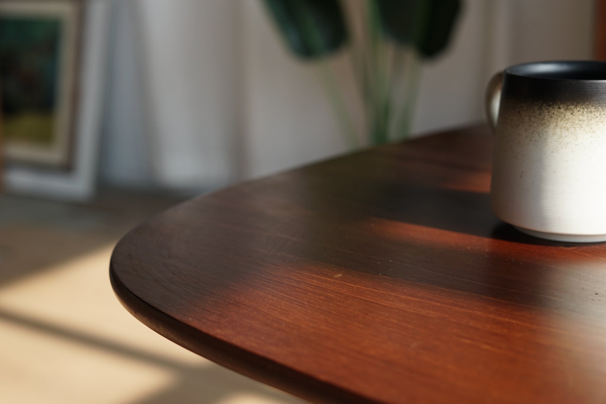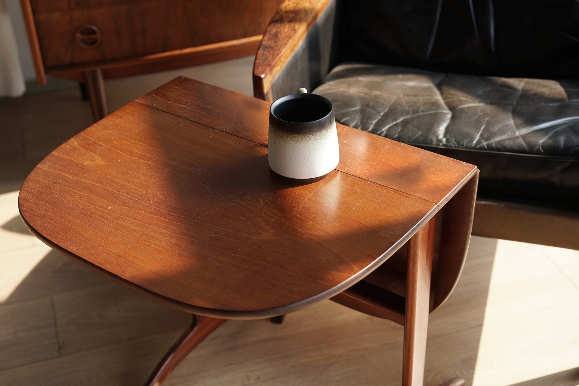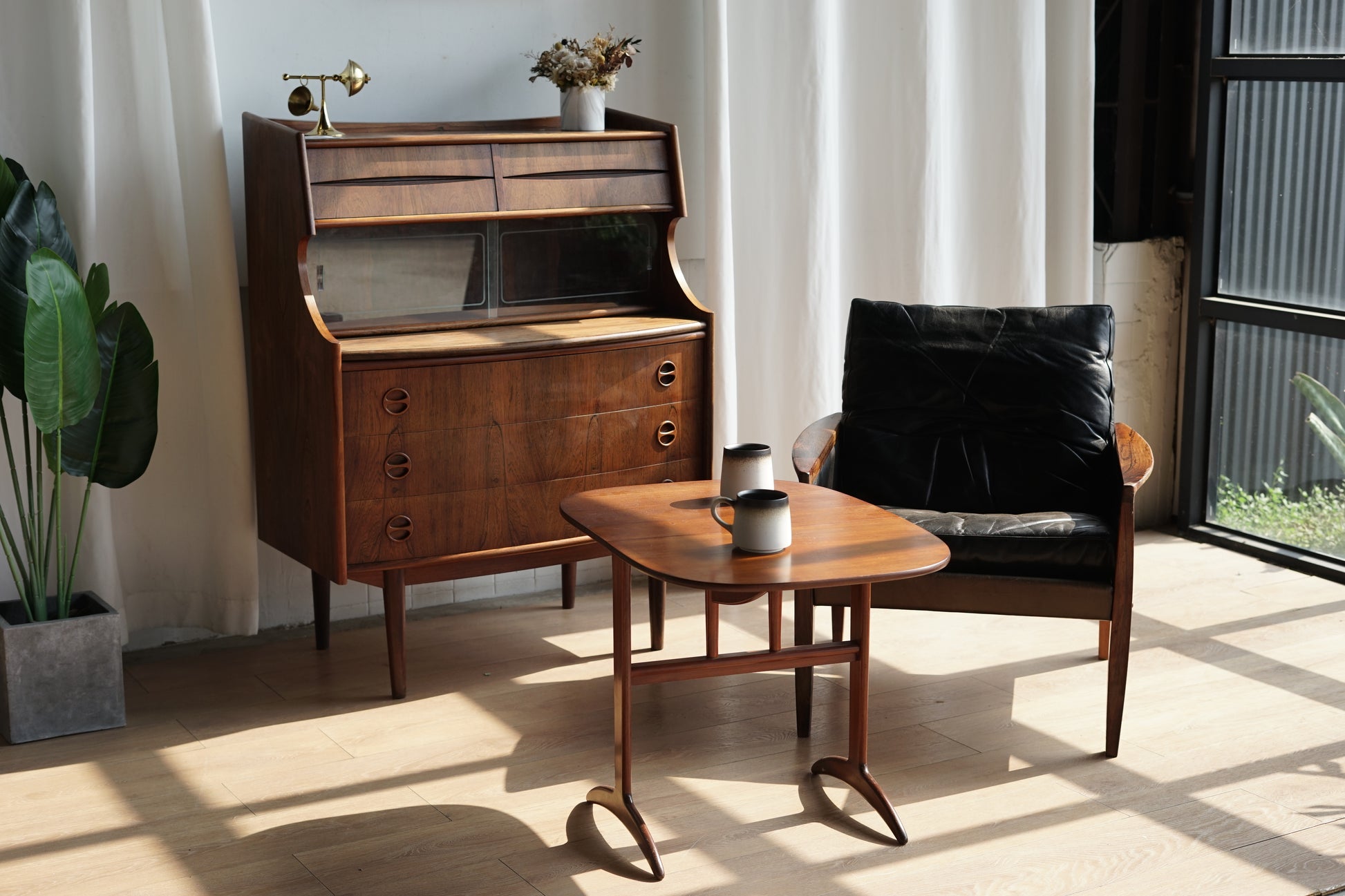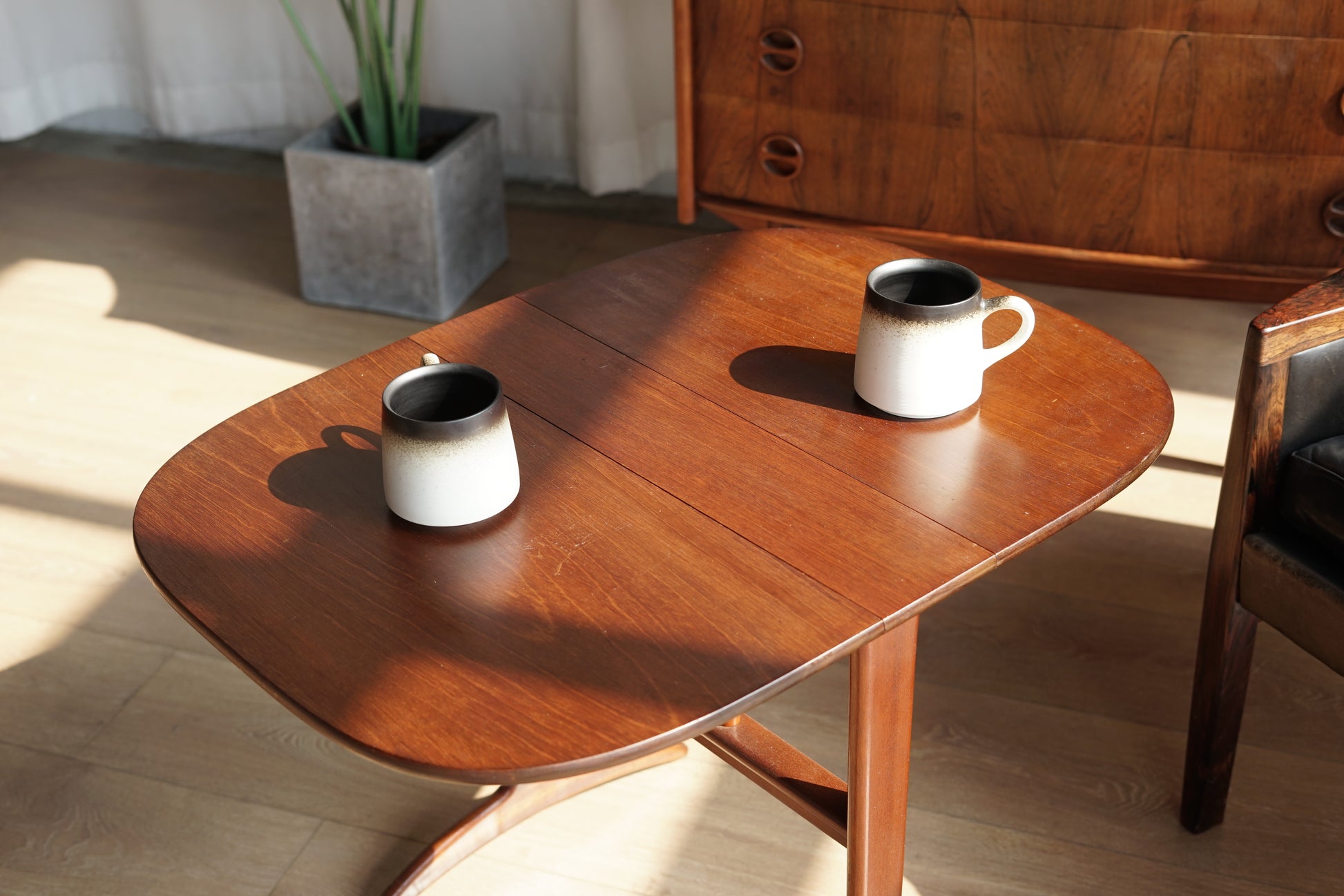 雙側翻板設計,收合為窄形邊几、展開為圓角長方;桌下拱形橫撐搭配外八圓柱腳,比例輕巧穩固。