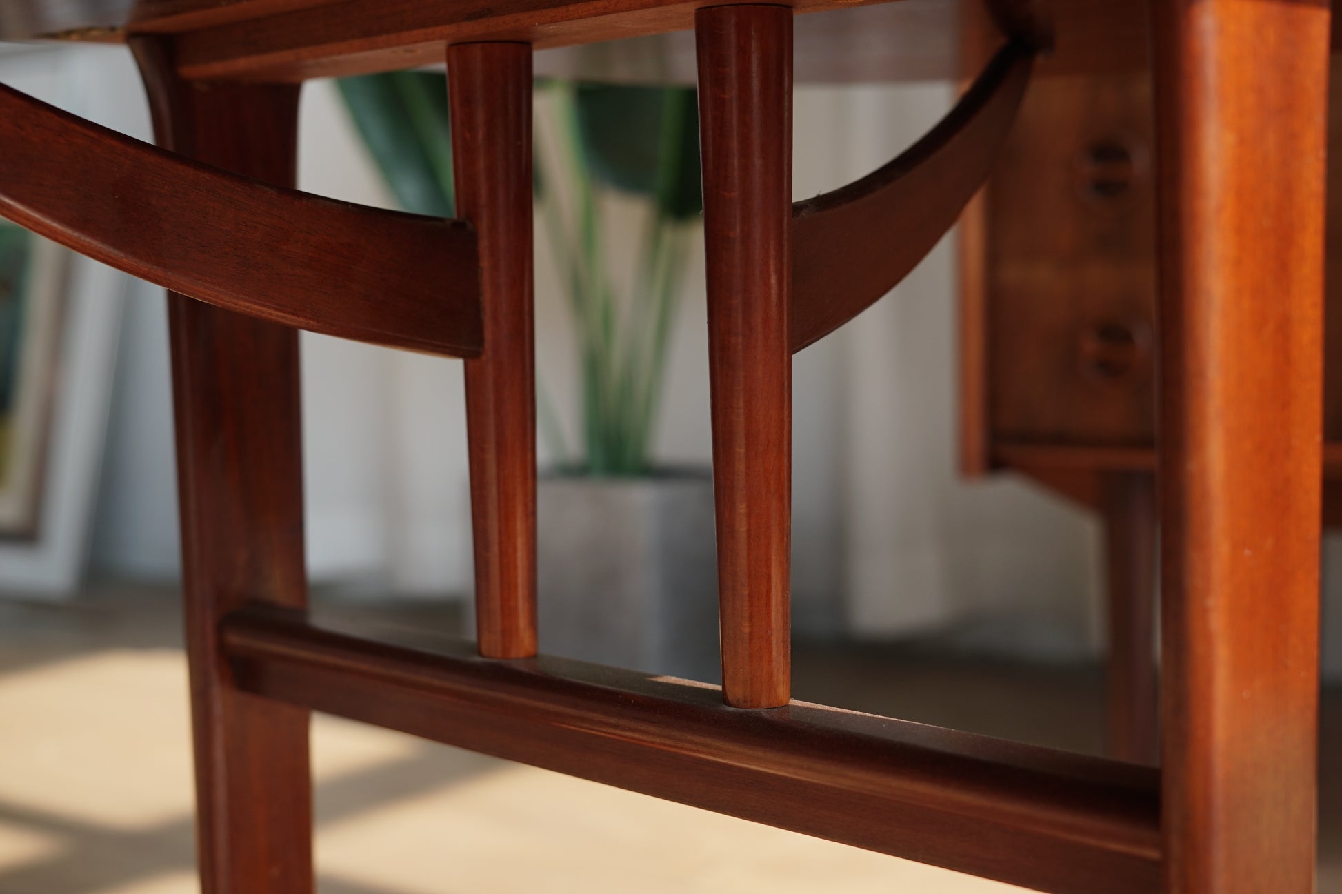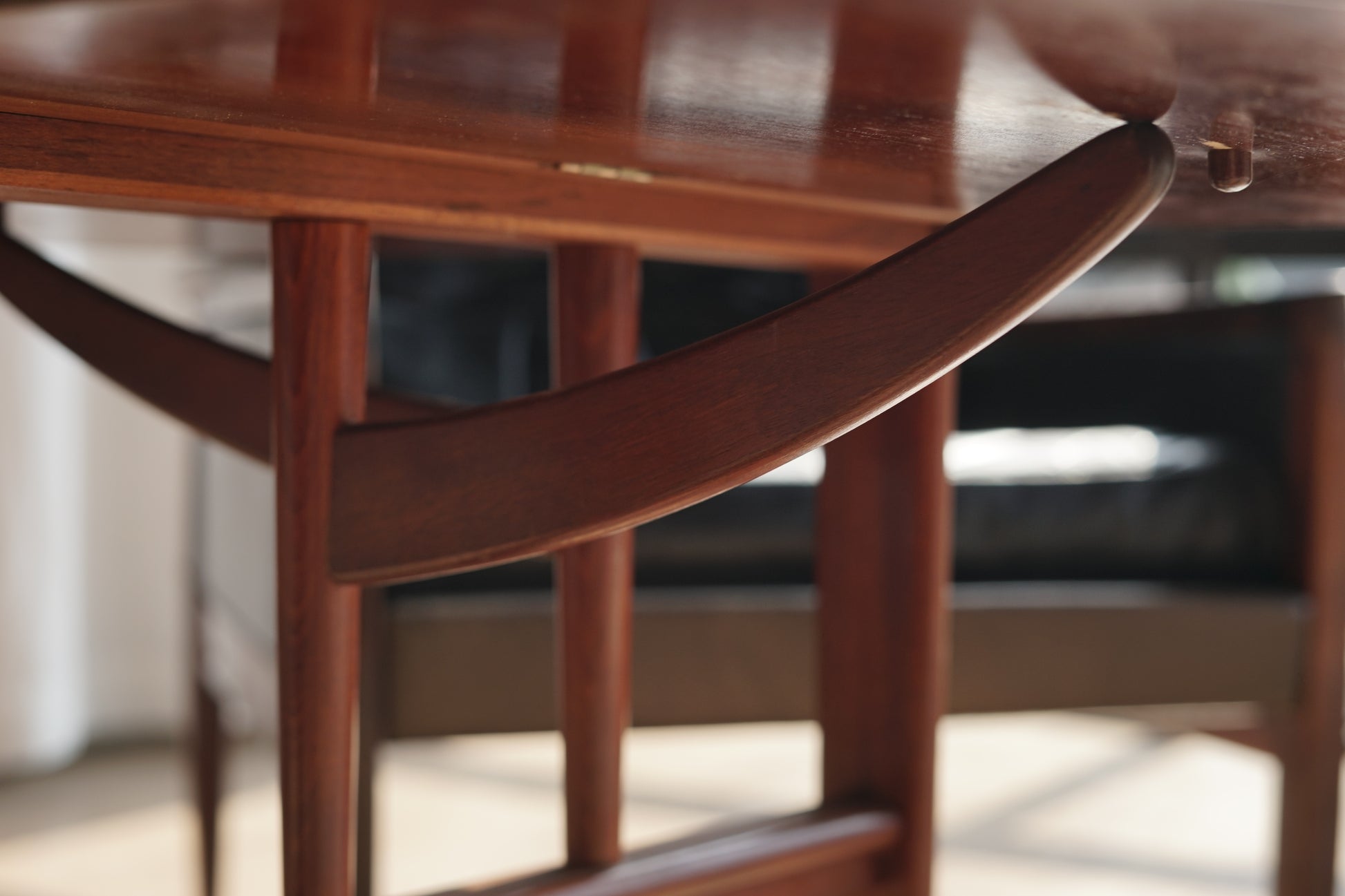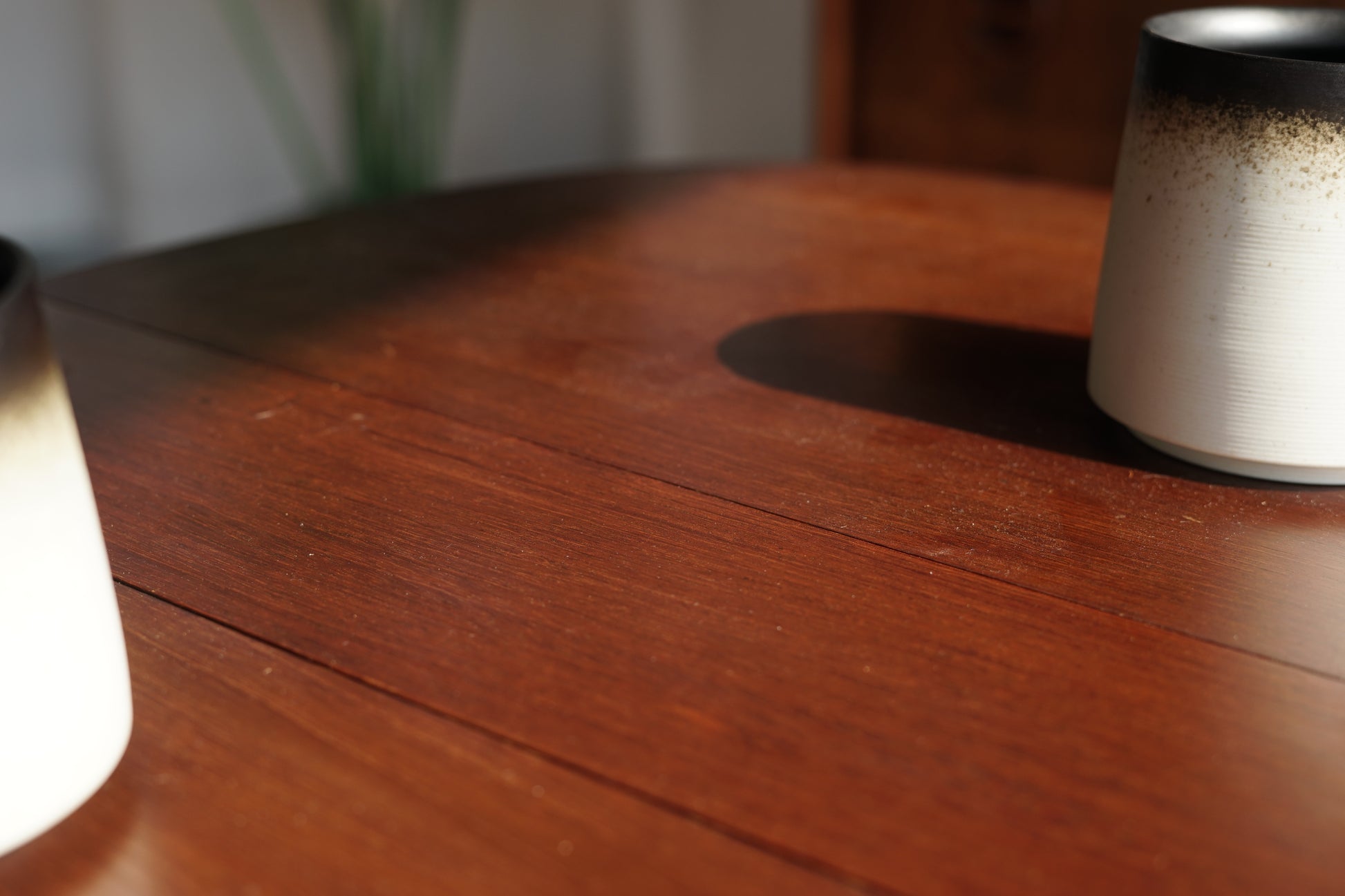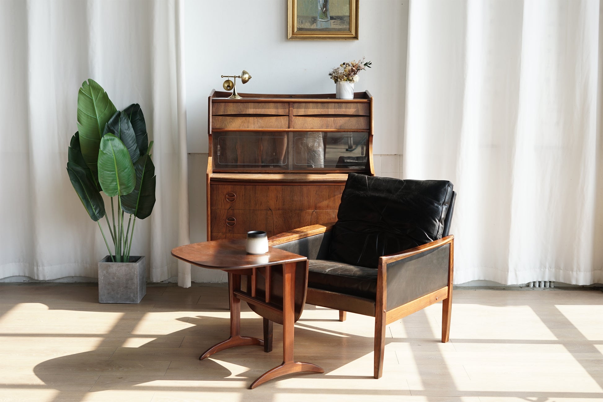 雙側翻板設計,收合為窄形邊几、展開為圓角長方;桌下拱形橫撐搭配外八圓柱腳,比例輕巧穩固。