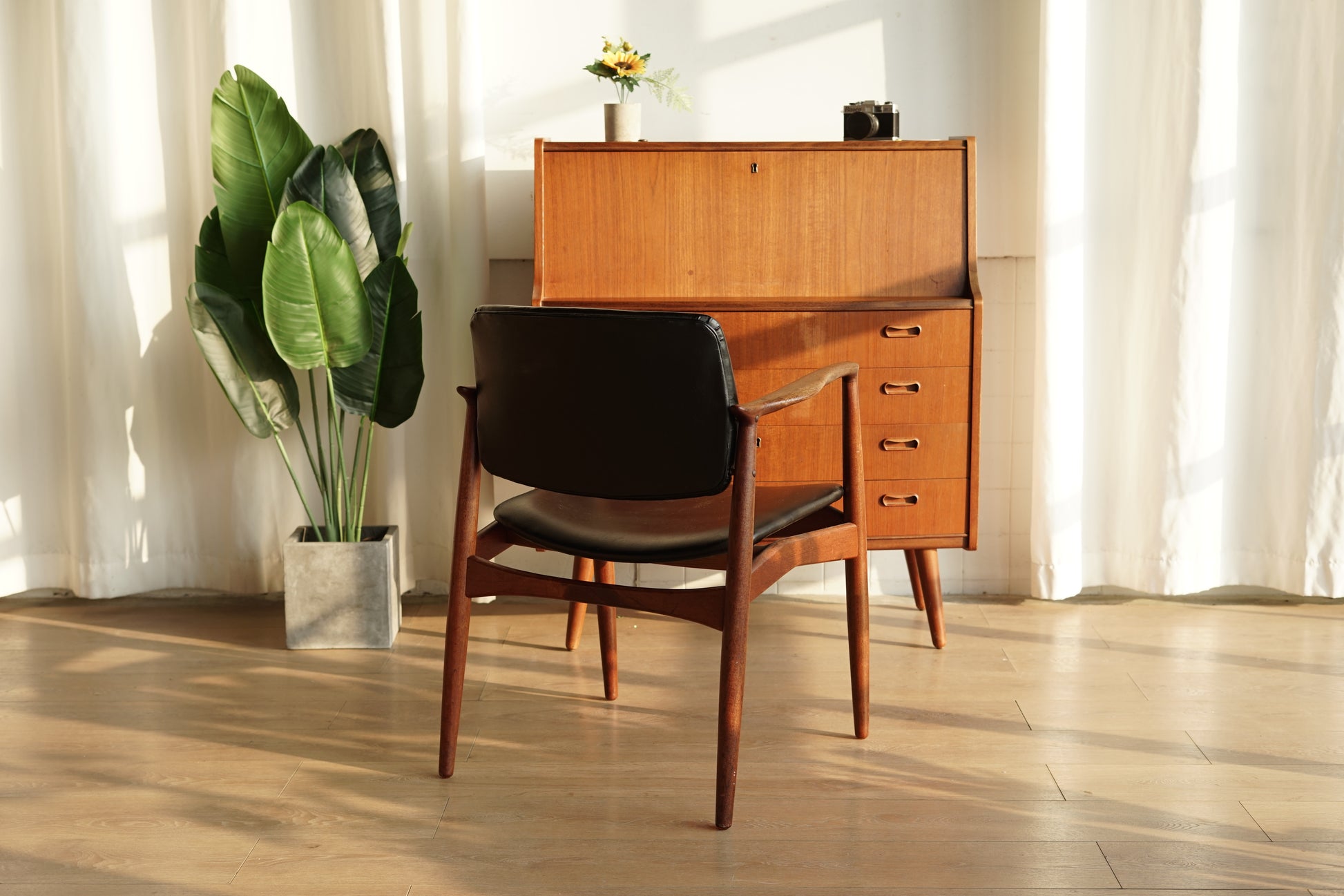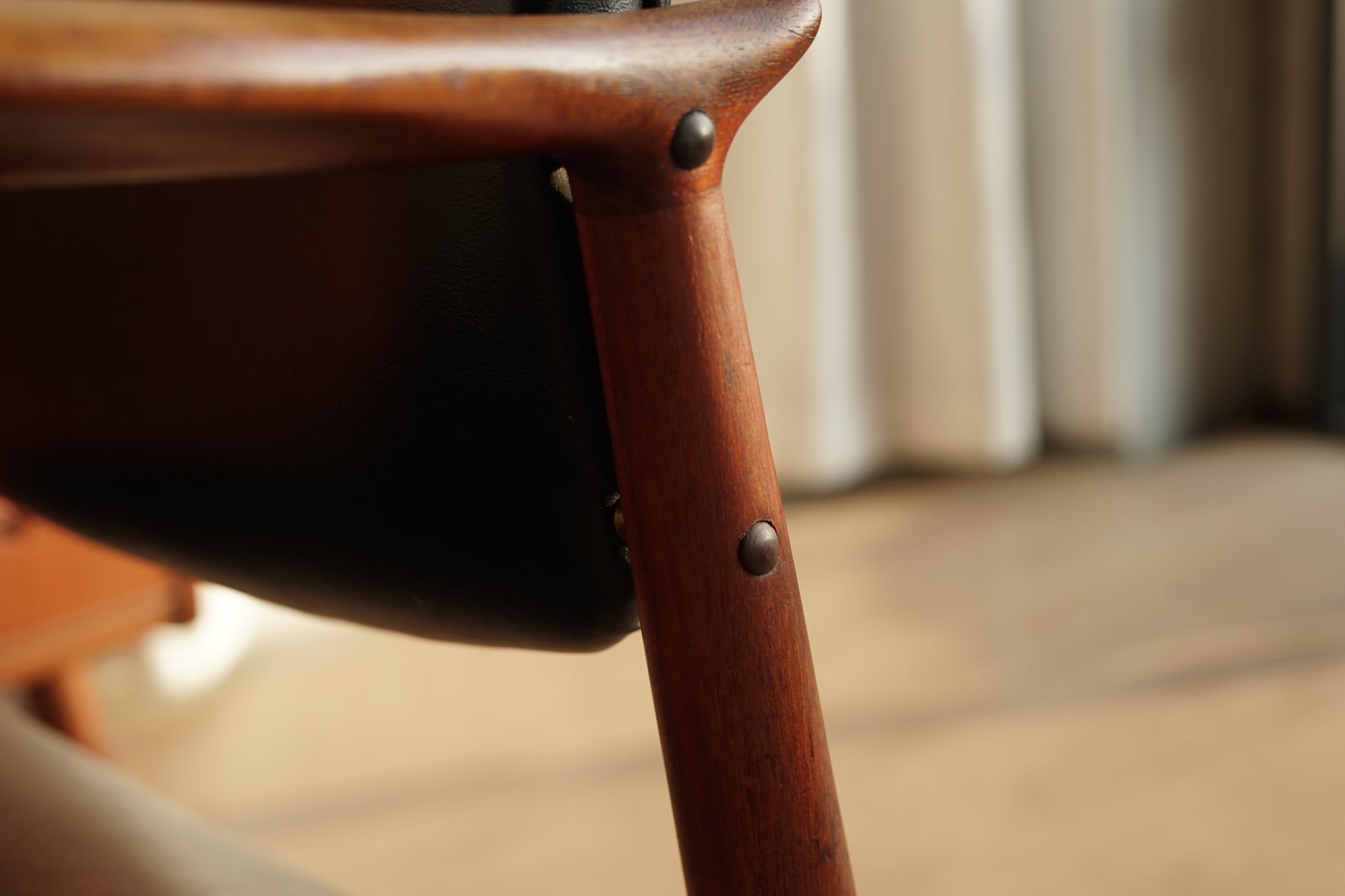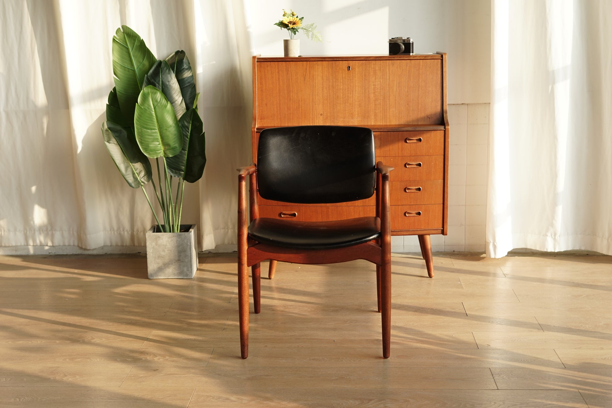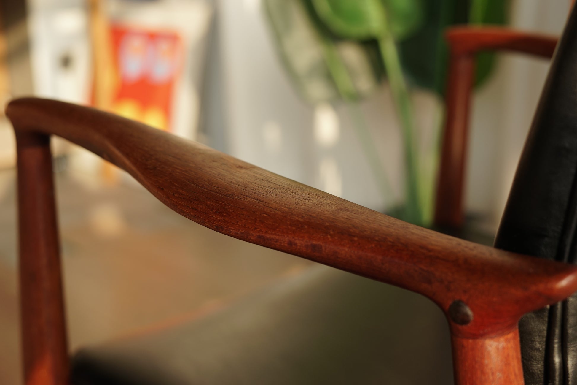 柚木實木框架,圓錐狀車削腿與向後傾的後腳,線條細長;前橫檔有削薄弧面。黑色皮革座、背為獨立墊件,背墊寬且微弧,搭配圓角實木扶手,乘坐包覆感佳;坐面後低前高,形成自然後仰的人體工學。
