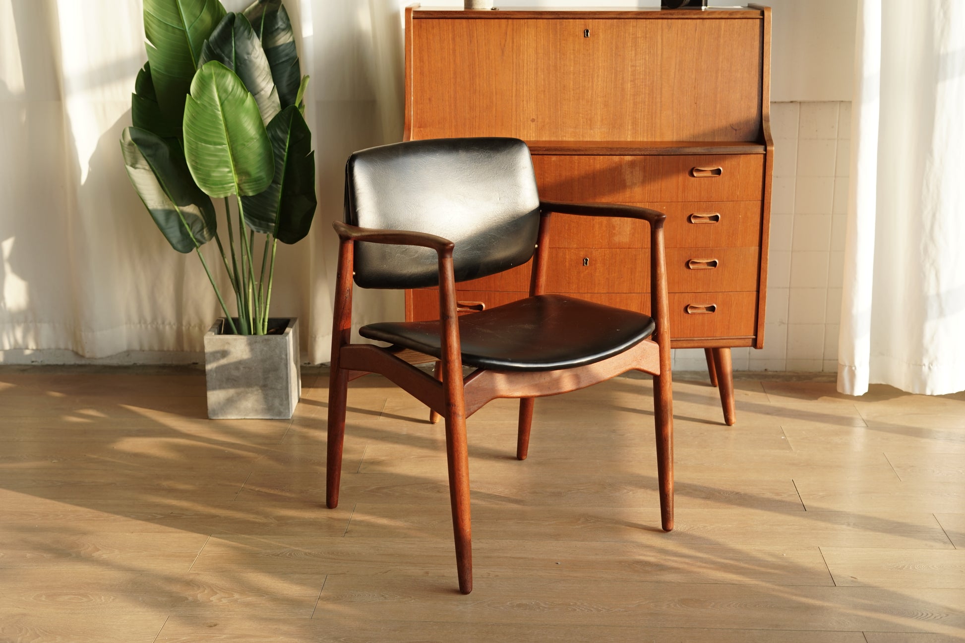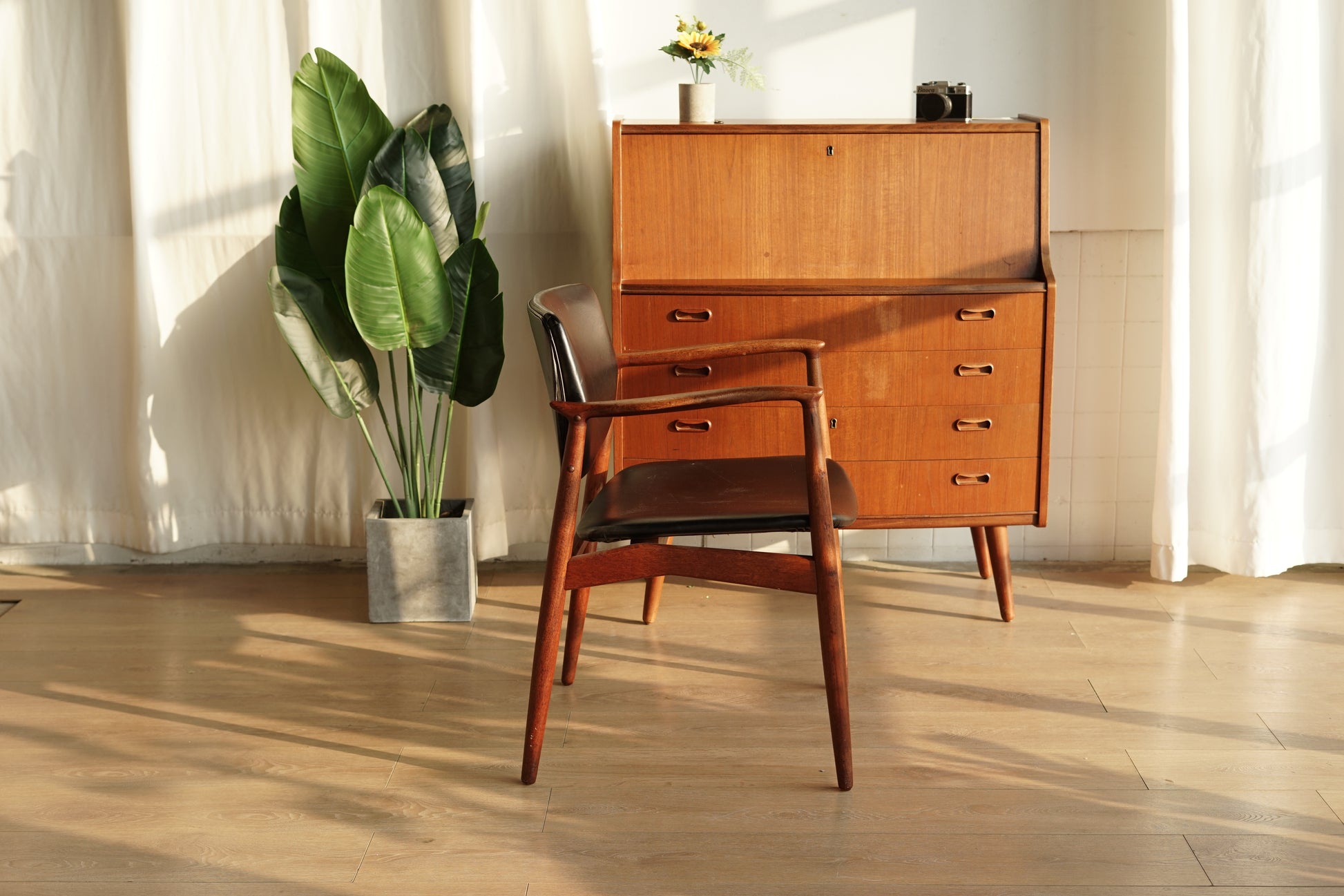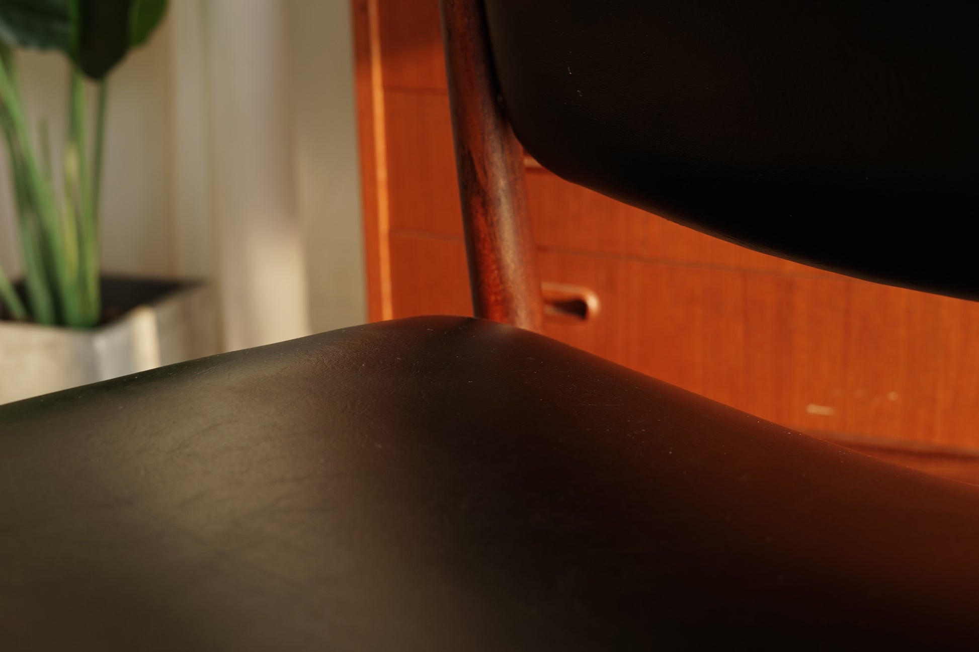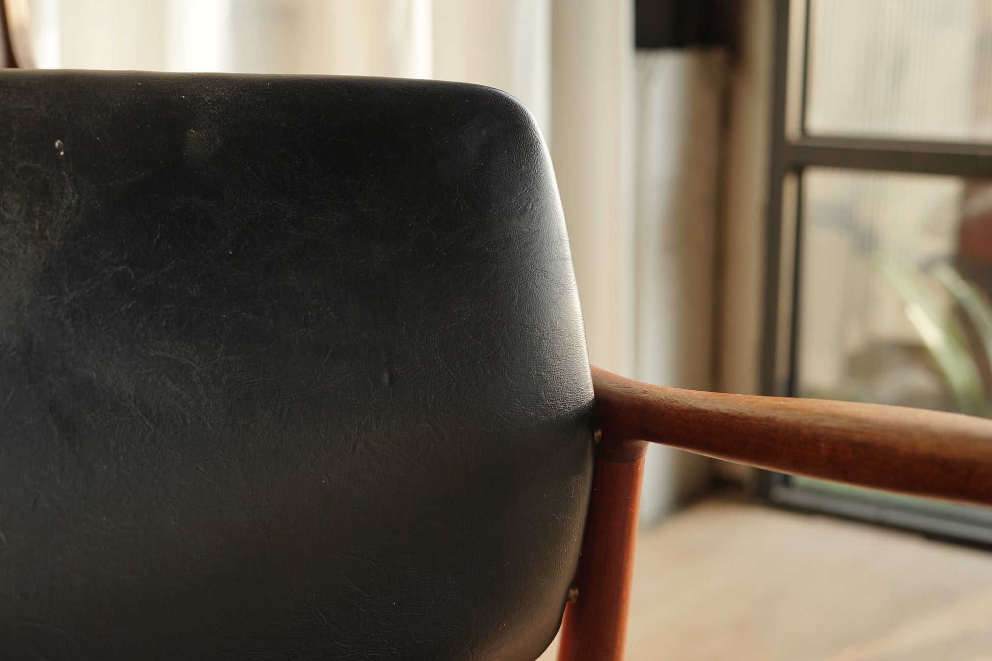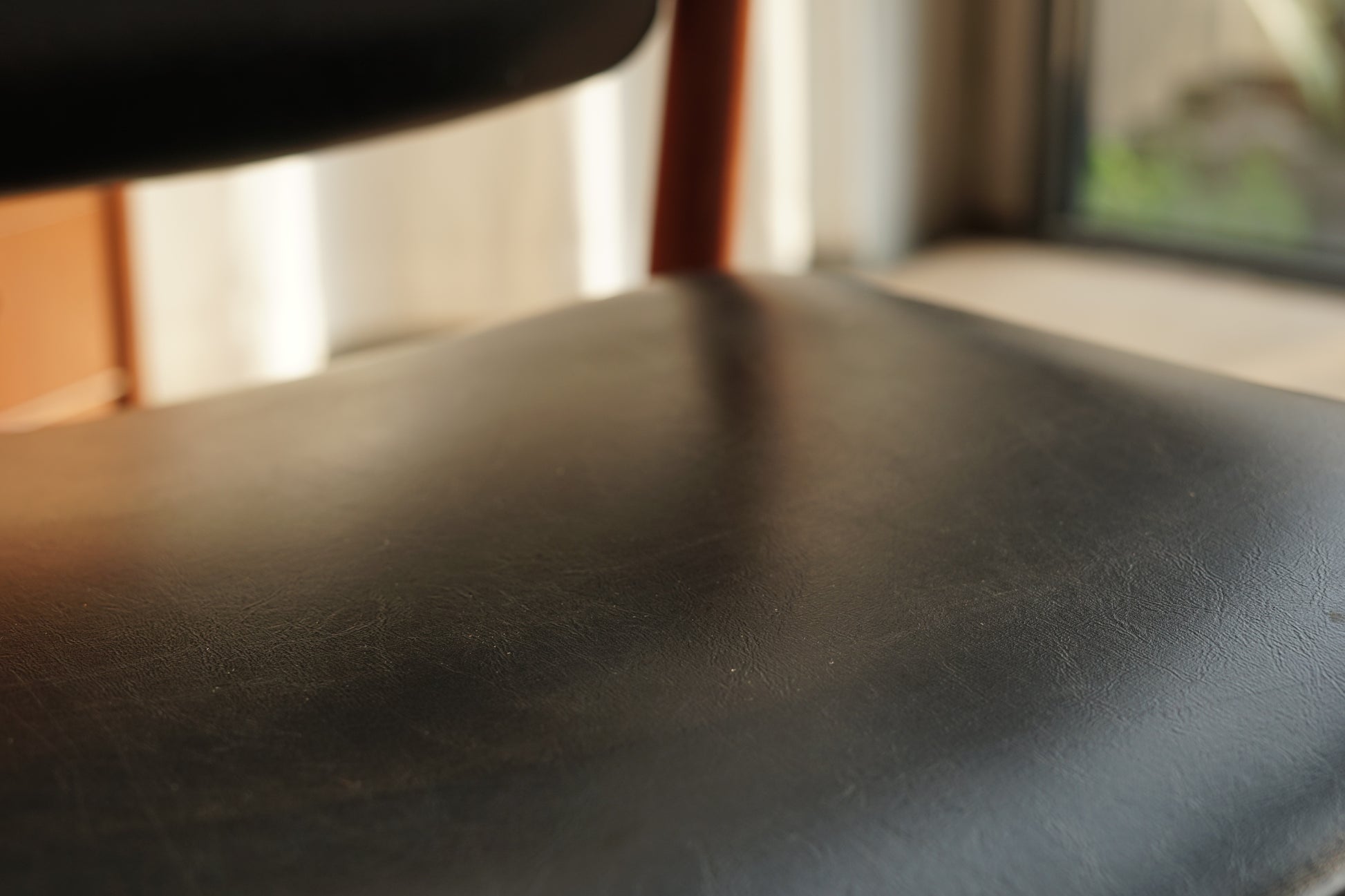 柚木實木框架,圓錐狀車削腿與向後傾的後腳,線條細長;前橫檔有削薄弧面。黑色皮革座、背為獨立墊件,背墊寬且微弧,搭配圓角實木扶手,乘坐包覆感佳;坐面後低前高,形成自然後仰的人體工學。