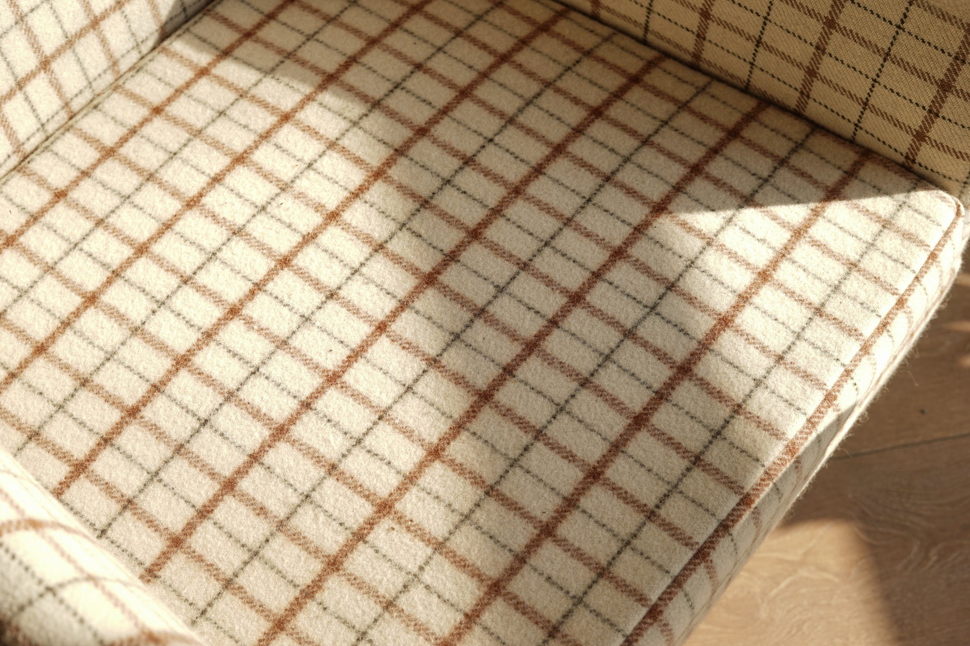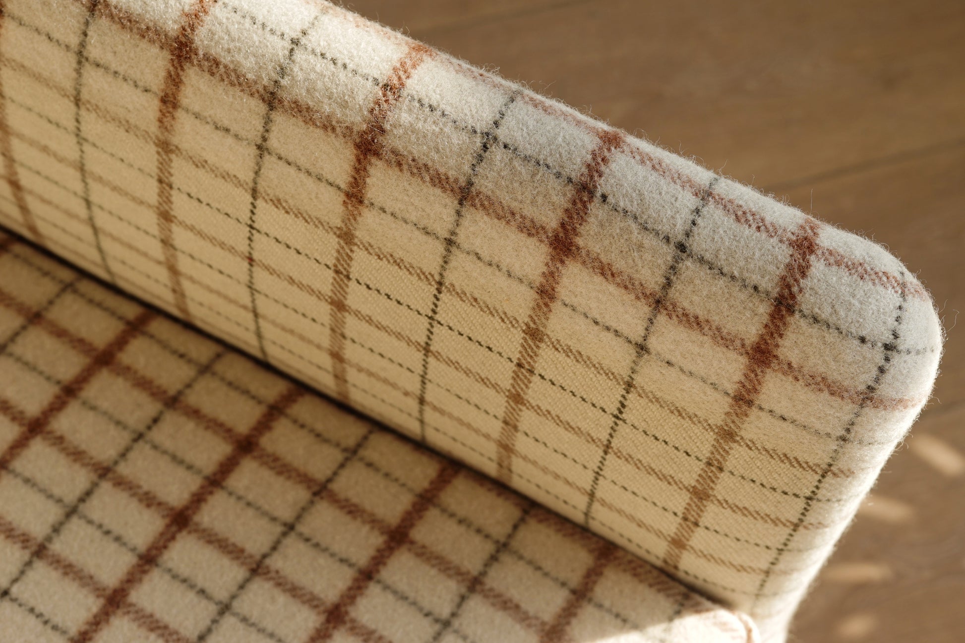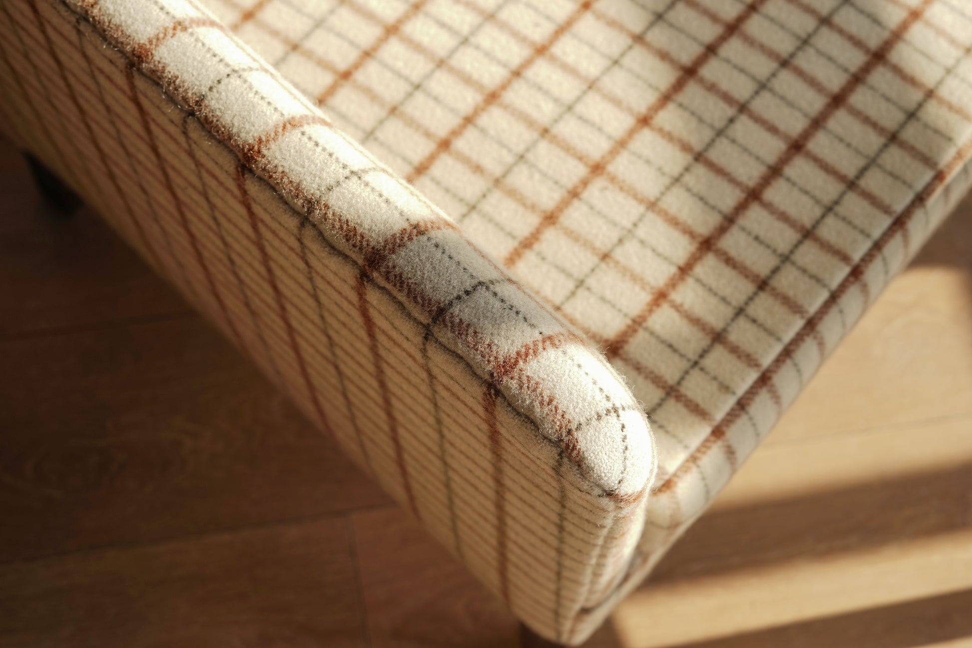 全椅以米白底搭配咖啡、墨灰格紋羊毛布包覆,帶有濃濃北歐冬季毛呢氛圍,視覺溫暖又有質感。椅身線條俐落不笨重,窄扶手與細長實木椅腳讓整體顯得輕盈,放在客廳一角或窗邊閱讀區都很好搭配。