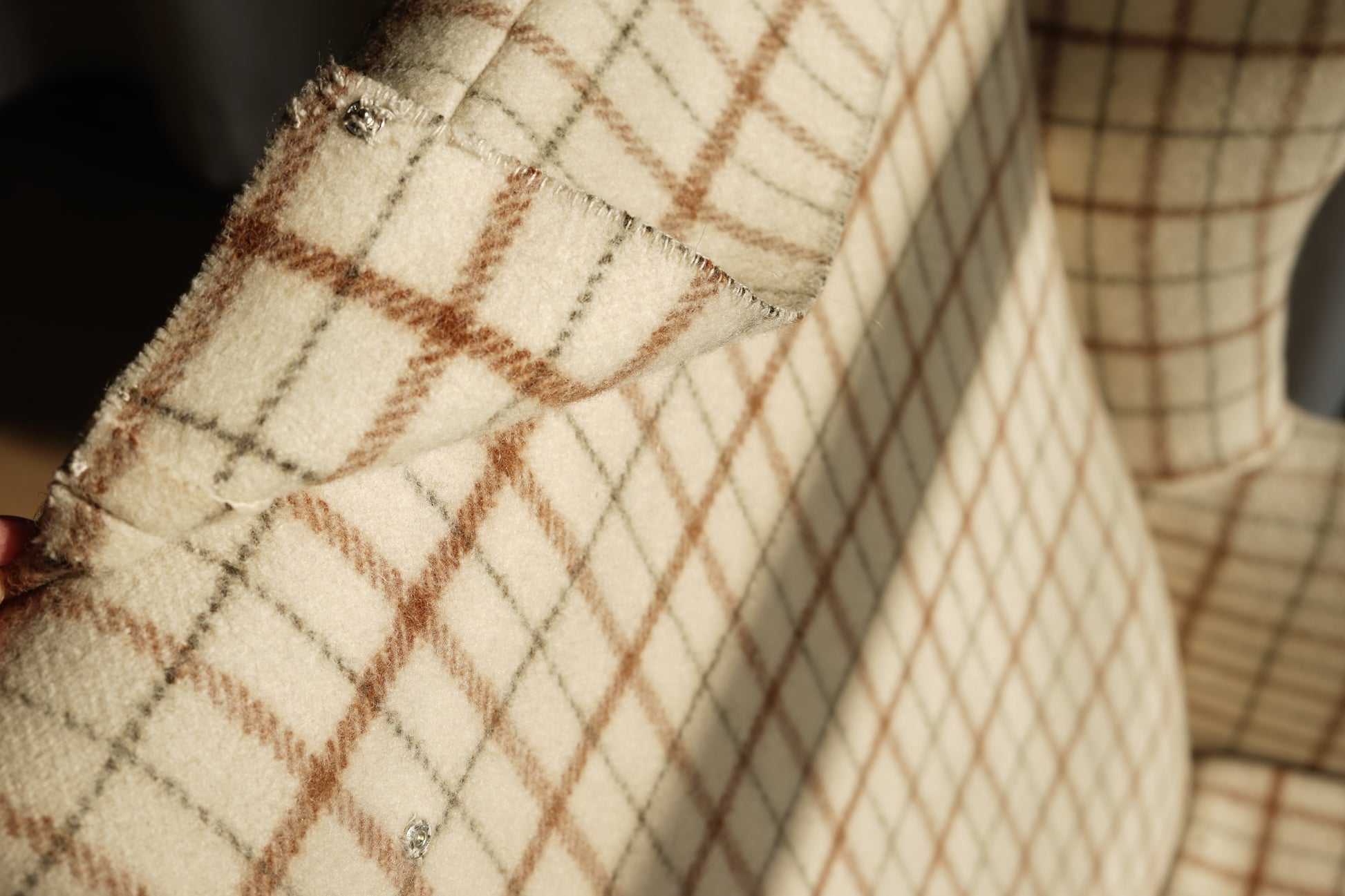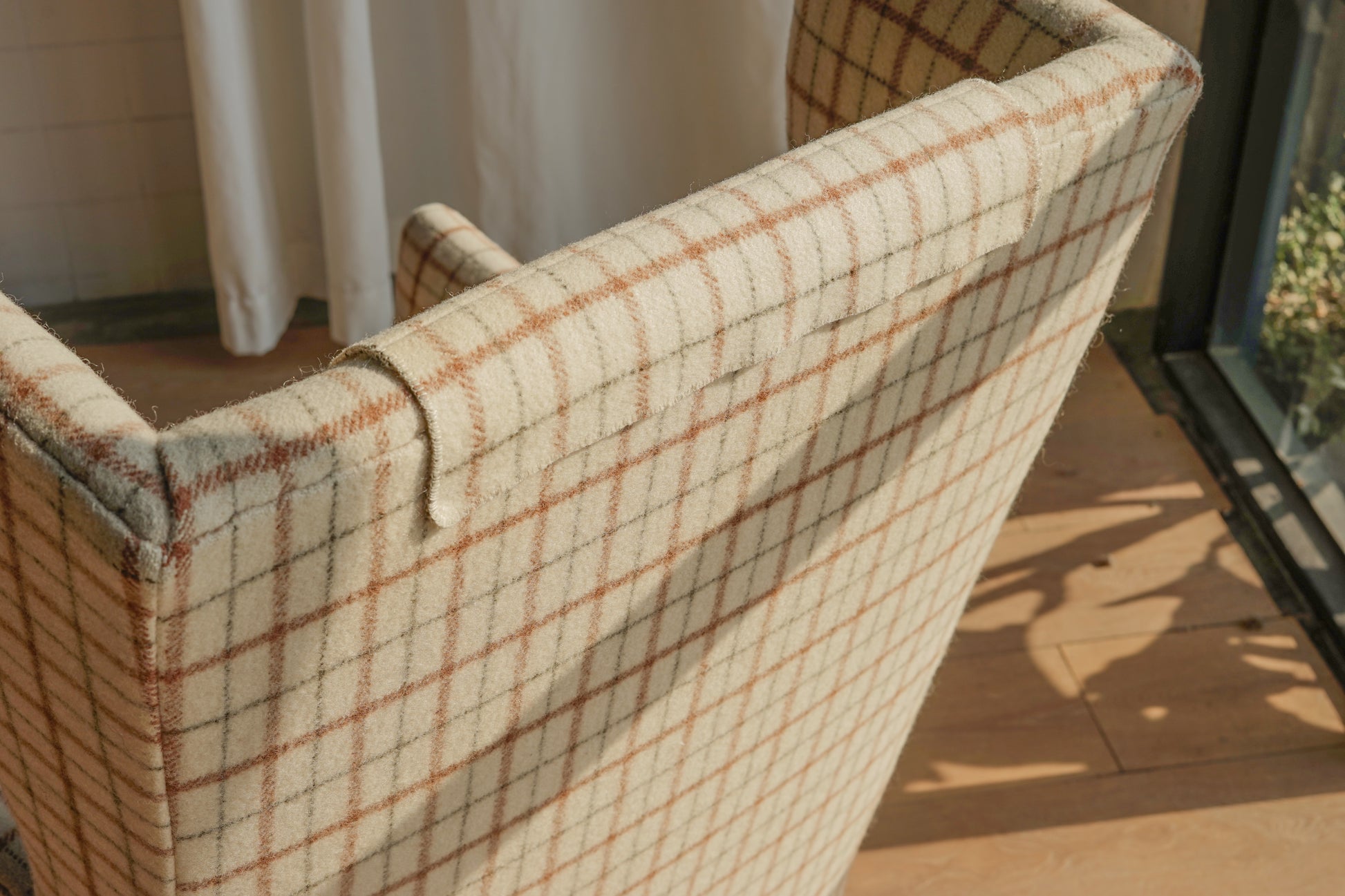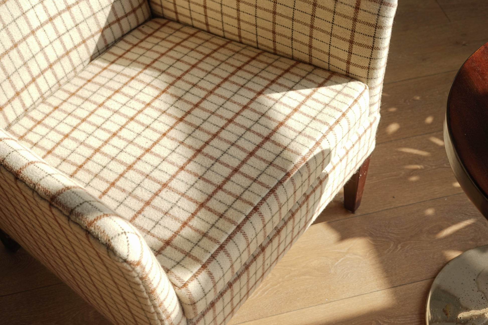 全椅以米白底搭配咖啡、墨灰格紋羊毛布包覆,帶有濃濃北歐冬季毛呢氛圍,視覺溫暖又有質感。椅身線條俐落不笨重,窄扶手與細長實木椅腳讓整體顯得輕盈,放在客廳一角或窗邊閱讀區都很好搭配。