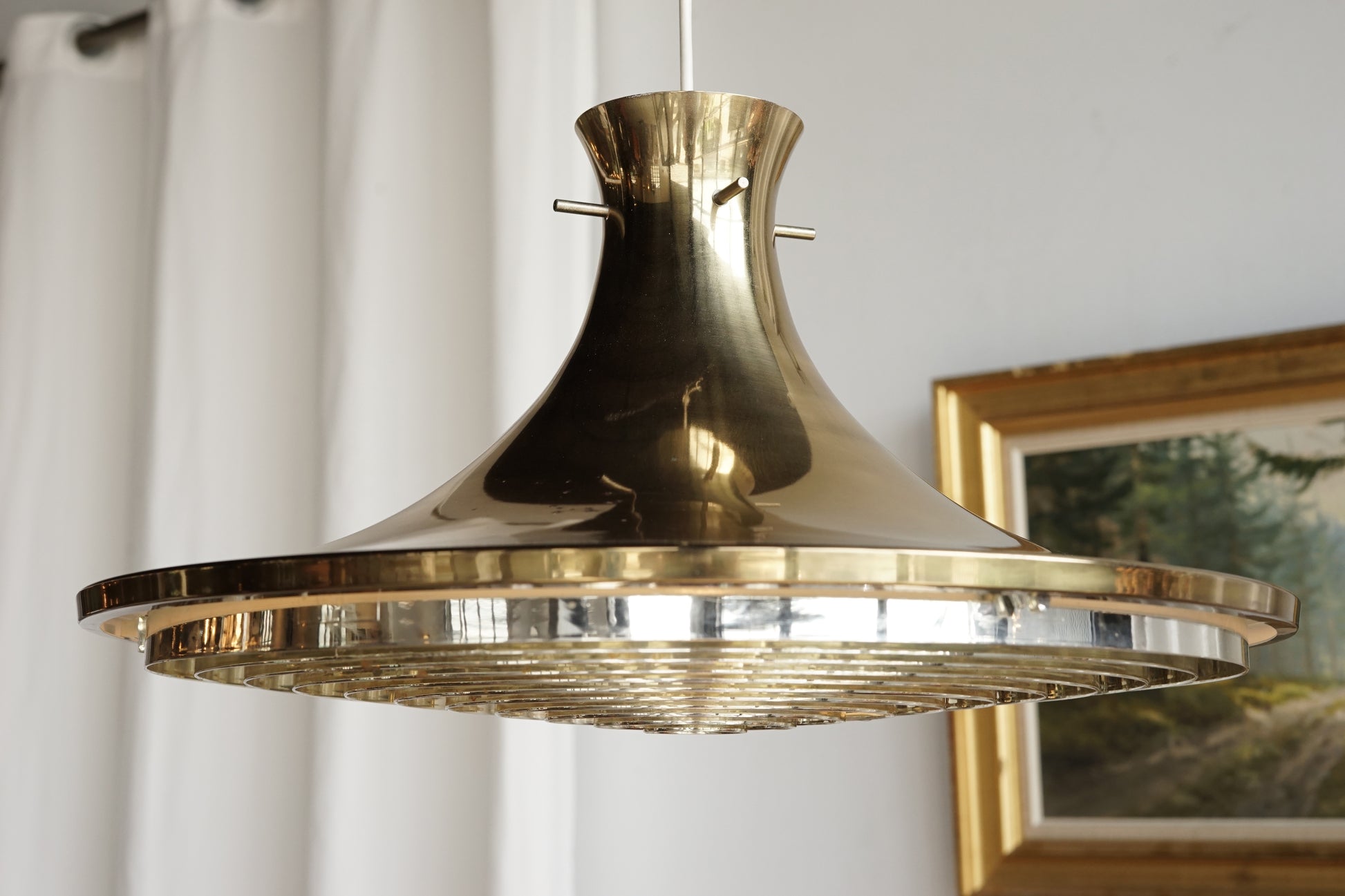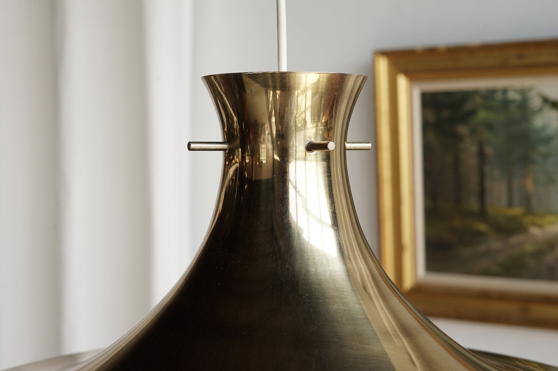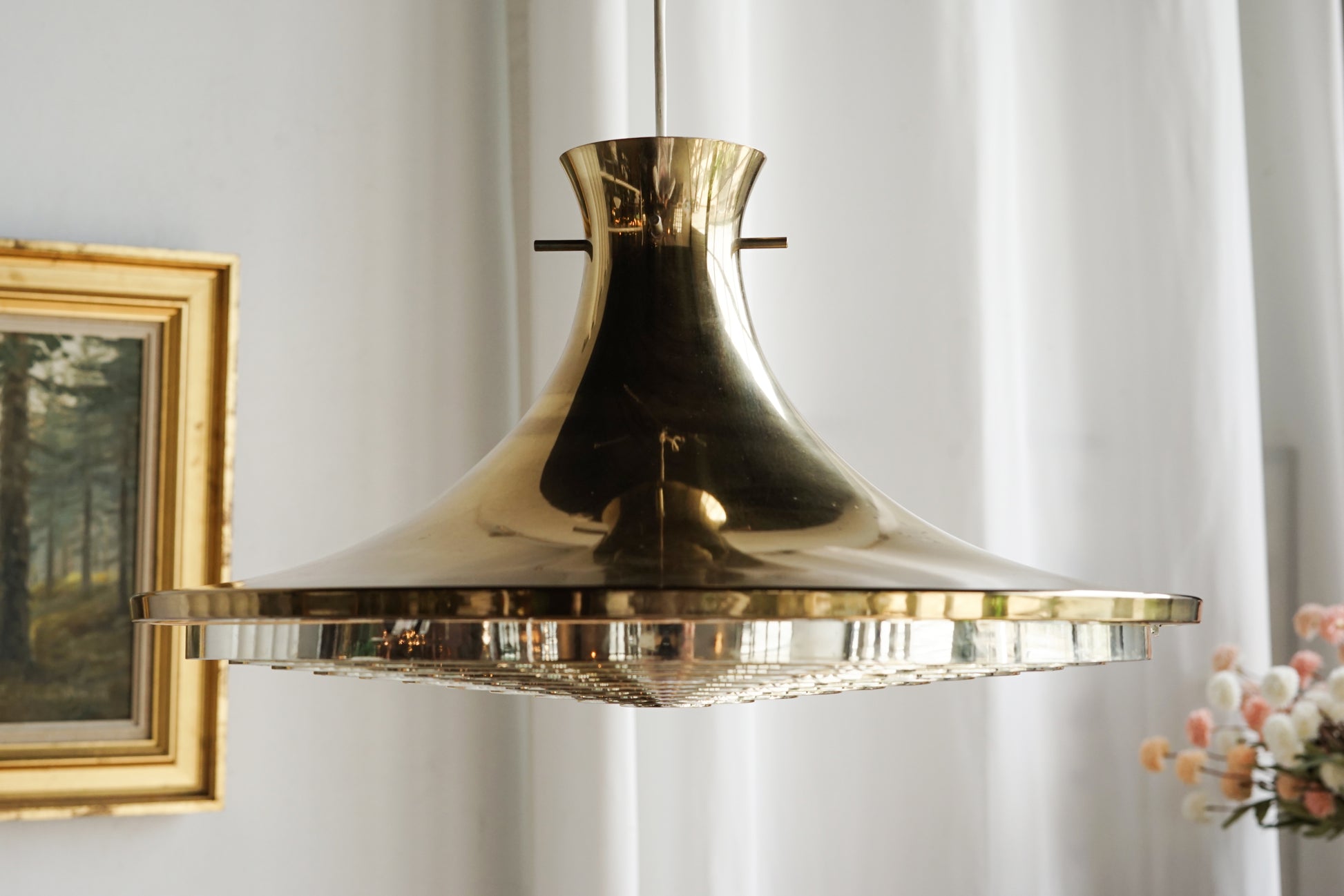 這款 1970 年代出品的北歐吊燈,整體造型以中世紀現代主義為基礎,展現出 1970 年代斯堪地那維亞設計的流線感與金屬質感。