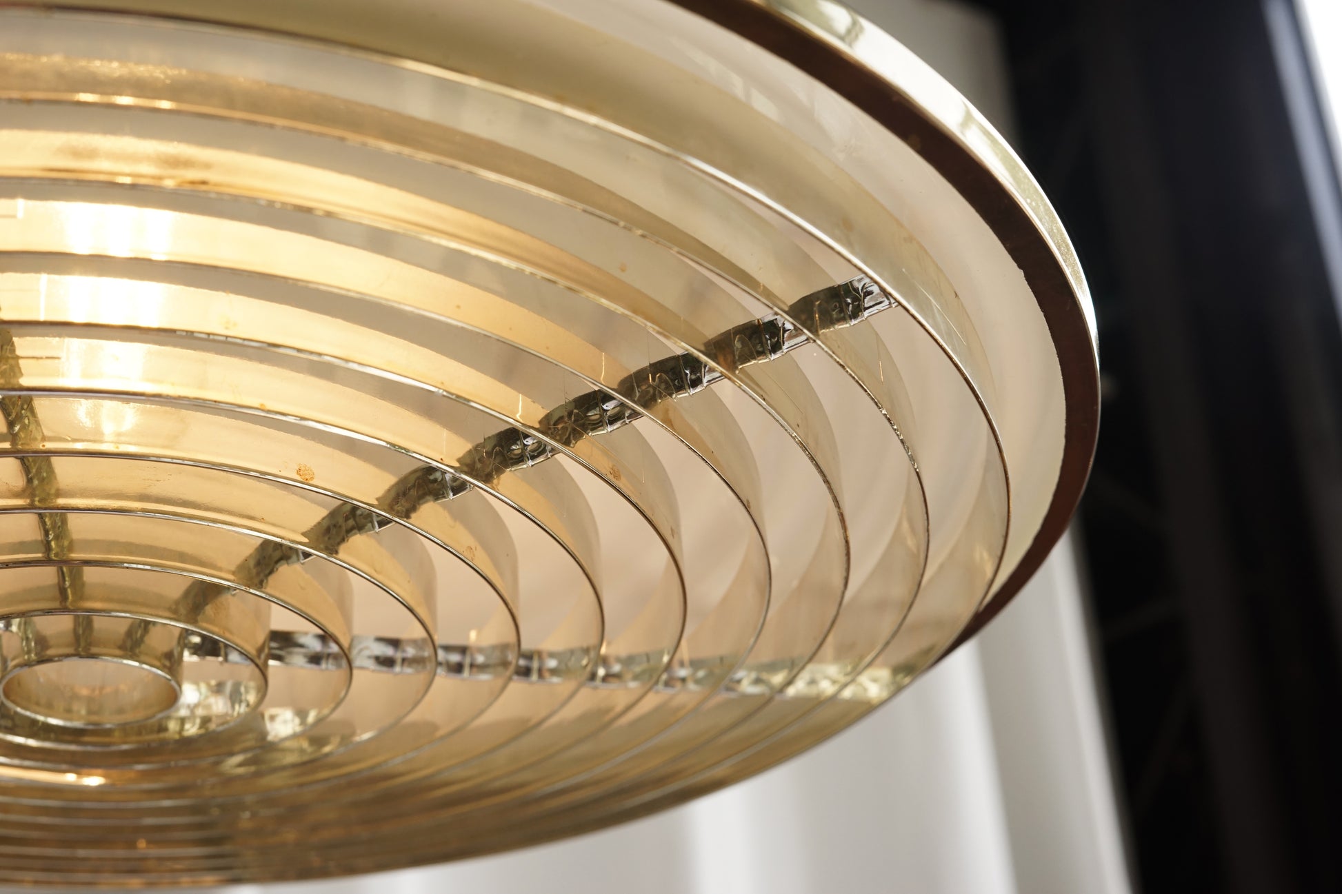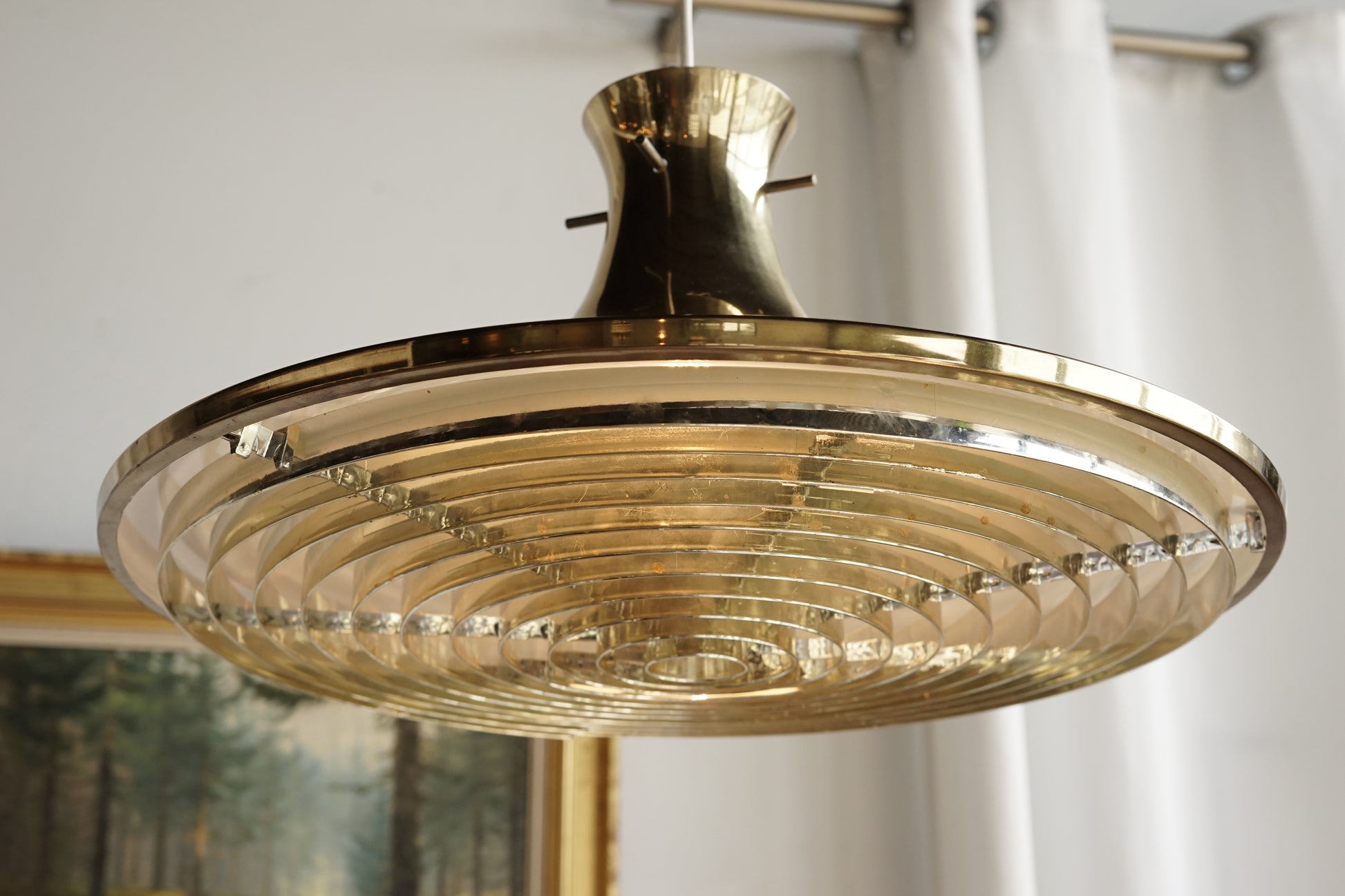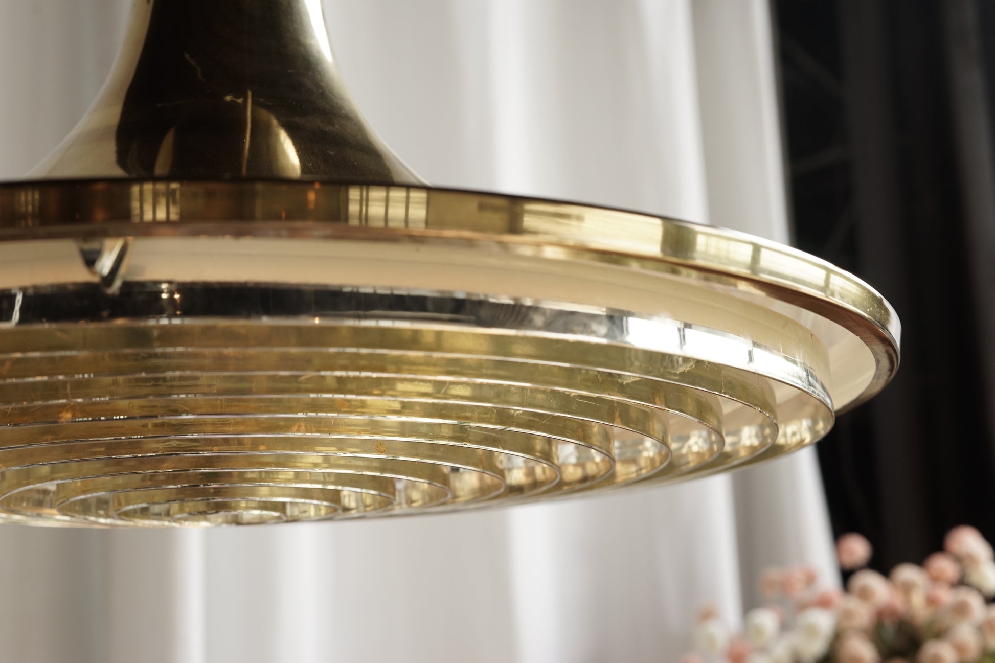 這款 1970 年代出品的北歐吊燈,整體造型以中世紀現代主義為基礎,展現出 1970 年代斯堪地那維亞設計的流線感與金屬質感。