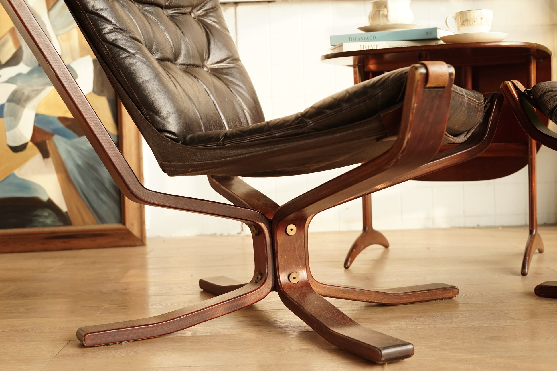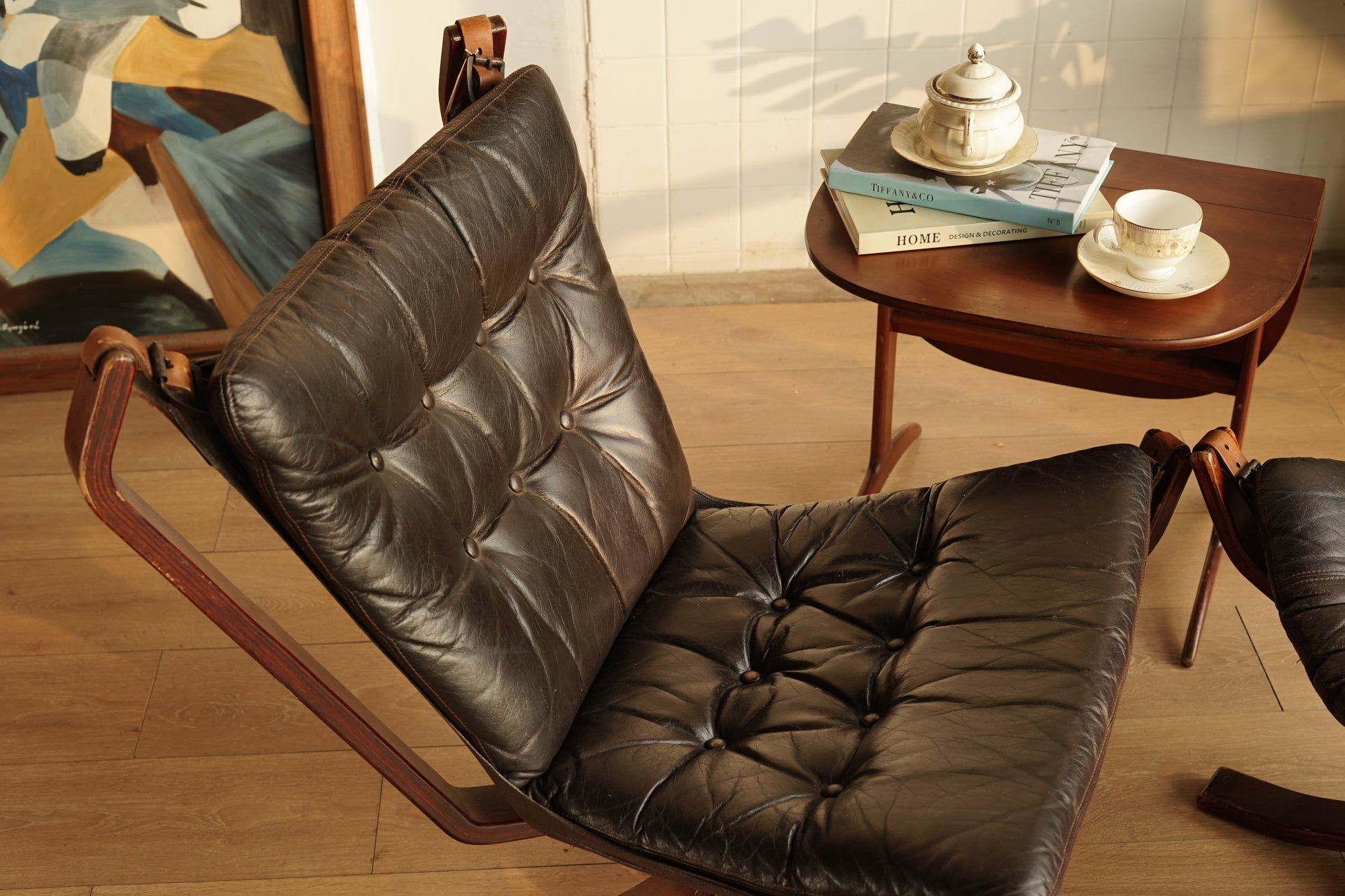 椅架以深色彎曲木結構組成,四爪交叉腳座向外延展,線條俐落;坐墊則是深咖啡色皮革,以鈕釦拉點做出格狀皺摺,椅背略低、傾斜角度大,搭配同款腳蹬。