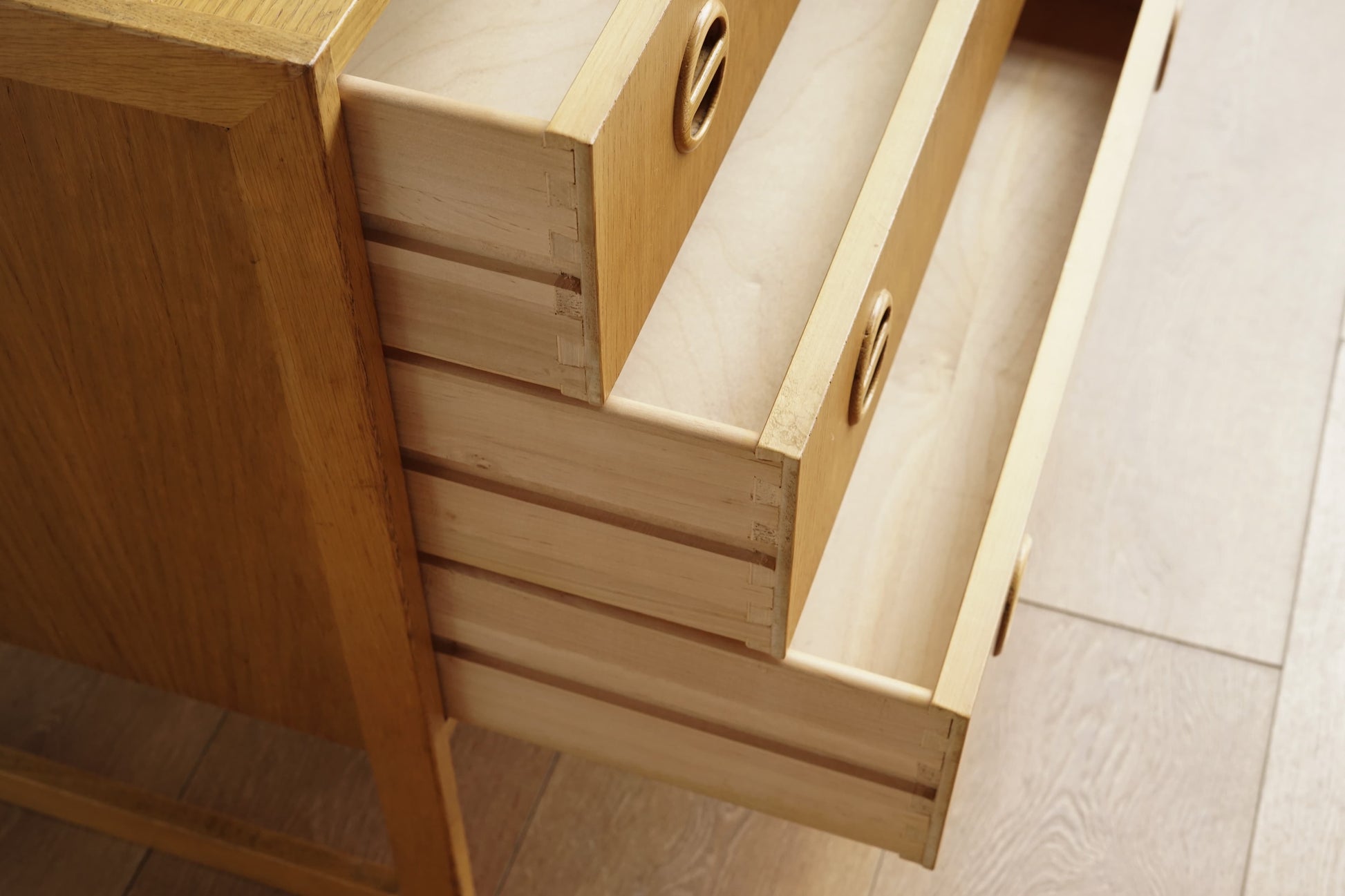 立架採用矩形框架結構,讓整體視覺更輕盈,符合丹麥設計的「簡約 × 實用」理念。抽屜榫接工藝精細,內層保持原木色澤,外框則為柚木,展現出質樸自然的紋理。