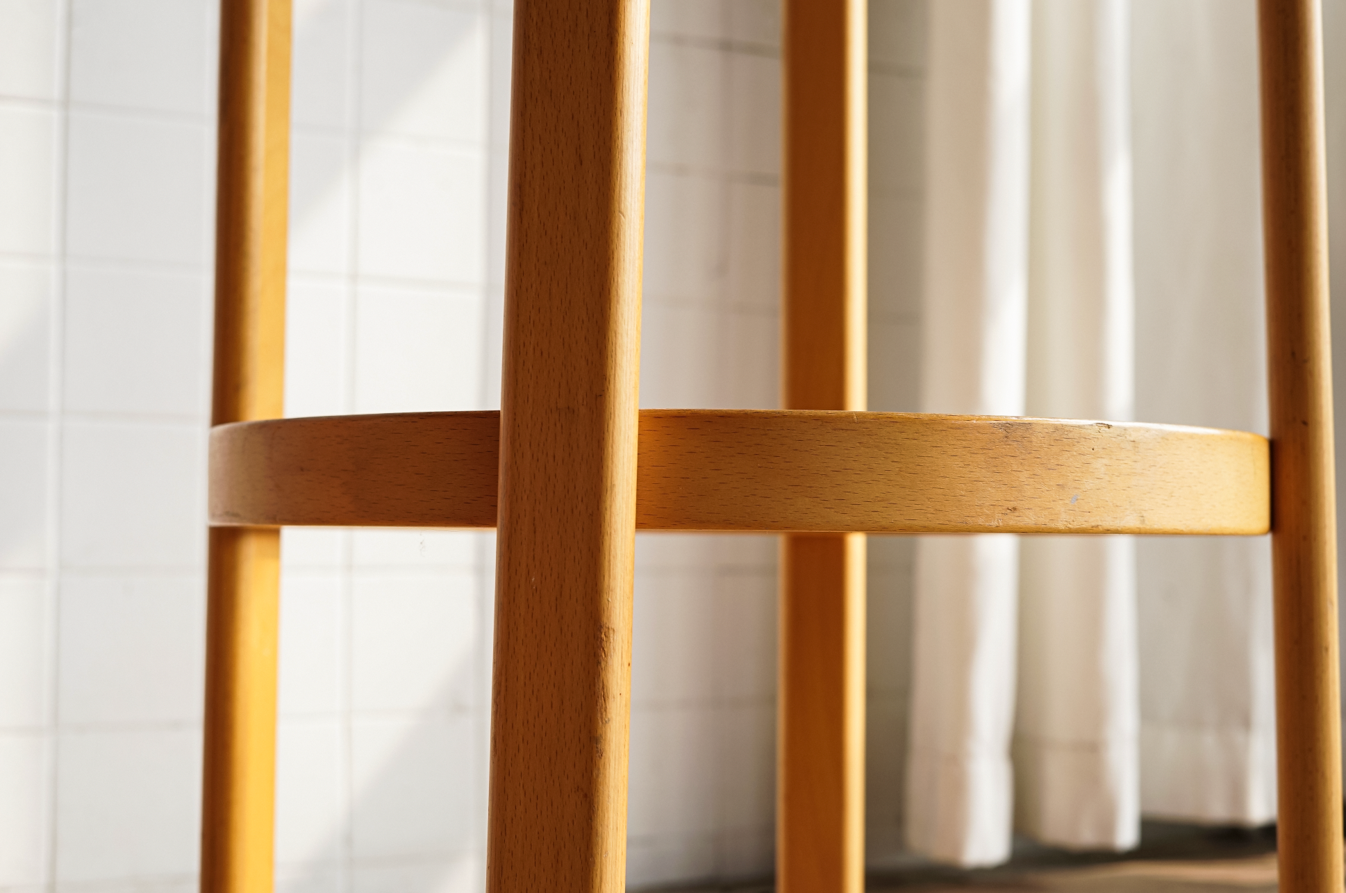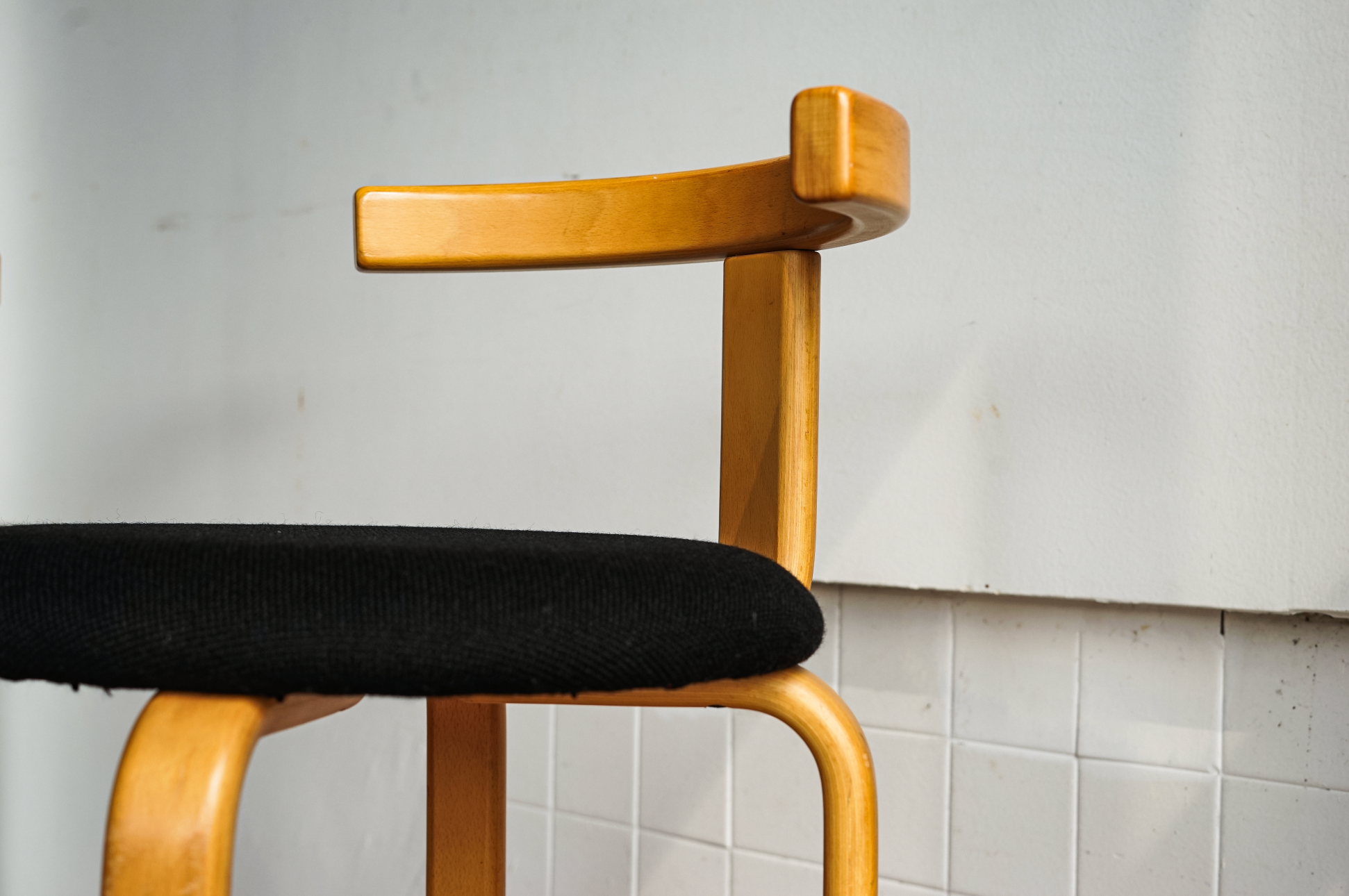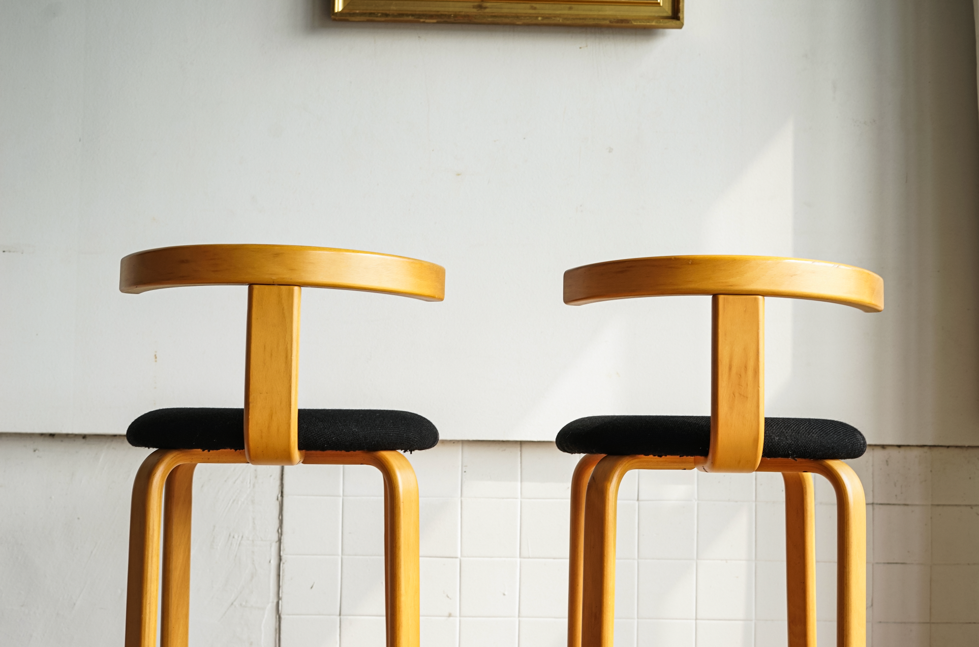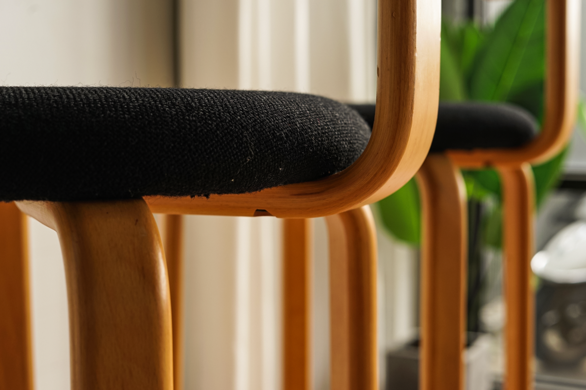 椅身採用北歐經典的曲木工藝,線條流暢而堅固,展現出對細節的極致掌握,高腳結構搭配圓形腳環,不僅強化支撐,也讓使用時更加穩定,椅背以簡約T形造型設計呈現,既保有輕盈感,又提供適度的支撐,深色噪點花紋的坐墊與溫潤木色相互映襯,增添現代氣息,結合北歐設計語彙的純粹美感與實用性,無論置於餐廳吧台、居家中島或公共空間,皆能為場域帶來俐落、溫雅的氛圍。