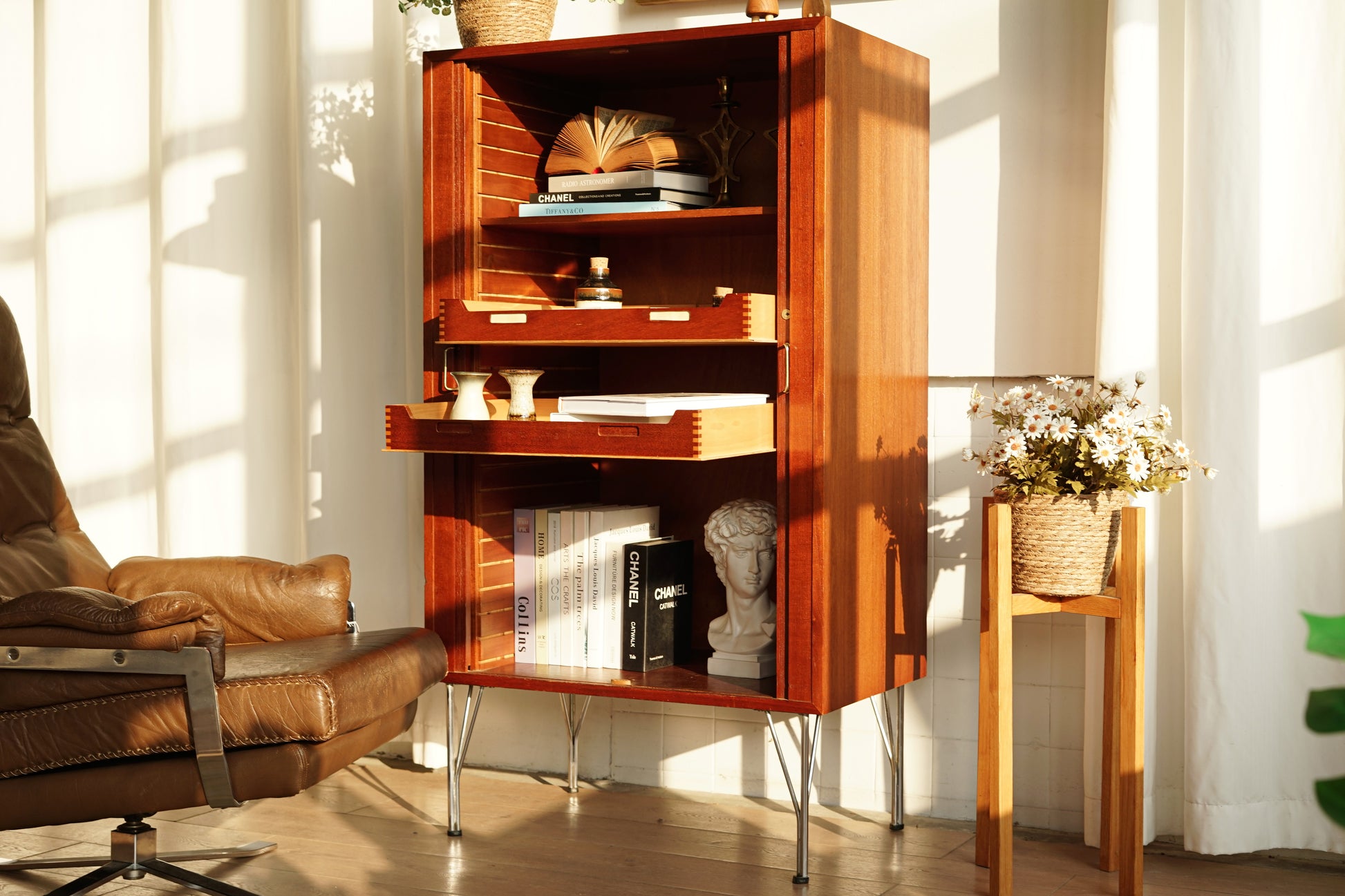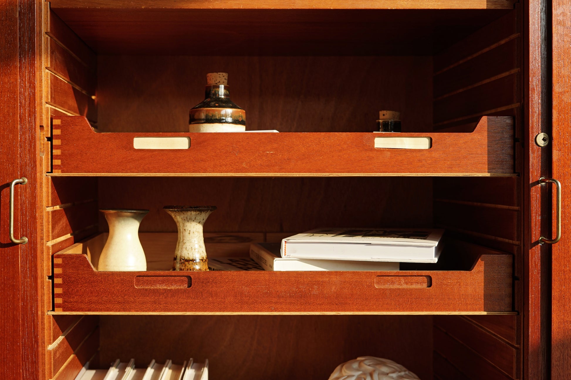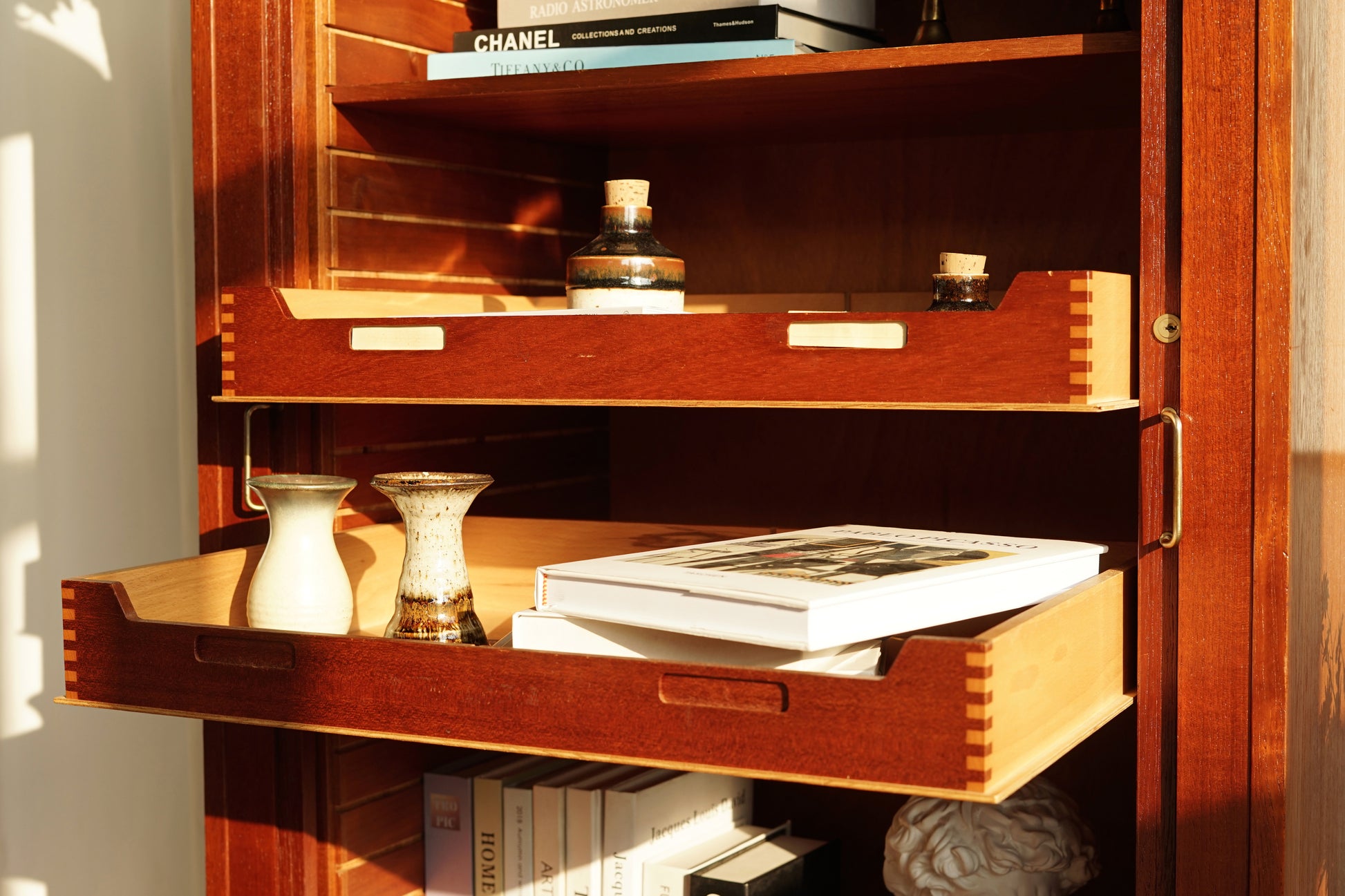 這款來自丹麥的柚木高書櫃,雙開捲門設計(Tambour Doors),開啟後可完全收入櫃體內,保持正面整潔。