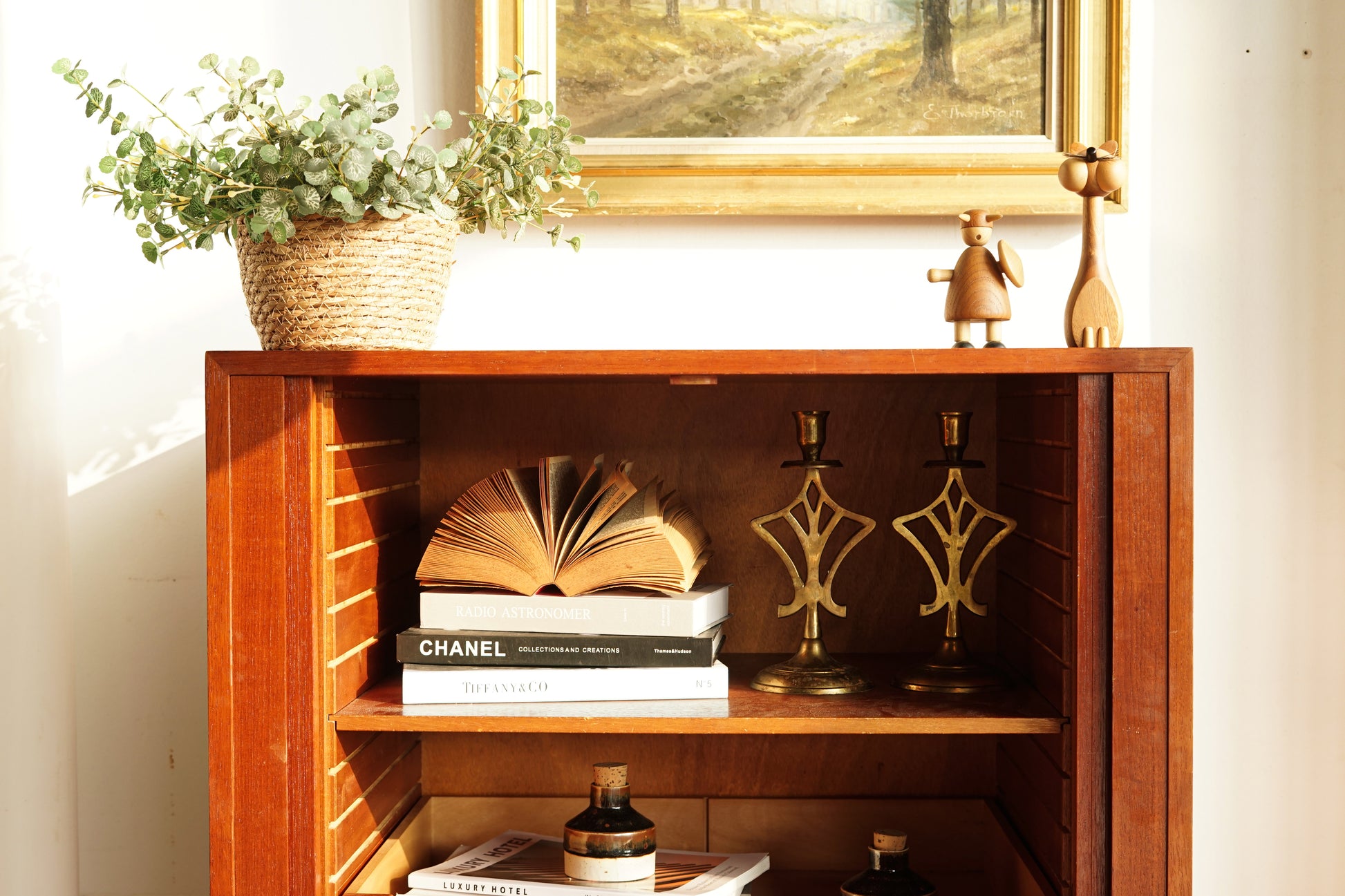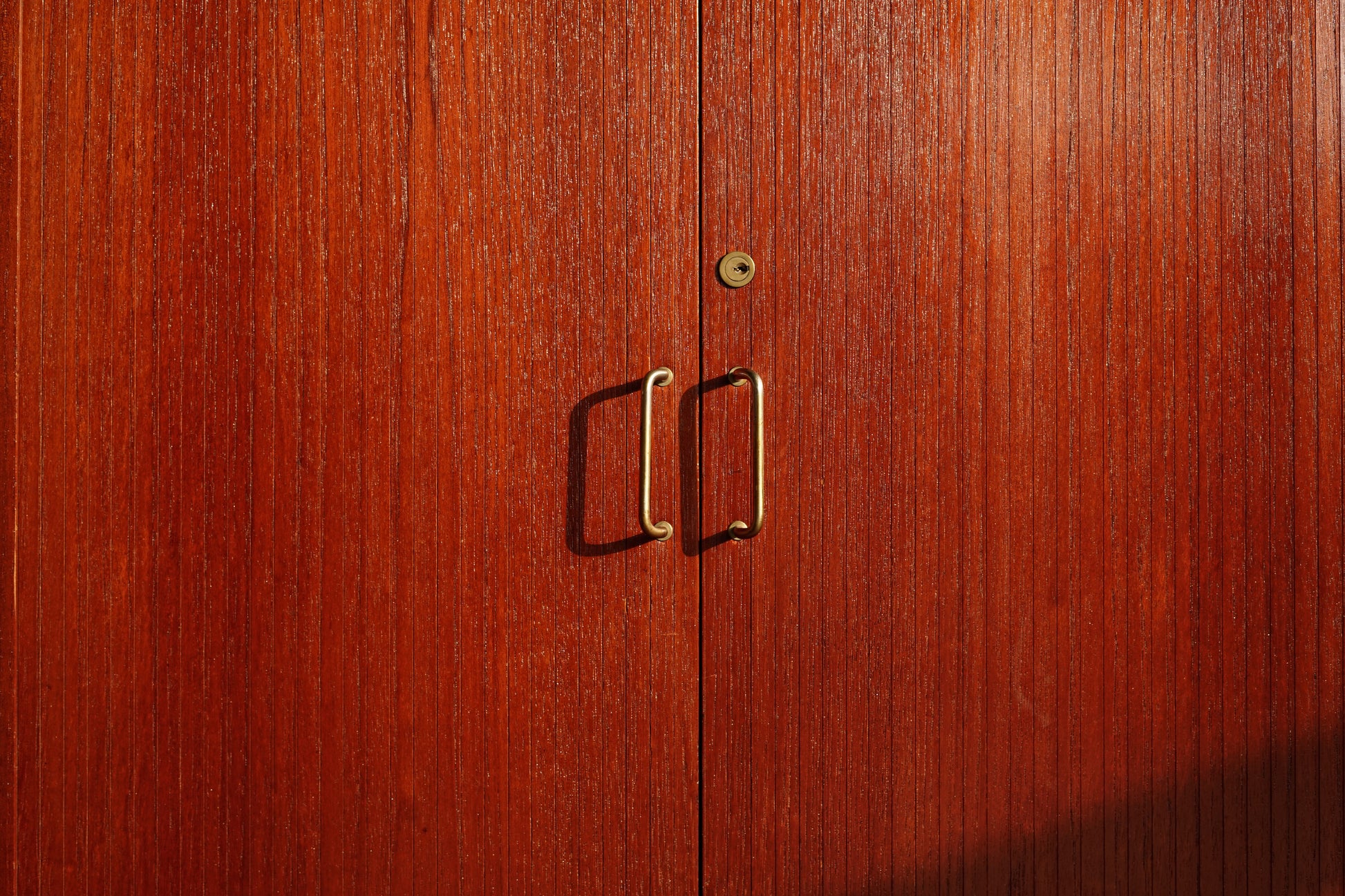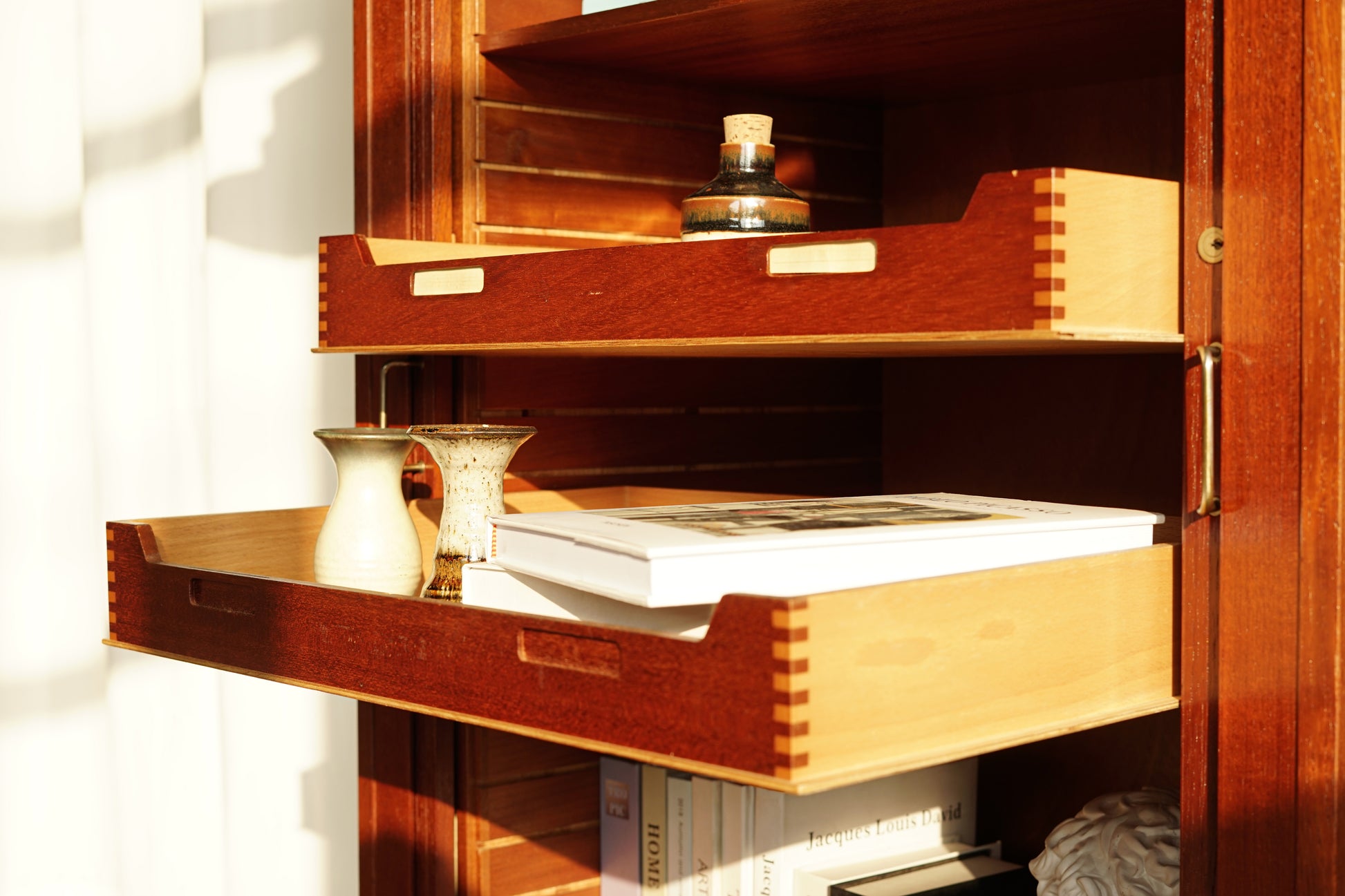 這款來自丹麥的柚木高書櫃,雙開捲門設計(Tambour Doors),開啟後可完全收入櫃體內,保持正面整潔。