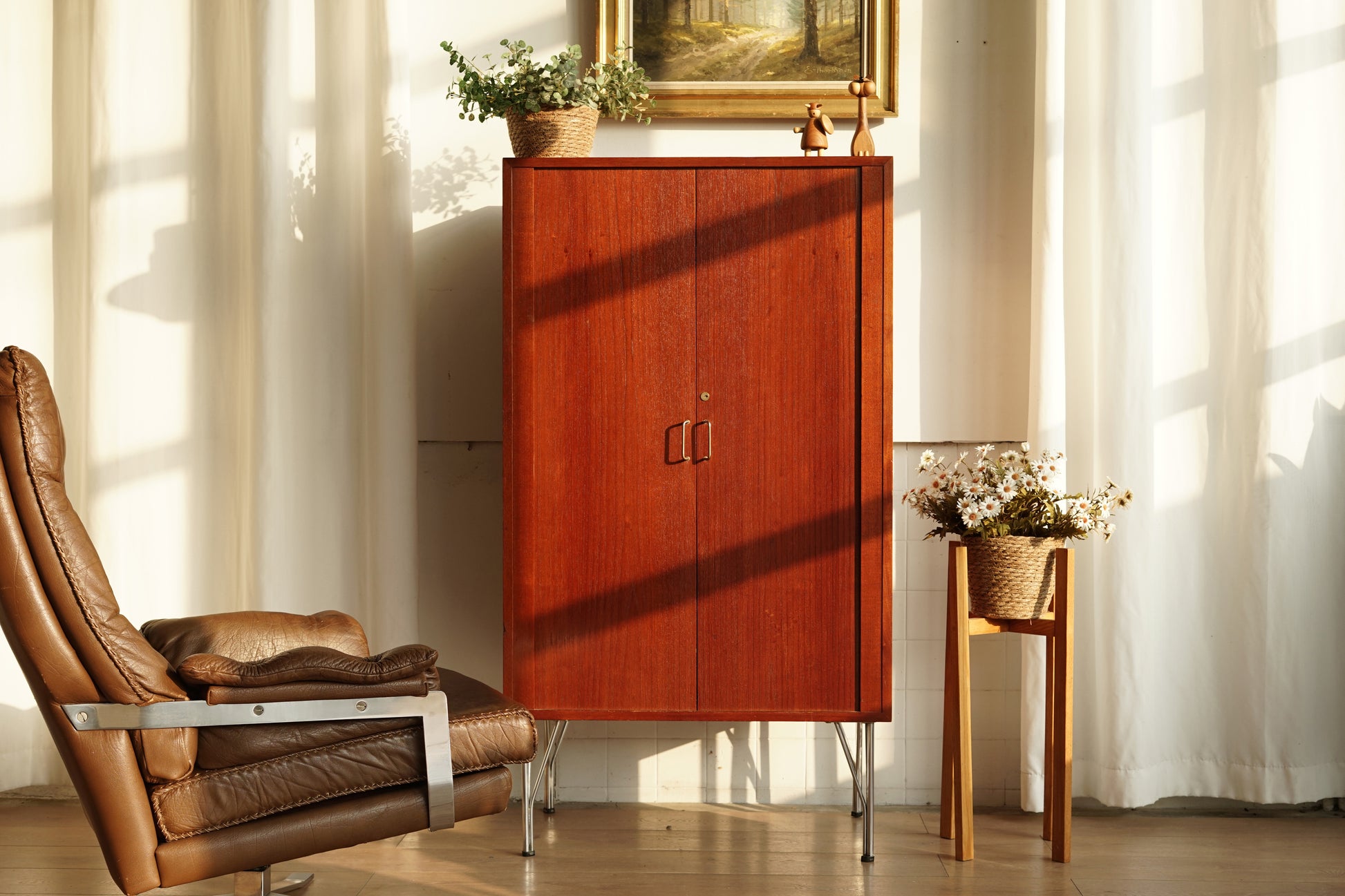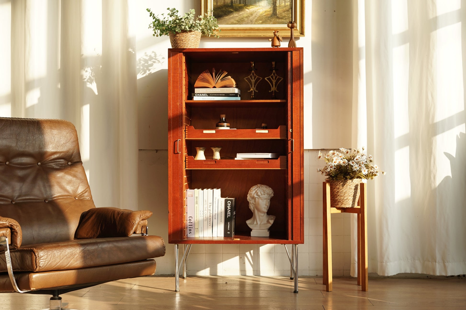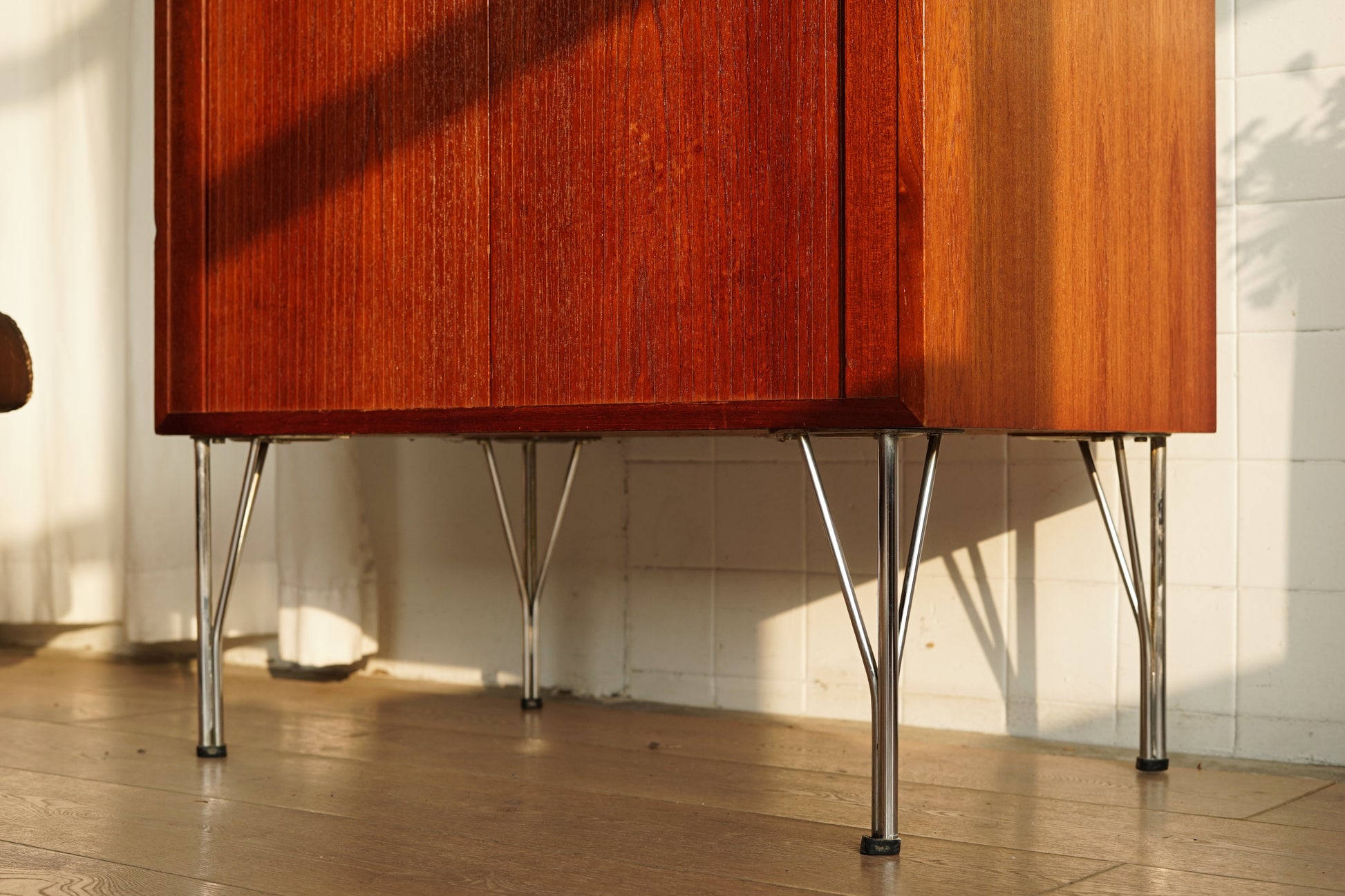 櫃腳為 不鏽鋼支撐結構,以纖細幾何造型托起櫃體,使整體視覺更輕盈,也呼應 1960 年代丹麥家具偏愛的「懸浮感」比例。