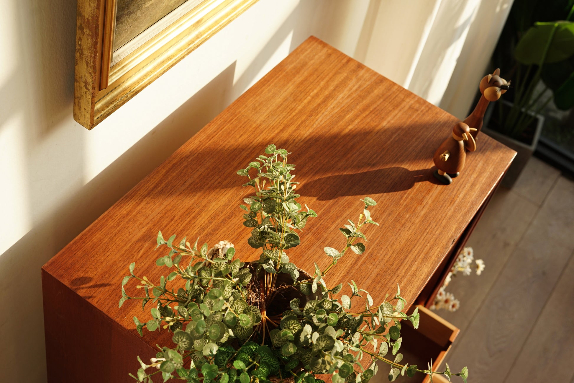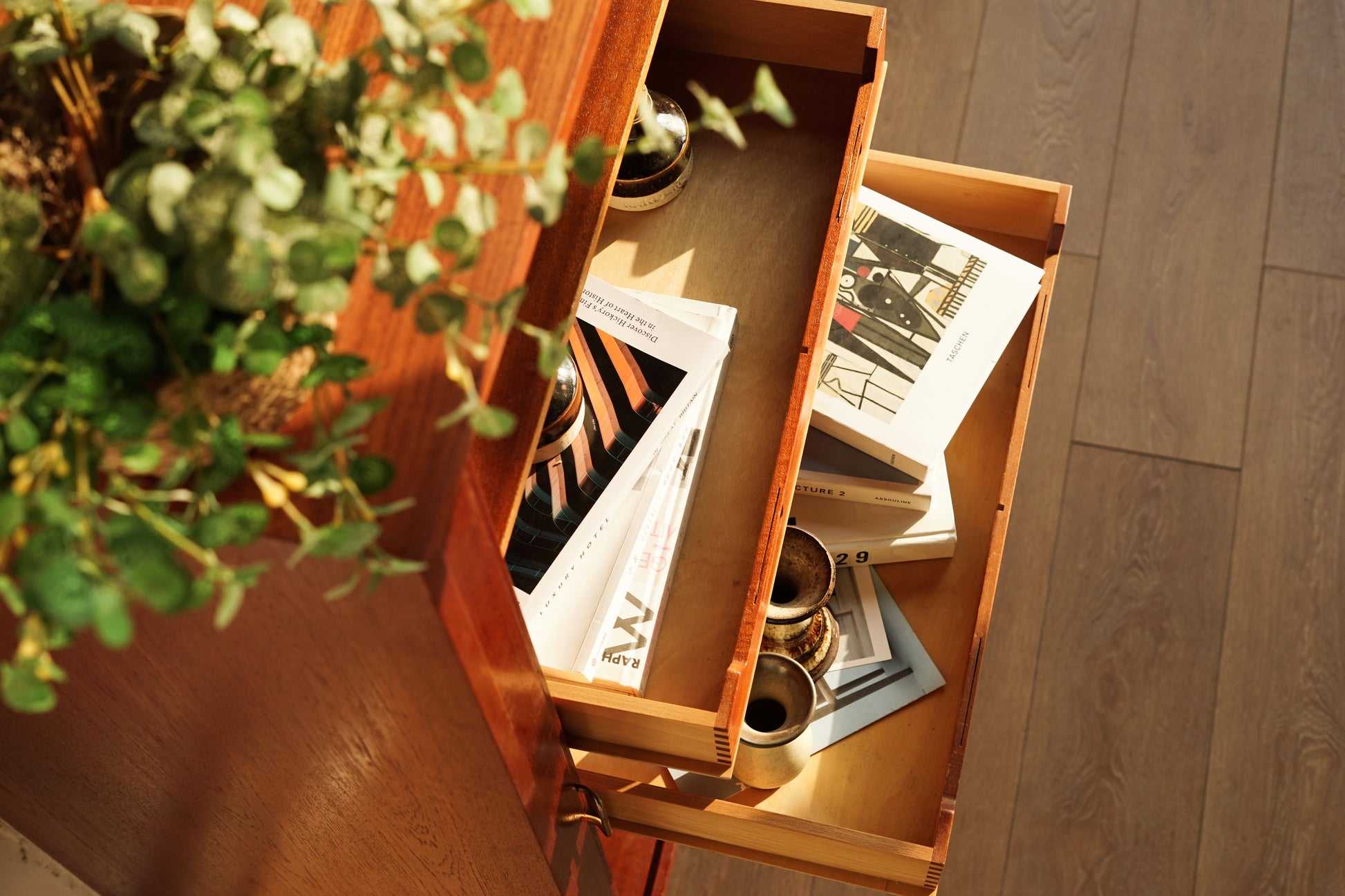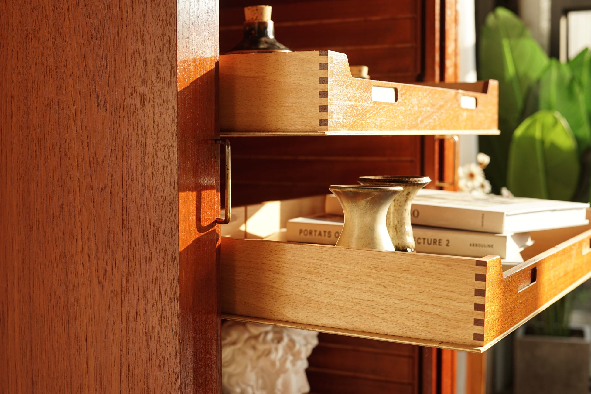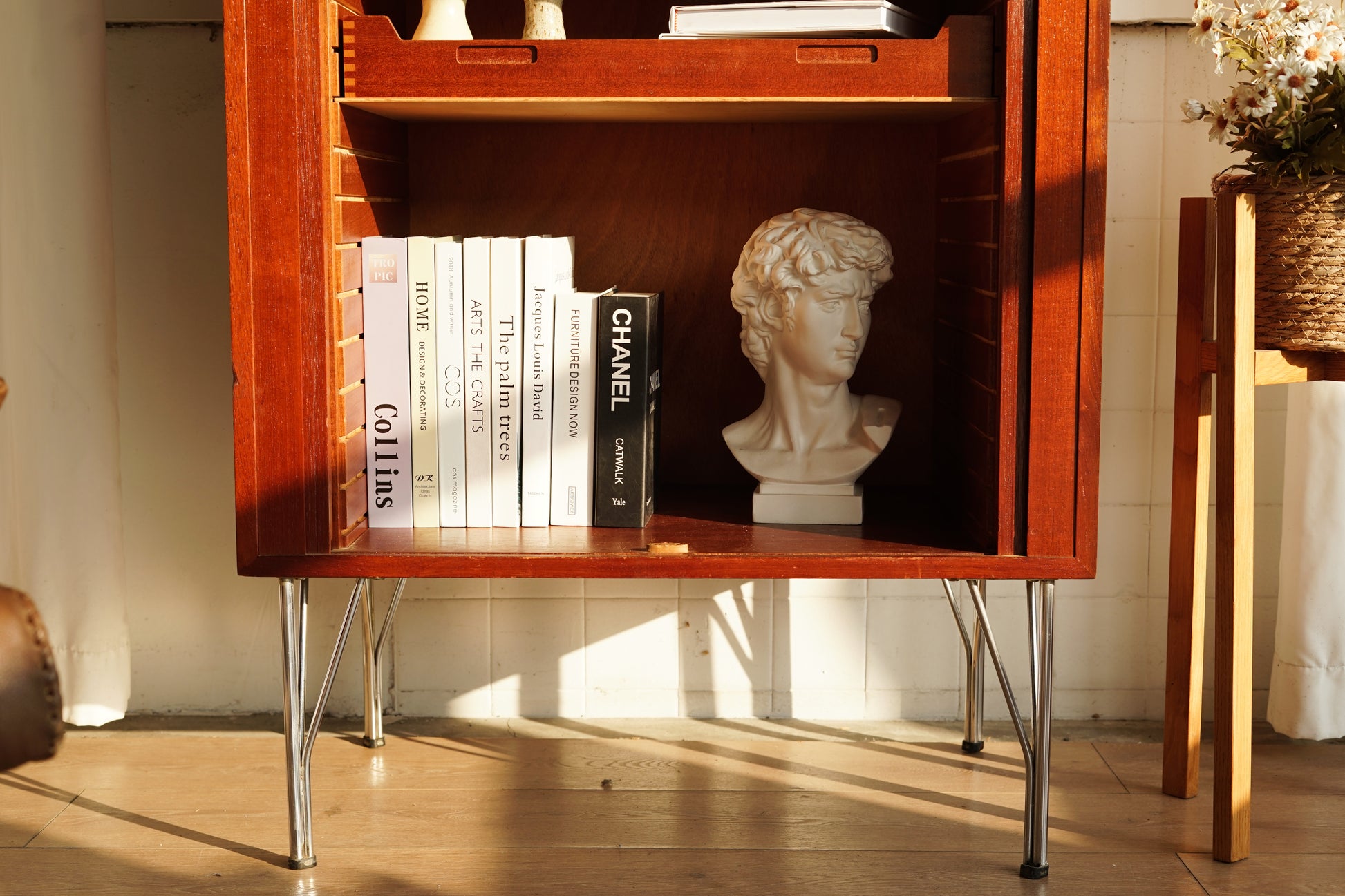 櫃腳為 不鏽鋼支撐結構,以纖細幾何造型托起櫃體,使整體視覺更輕盈,也呼應 1960 年代丹麥家具偏愛的「懸浮感」比例。