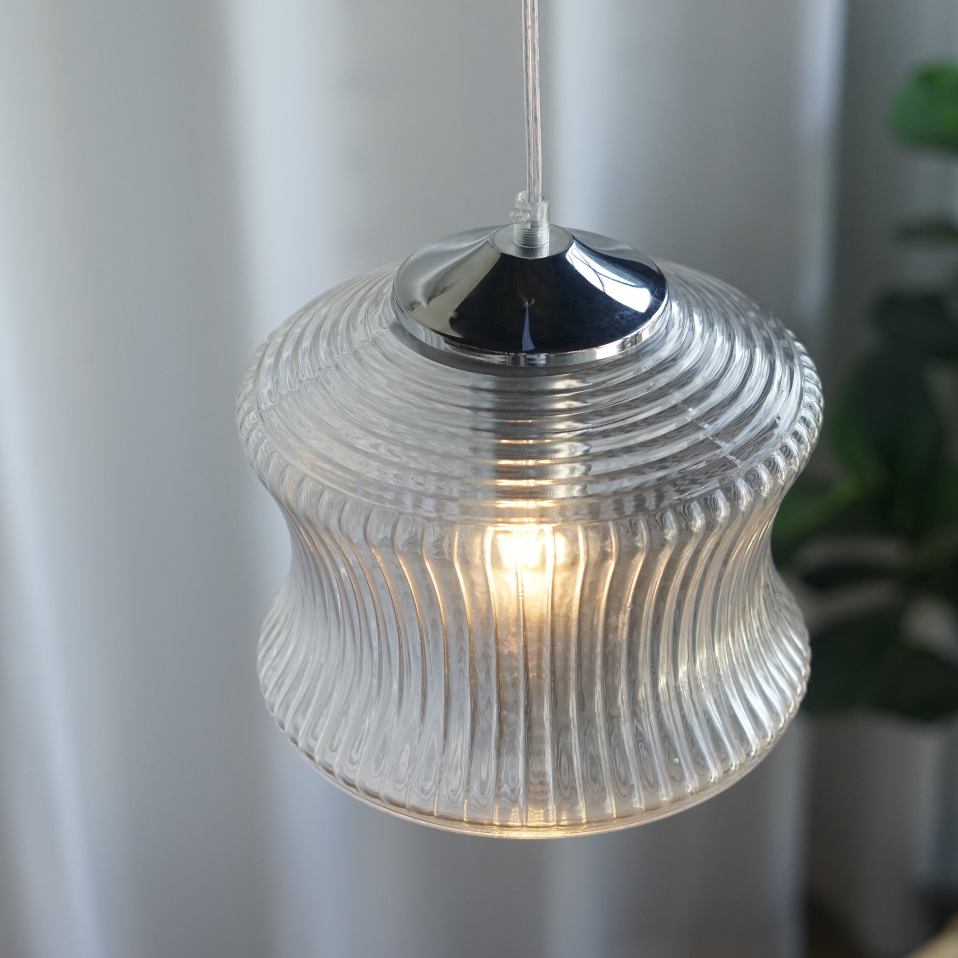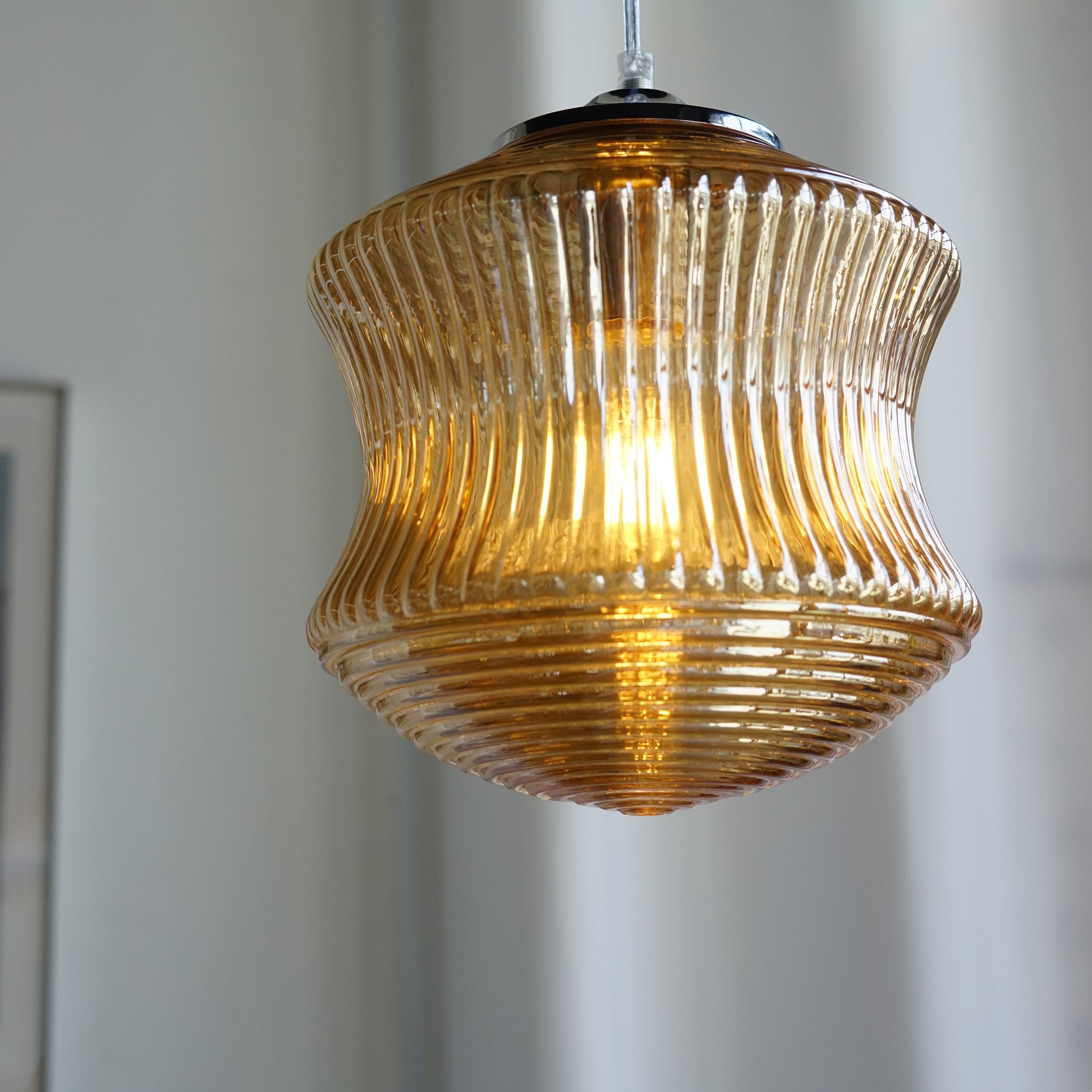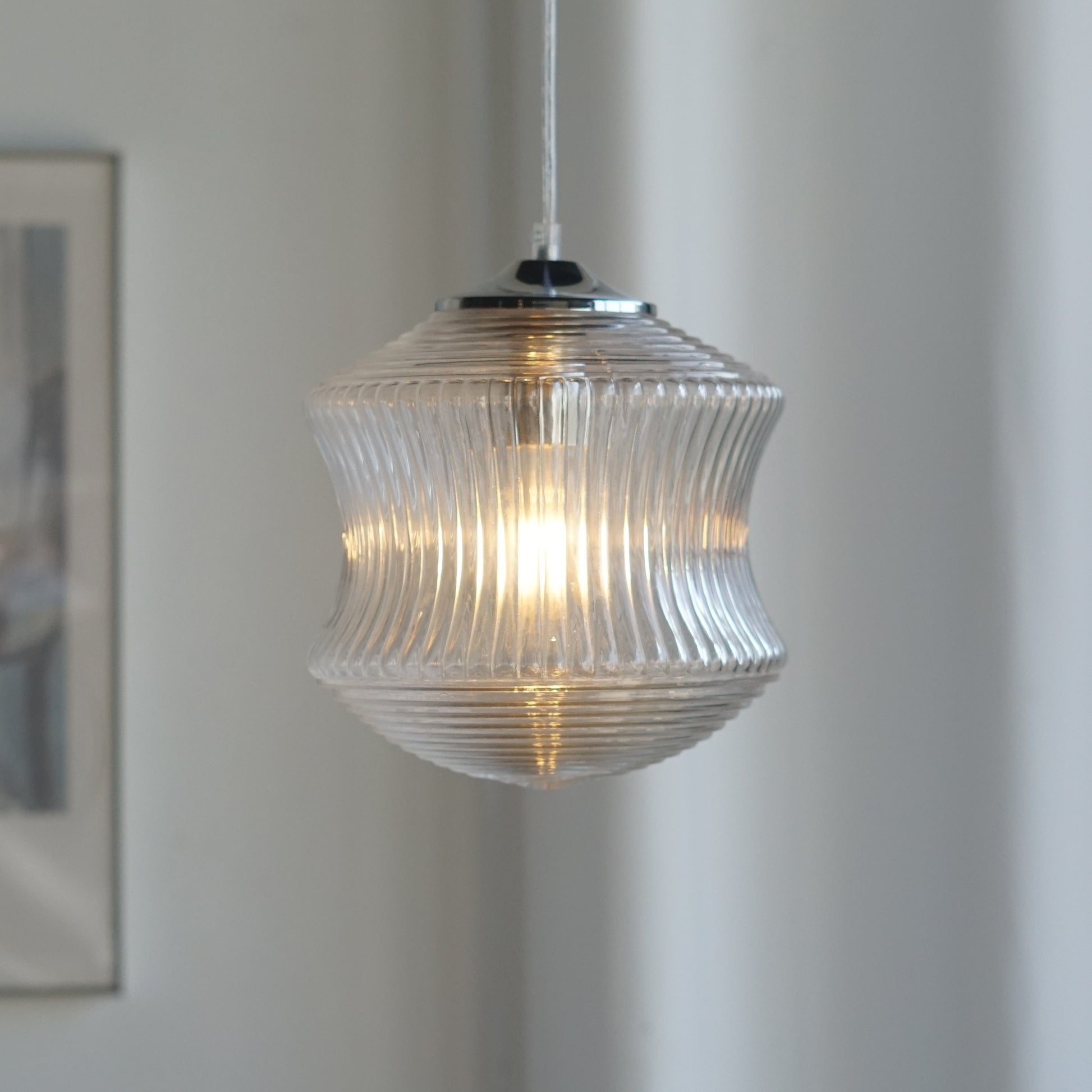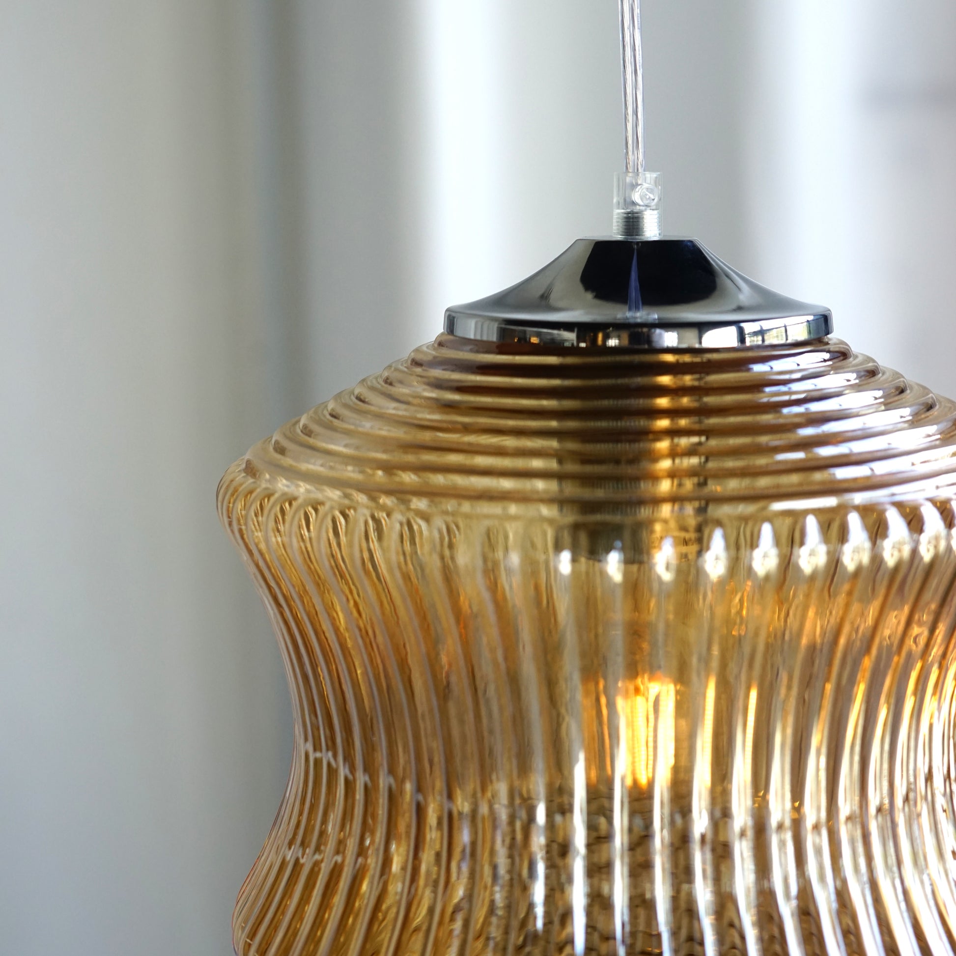 以精緻的玻璃製作,本款吊燈將中間的內凹弧形設計與上下的錐形完美結合。中部的內凹弧形設計與直條紋理營造出古典的雅致感,而上下的同心圓紋理使其富有藝術感的層次。