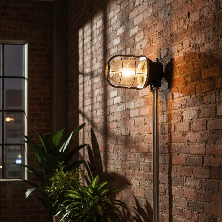 The main body is made of plastic die-casting, with a glass lampshade, showing a retro and practical texture. The brass surface is distressed, suitable for industrial, Nordic, and classical style decoration.