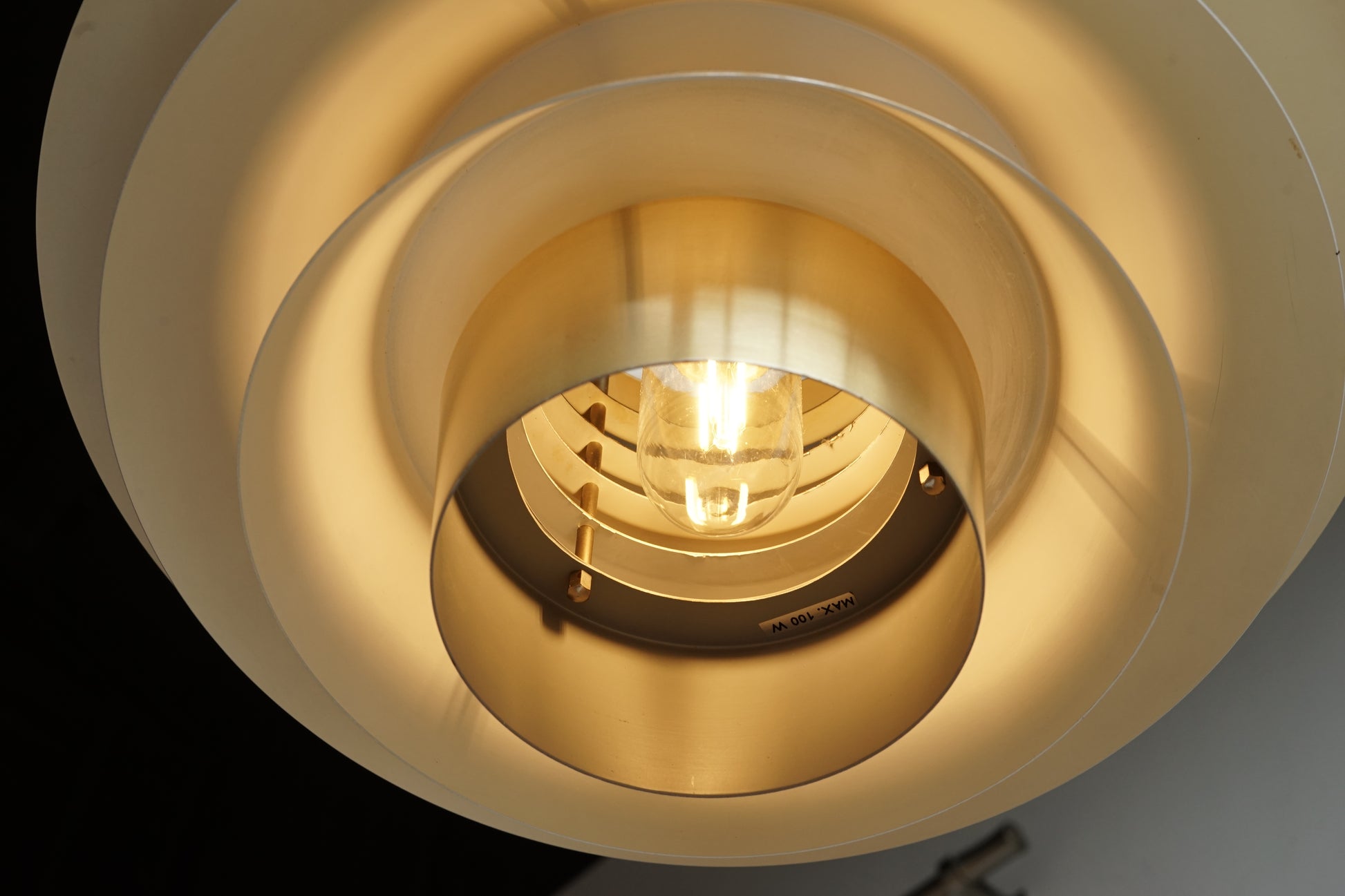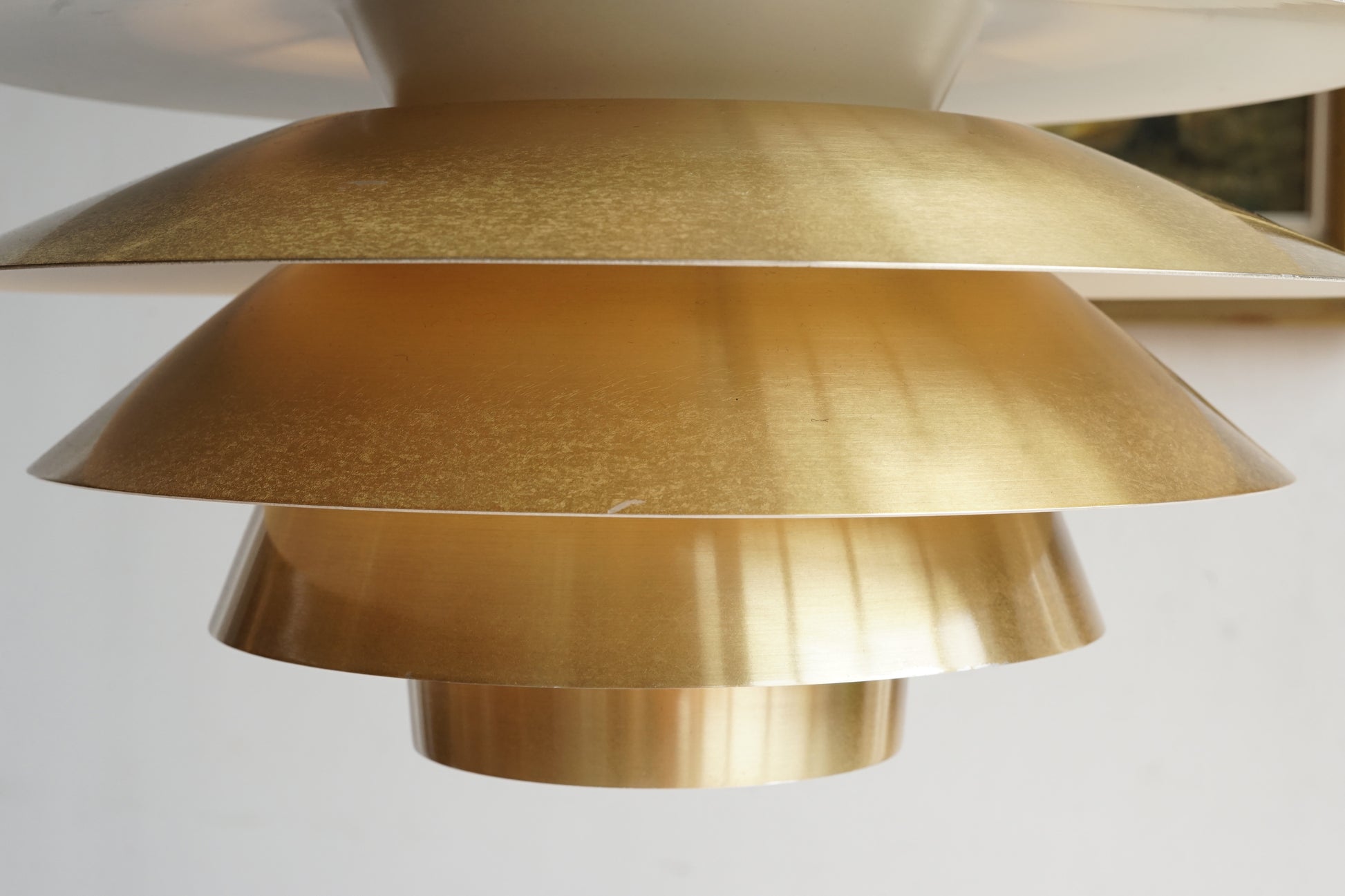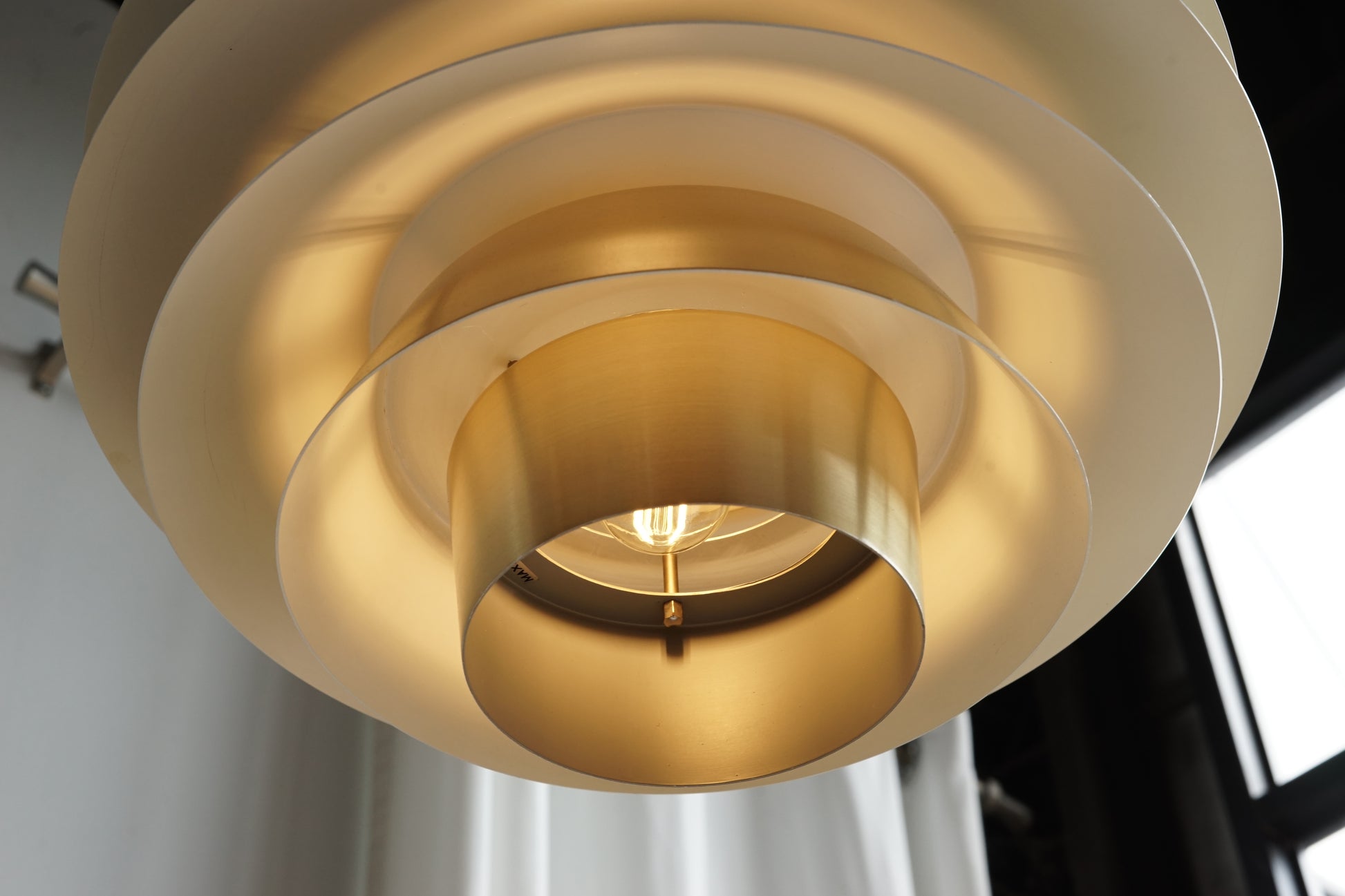多層次盤片自上而下階梯式收斂,外觀為霧面金色,內面為白色反射塗層,最下方以圓筒狀集光圈收口。點燈後,光線在各層間反射,提供集中但不刺眼的下照光並帶出柔和環光,適合餐桌、吧台或重點照明場域。