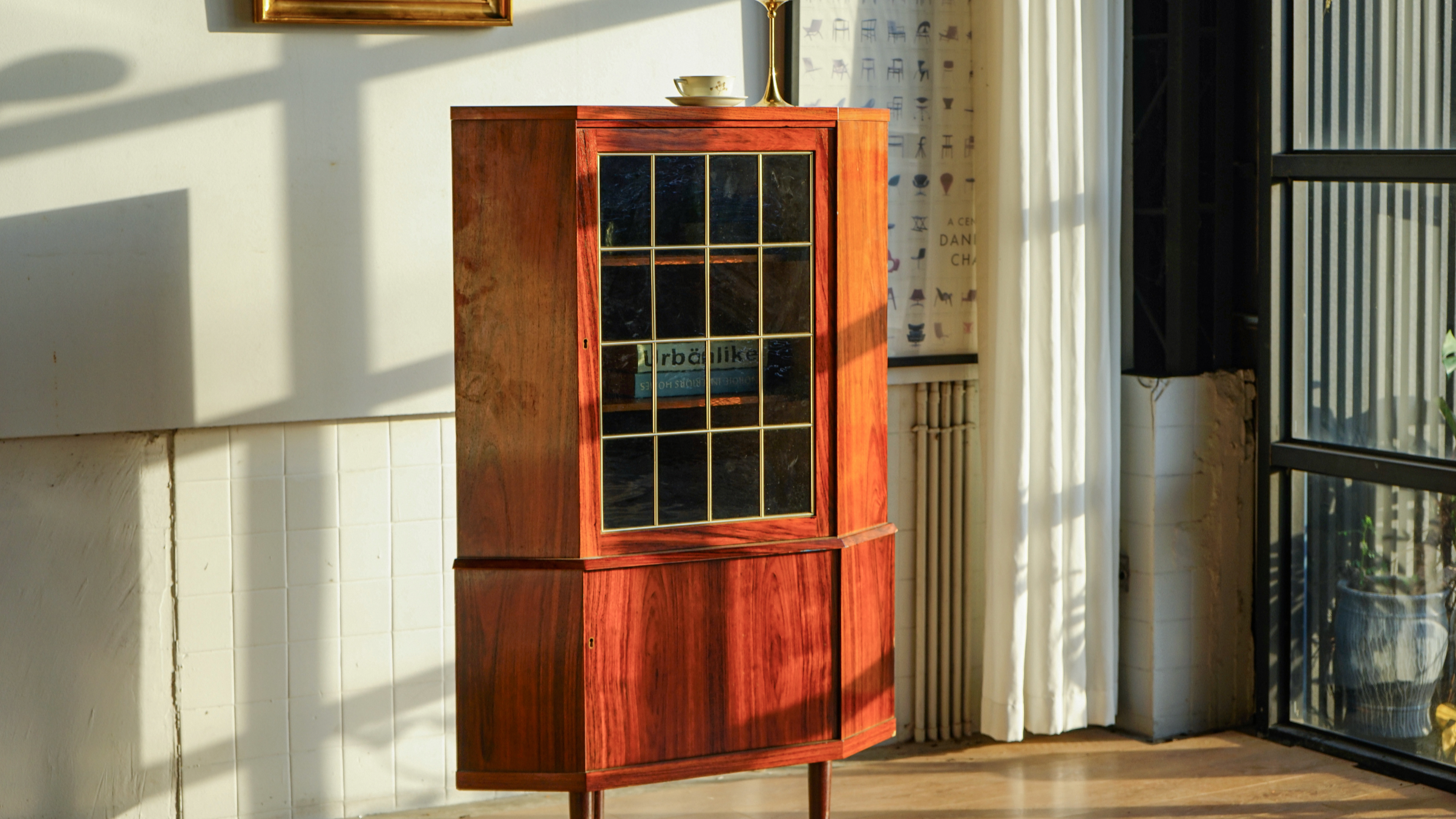 丹麥 玫瑰木 玻璃 轉角展示櫃