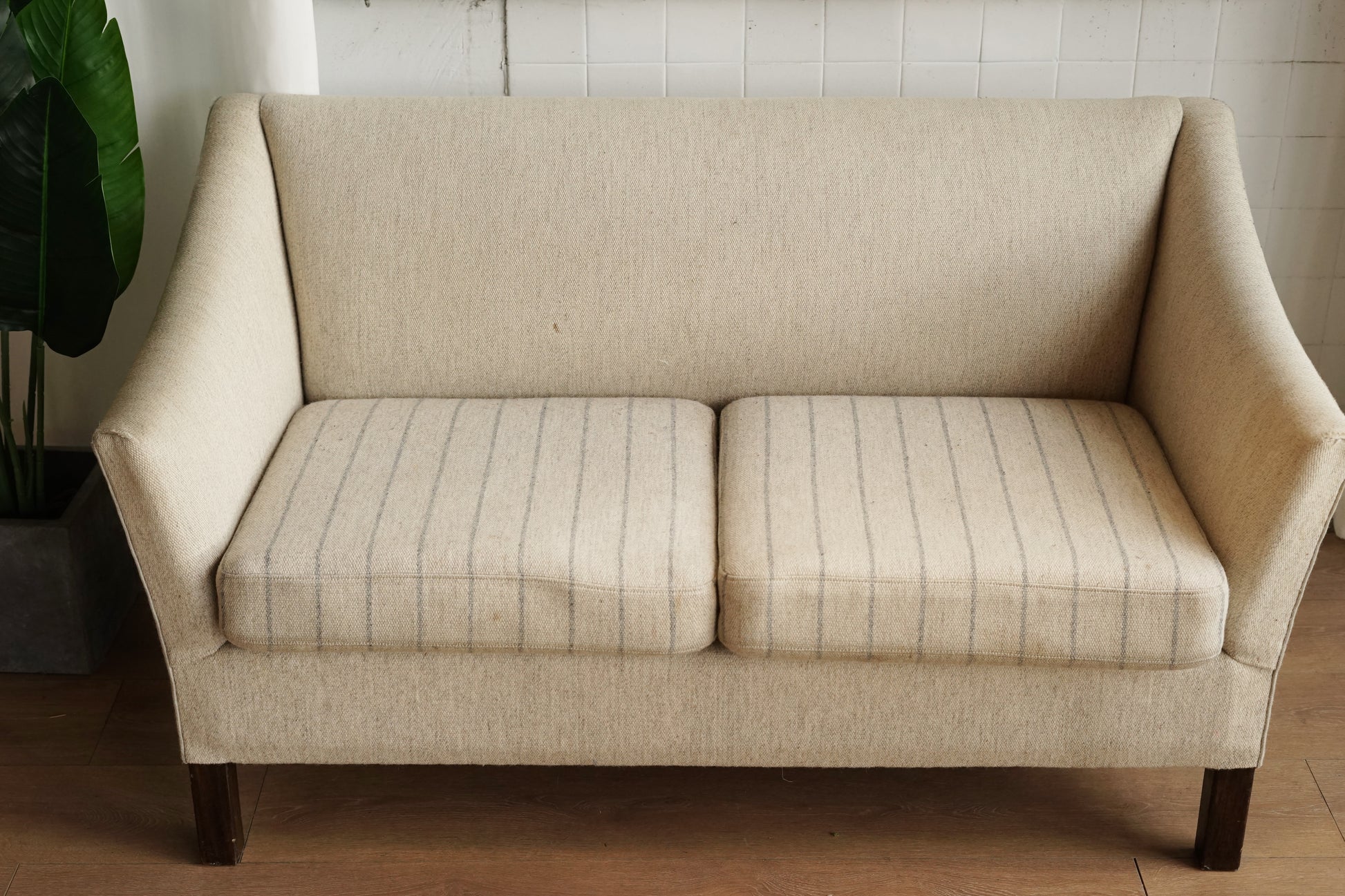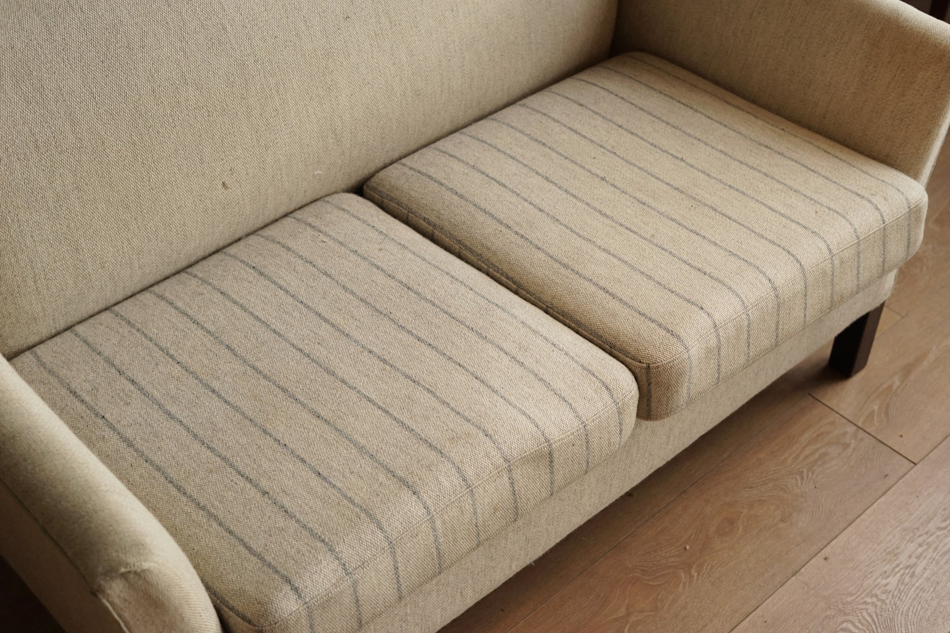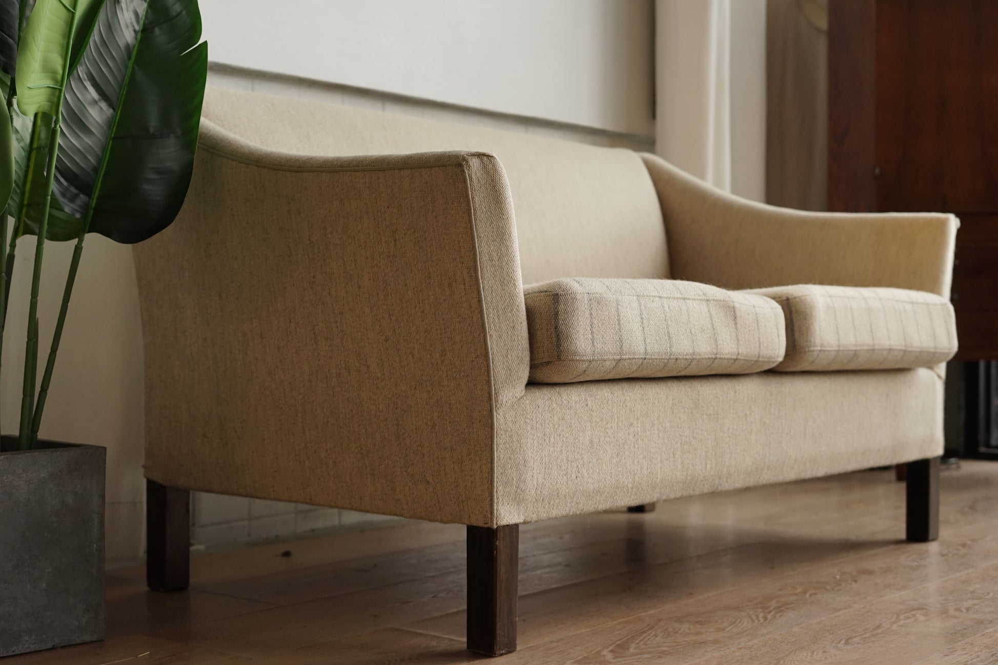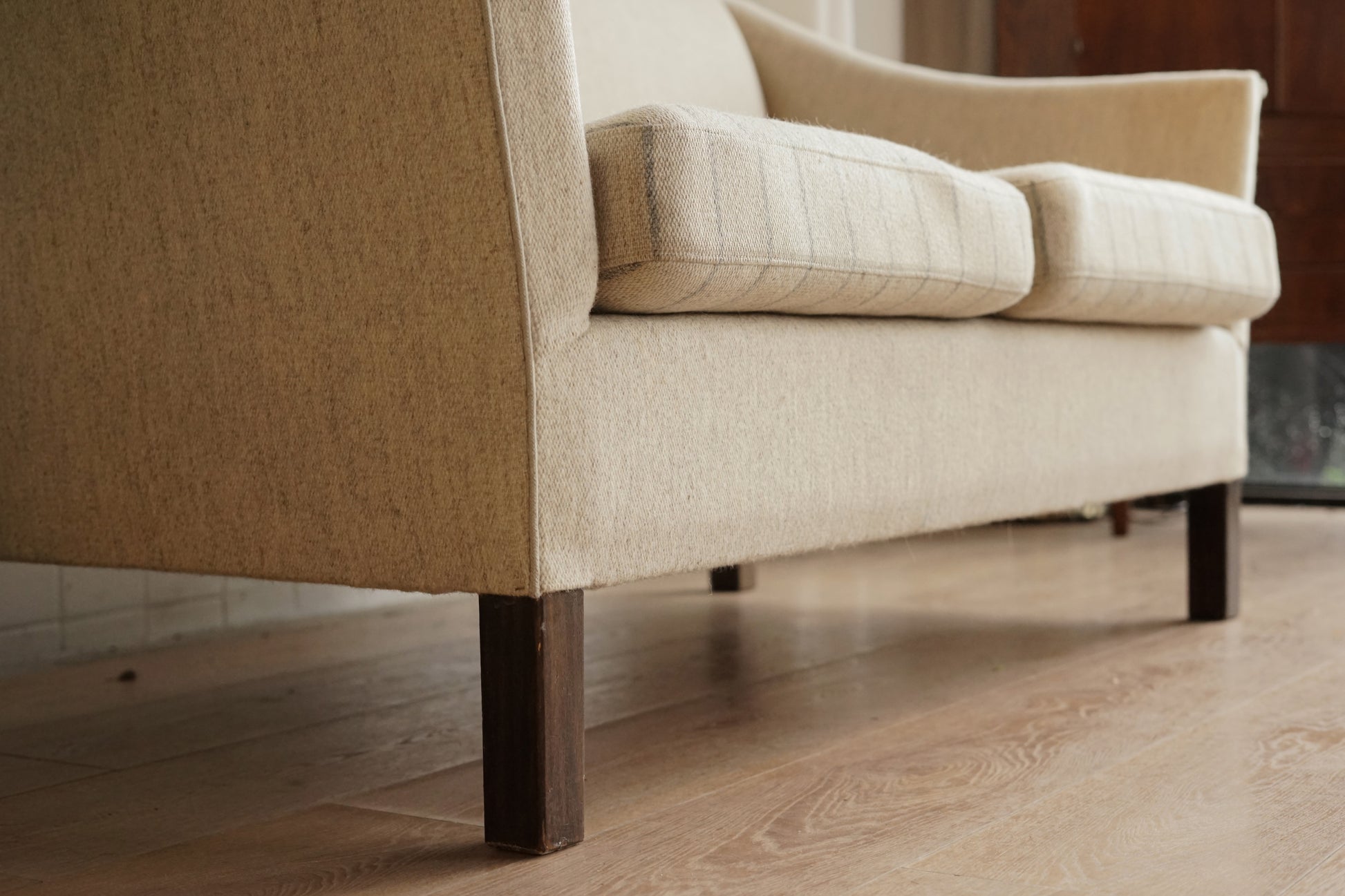 奶油色粗織布面低調帶點雜色感,兩顆坐墊則做成細灰線條的條紋圖案,讓同色系裡多了一點層次。坐墊為可拆式設計,底部為布面承托;下方是深色實木方柱腳,比例偏高,讓整體視覺輕盈,也方便打掃。