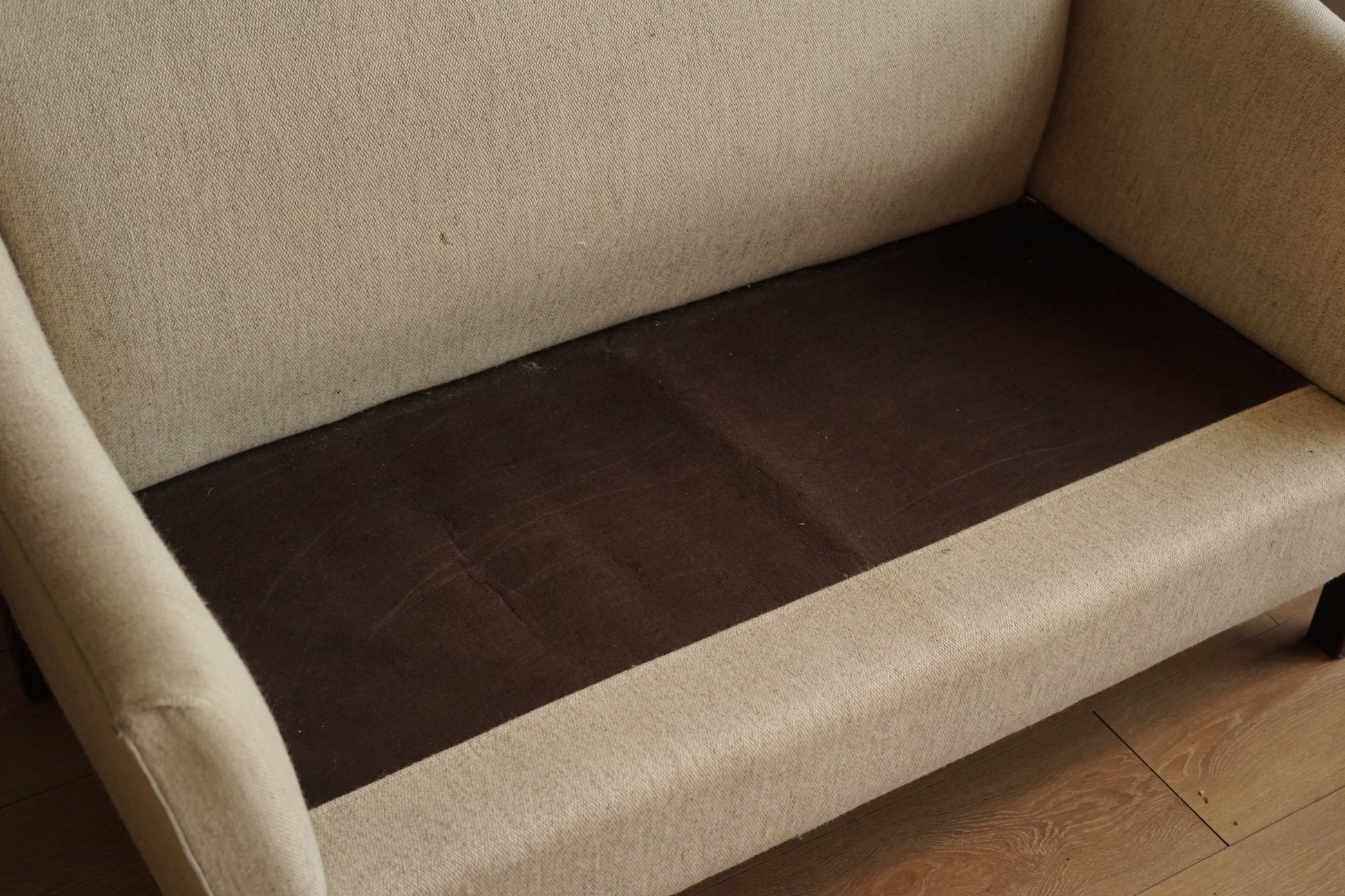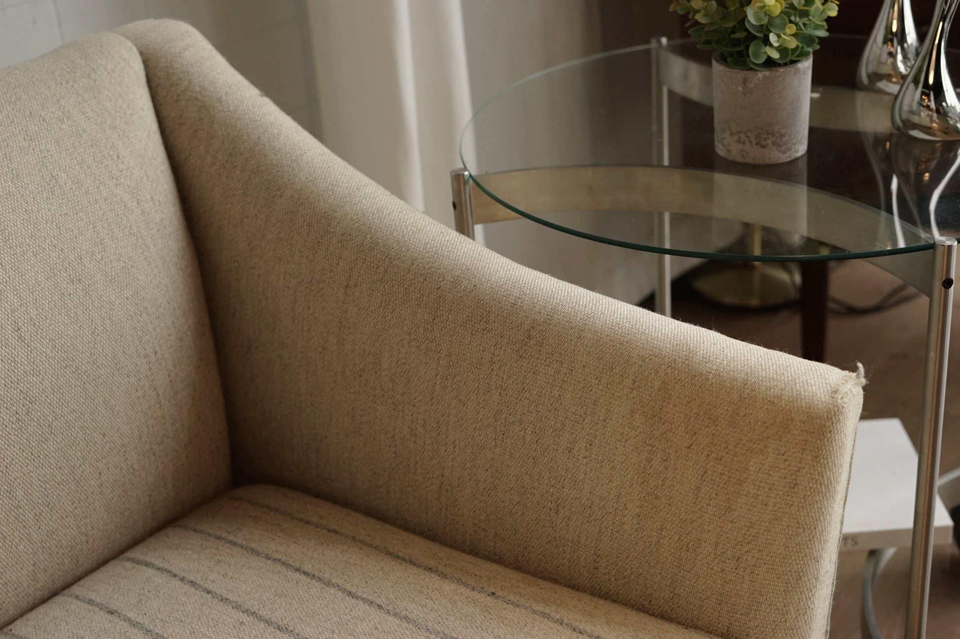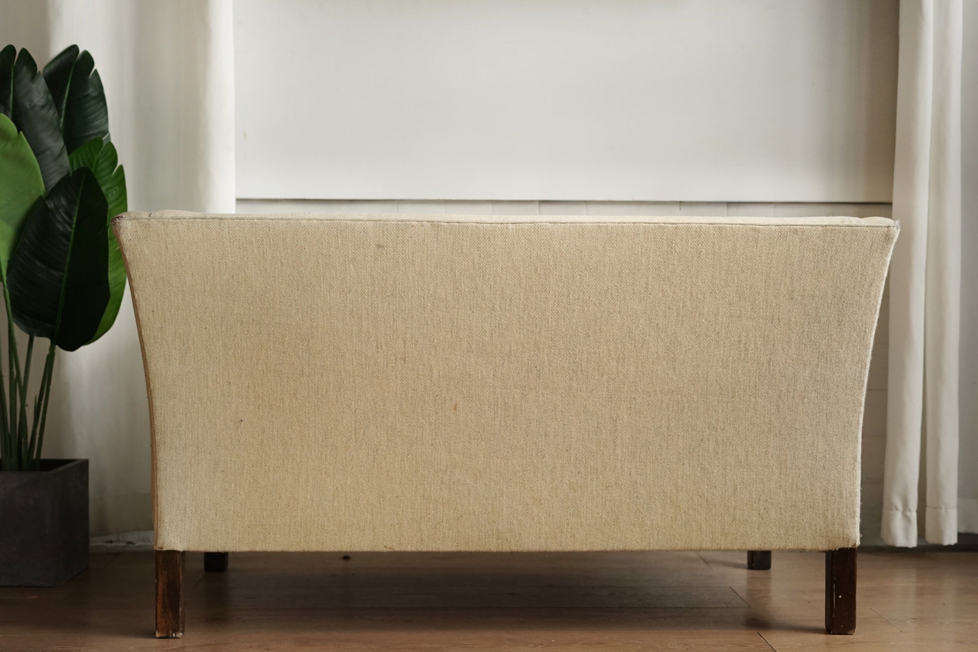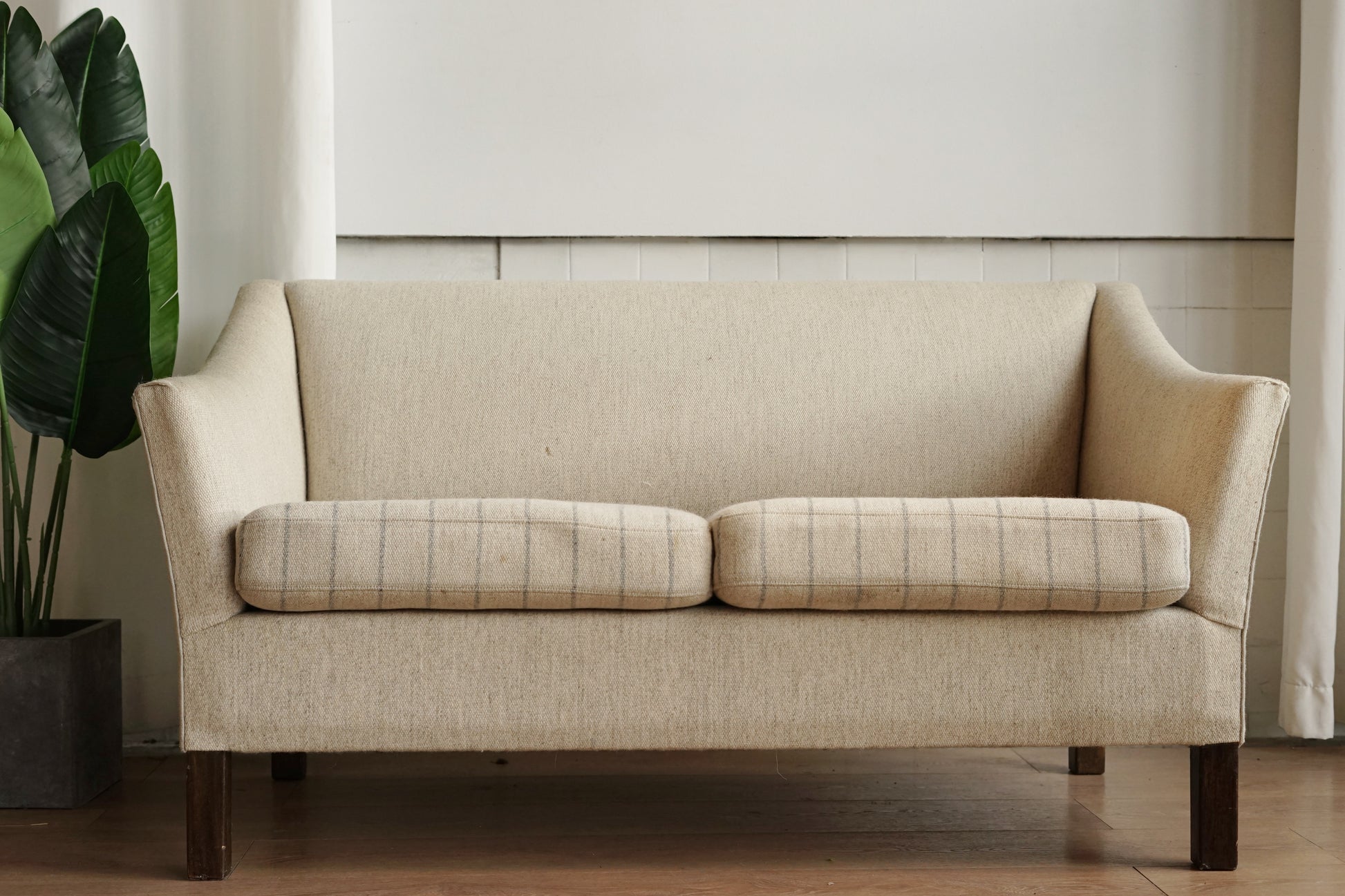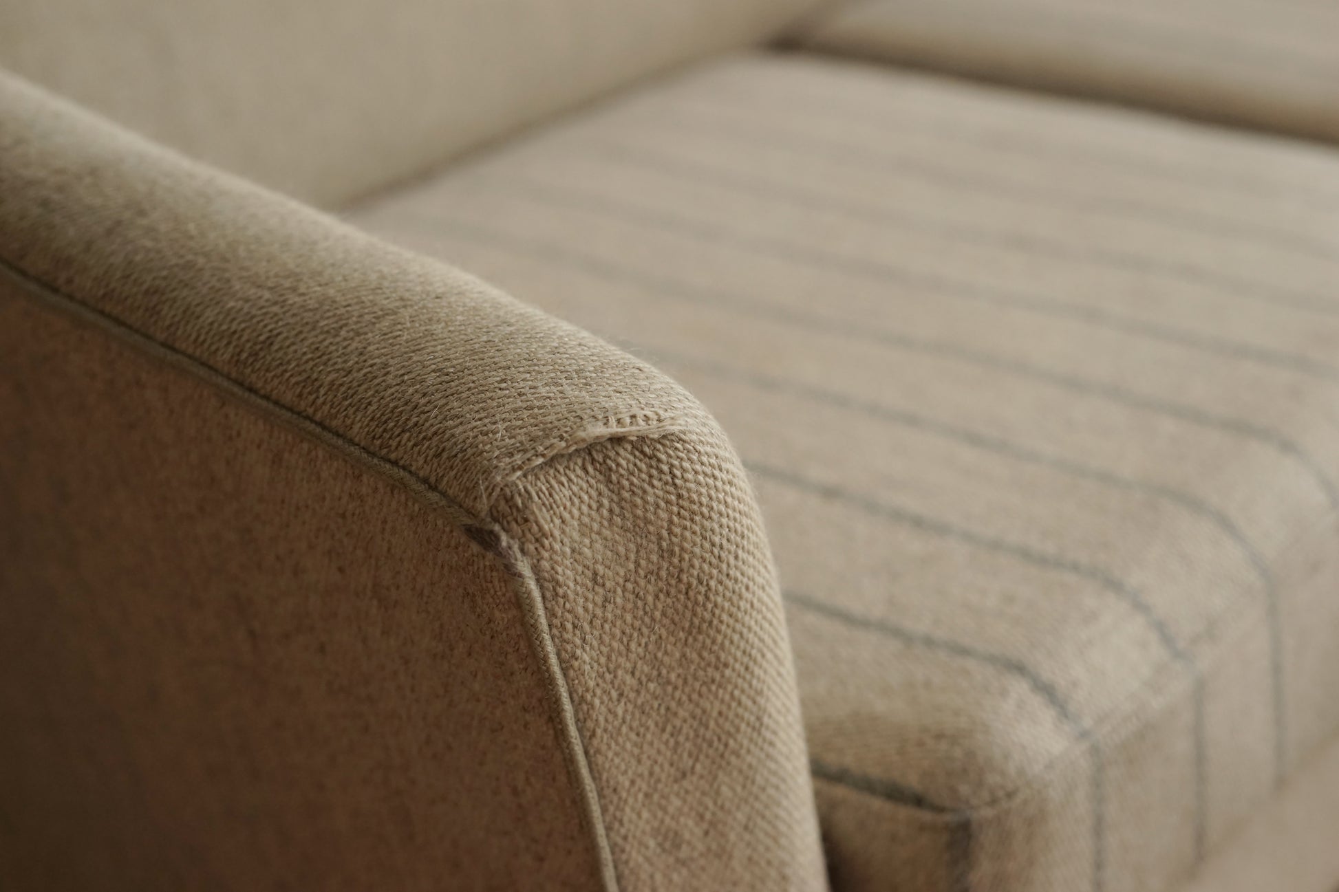 奶油色粗織布面低調帶點雜色感,兩顆坐墊則做成細灰線條的條紋圖案,讓同色系裡多了一點層次。坐墊為可拆式設計,底部為布面承托;下方是深色實木方柱腳,比例偏高,讓整體視覺輕盈,也方便打掃。