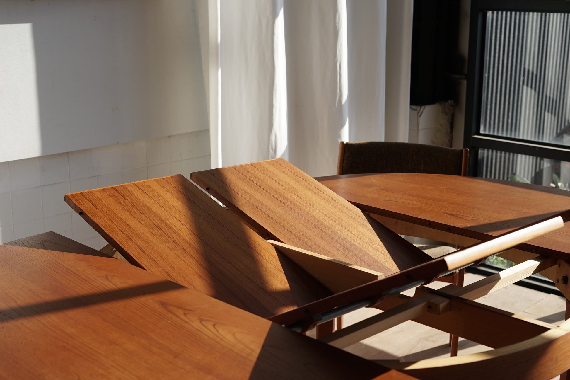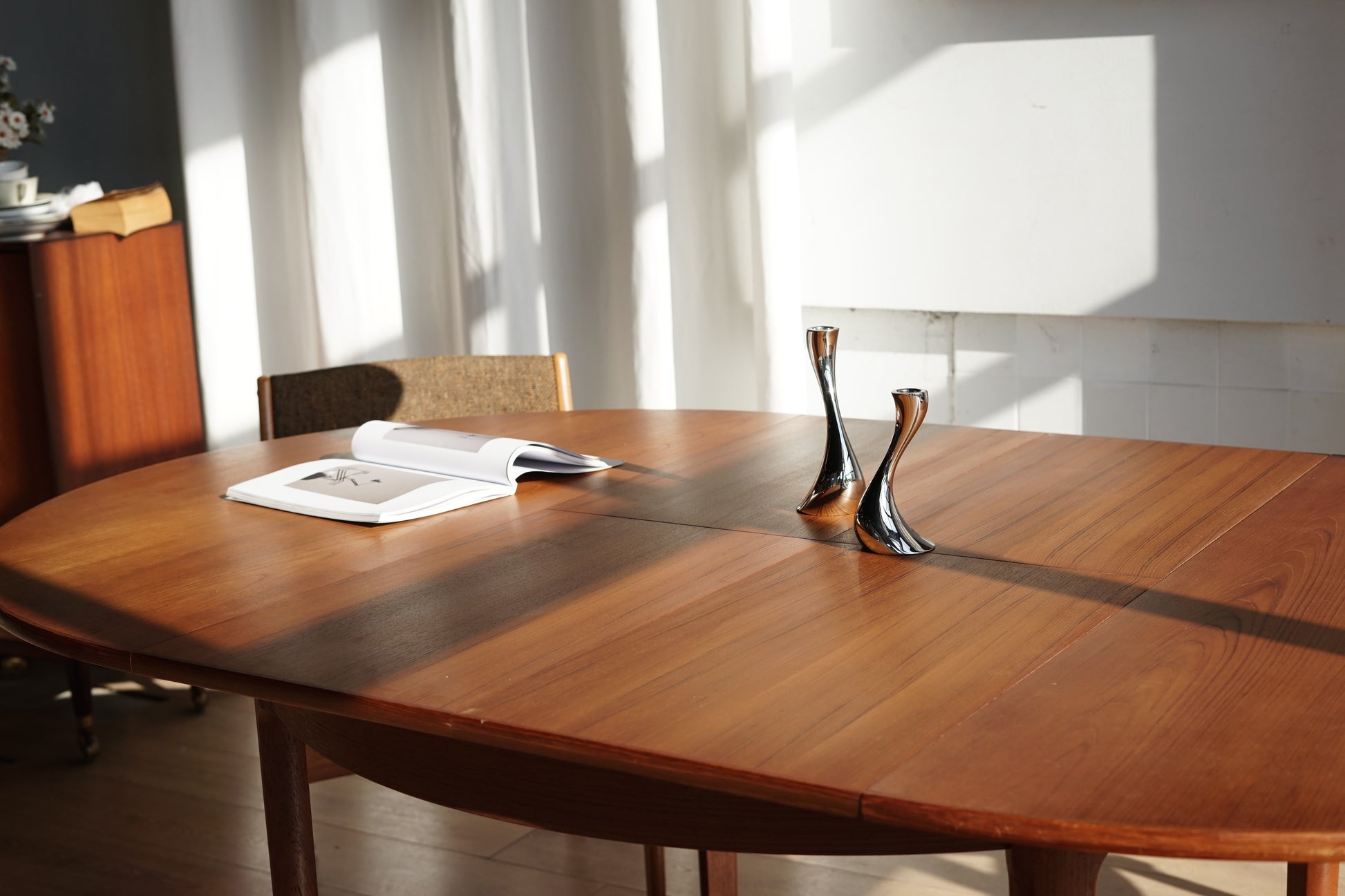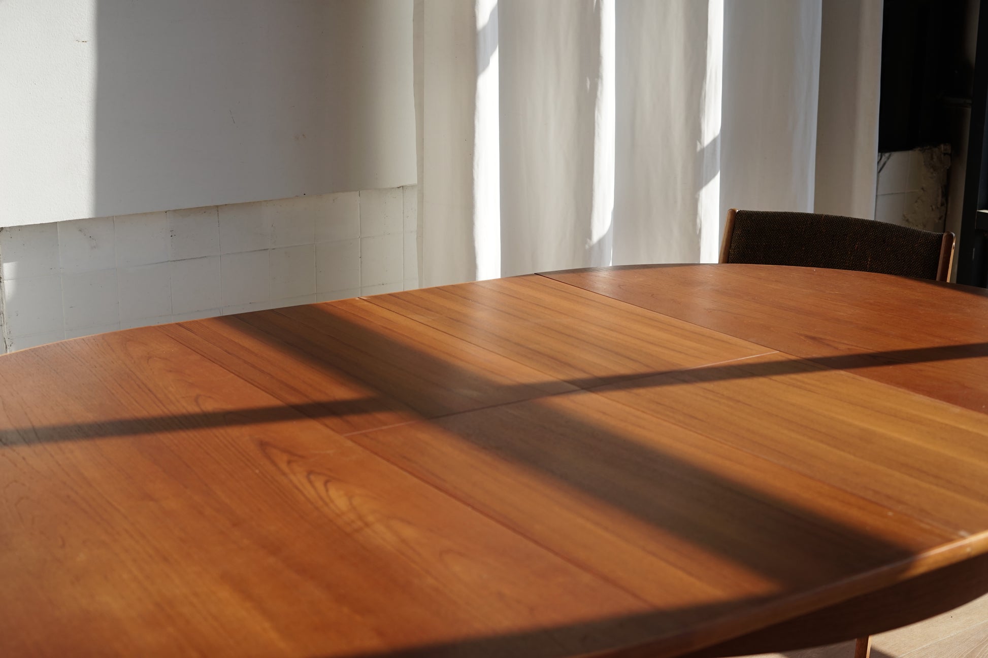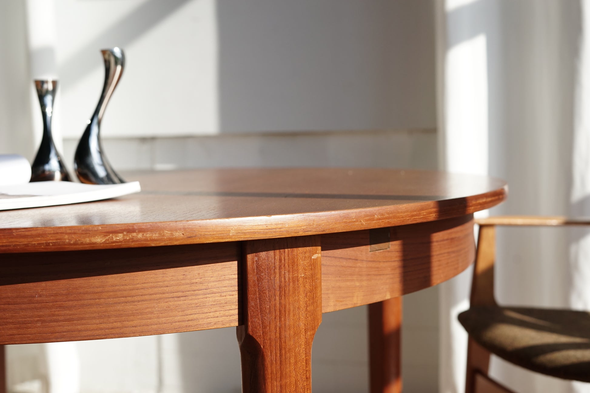 這張餐桌採用溫潤的柚木材質,桌面貼皮呈現細緻的直木紋理,邊緣微作倒角處理,使整體視覺更加溫柔、沒有突兀的硬邊。桌腳為典型丹麥設計的圓錐形/略作錐度木腳,從桌面向下逐漸收細,強調輕盈感。