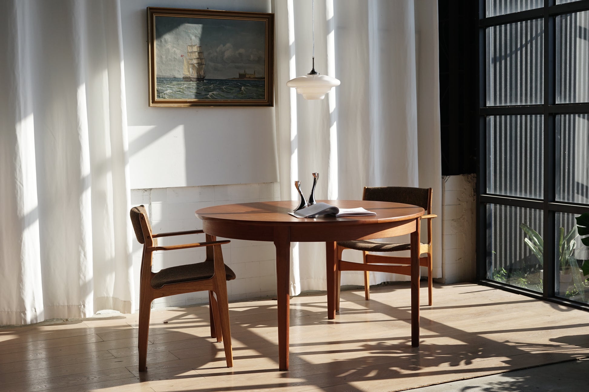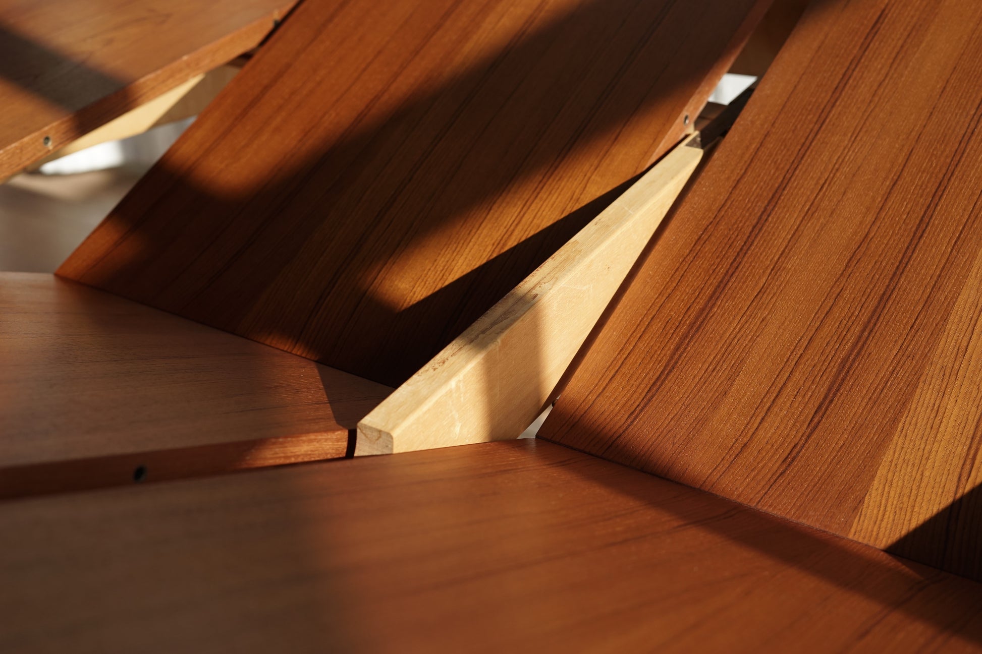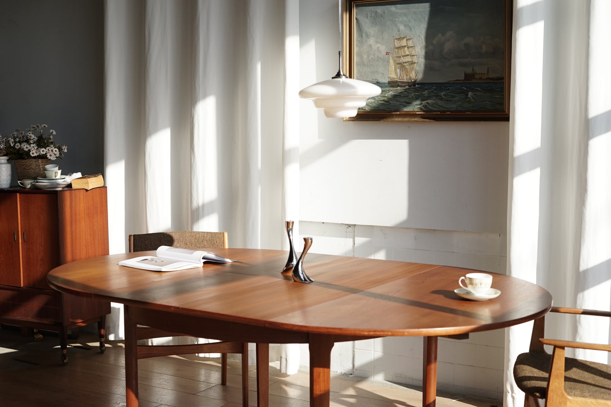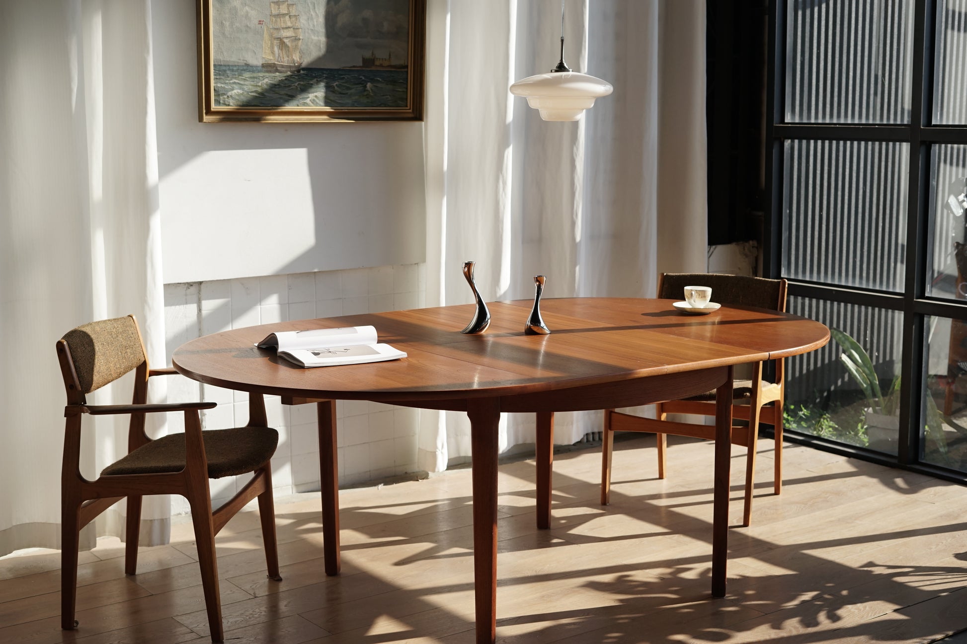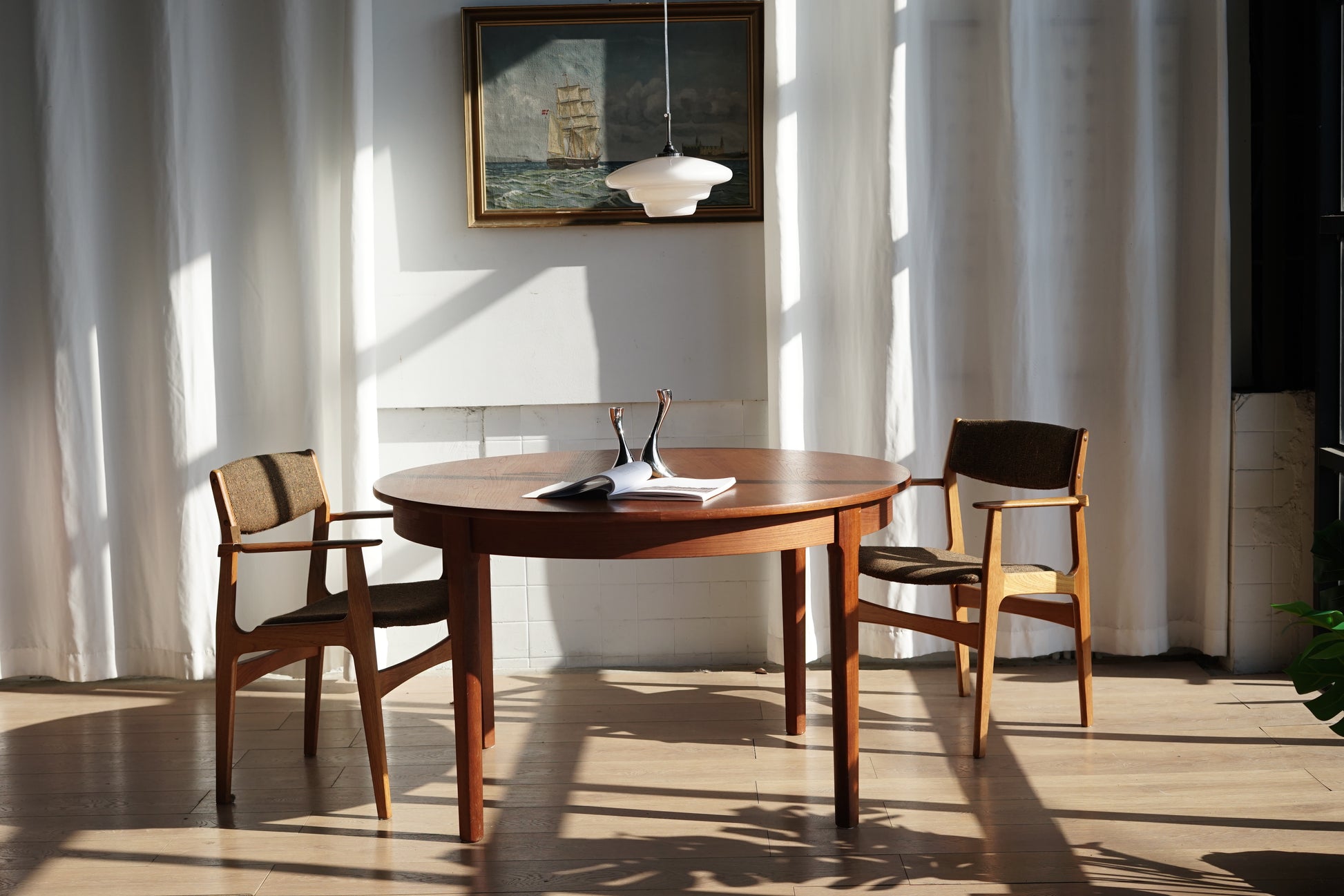 這張餐桌採用溫潤的柚木材質,桌面貼皮呈現細緻的直木紋理,邊緣微作倒角處理,使整體視覺更加溫柔、沒有突兀的硬邊。桌腳為典型丹麥設計的圓錐形/略作錐度木腳,從桌面向下逐漸收細,強調輕盈感。