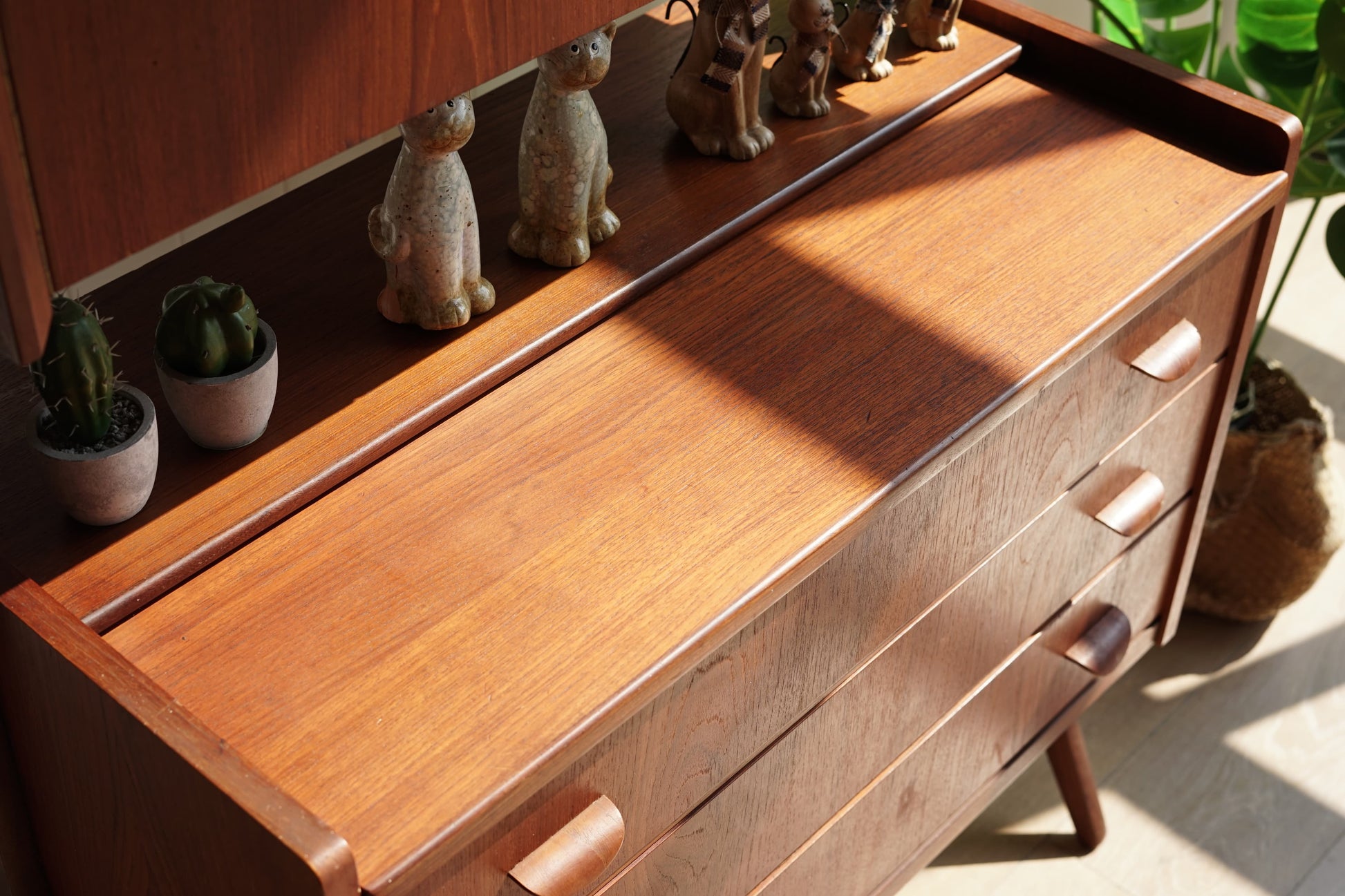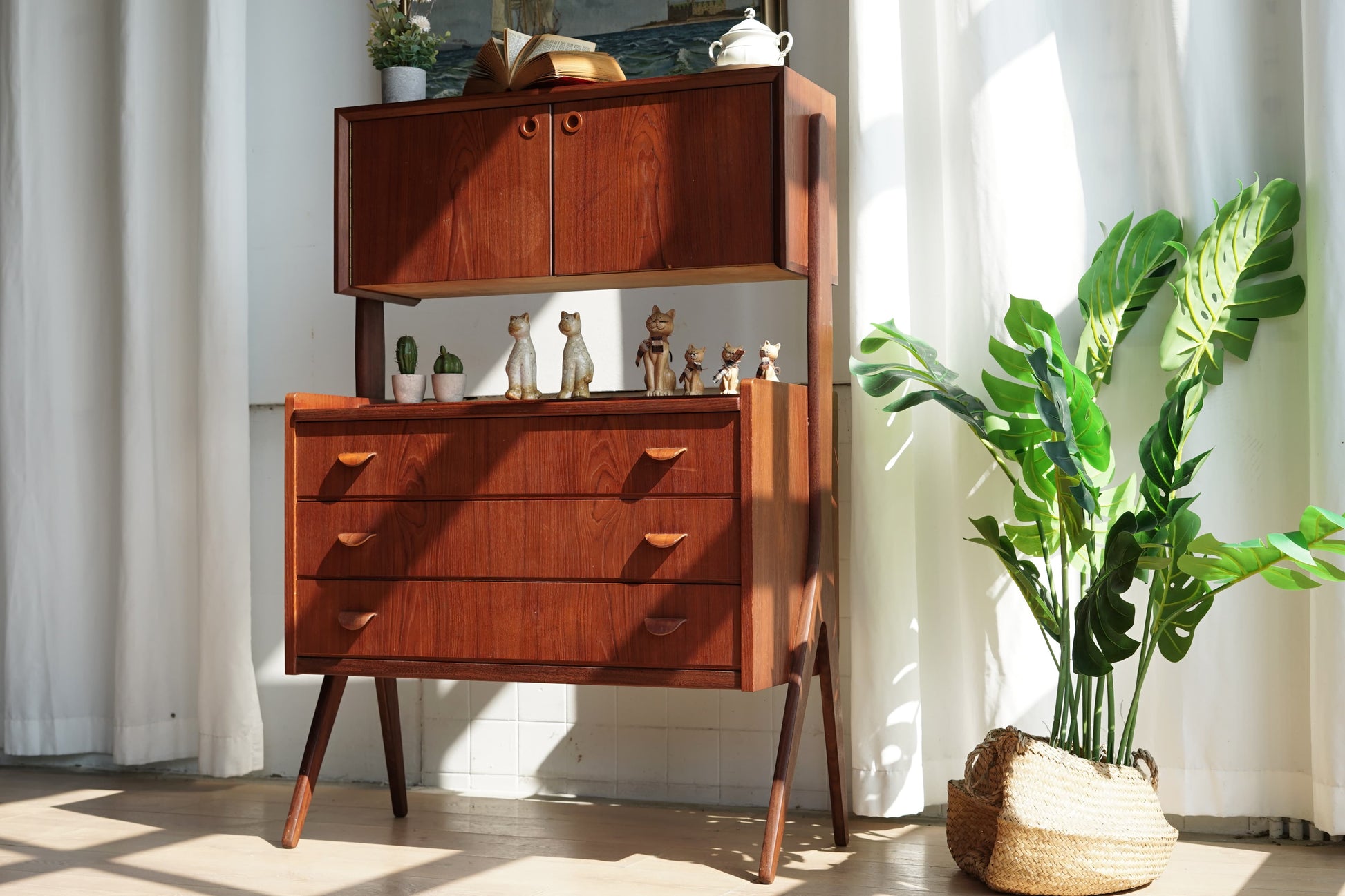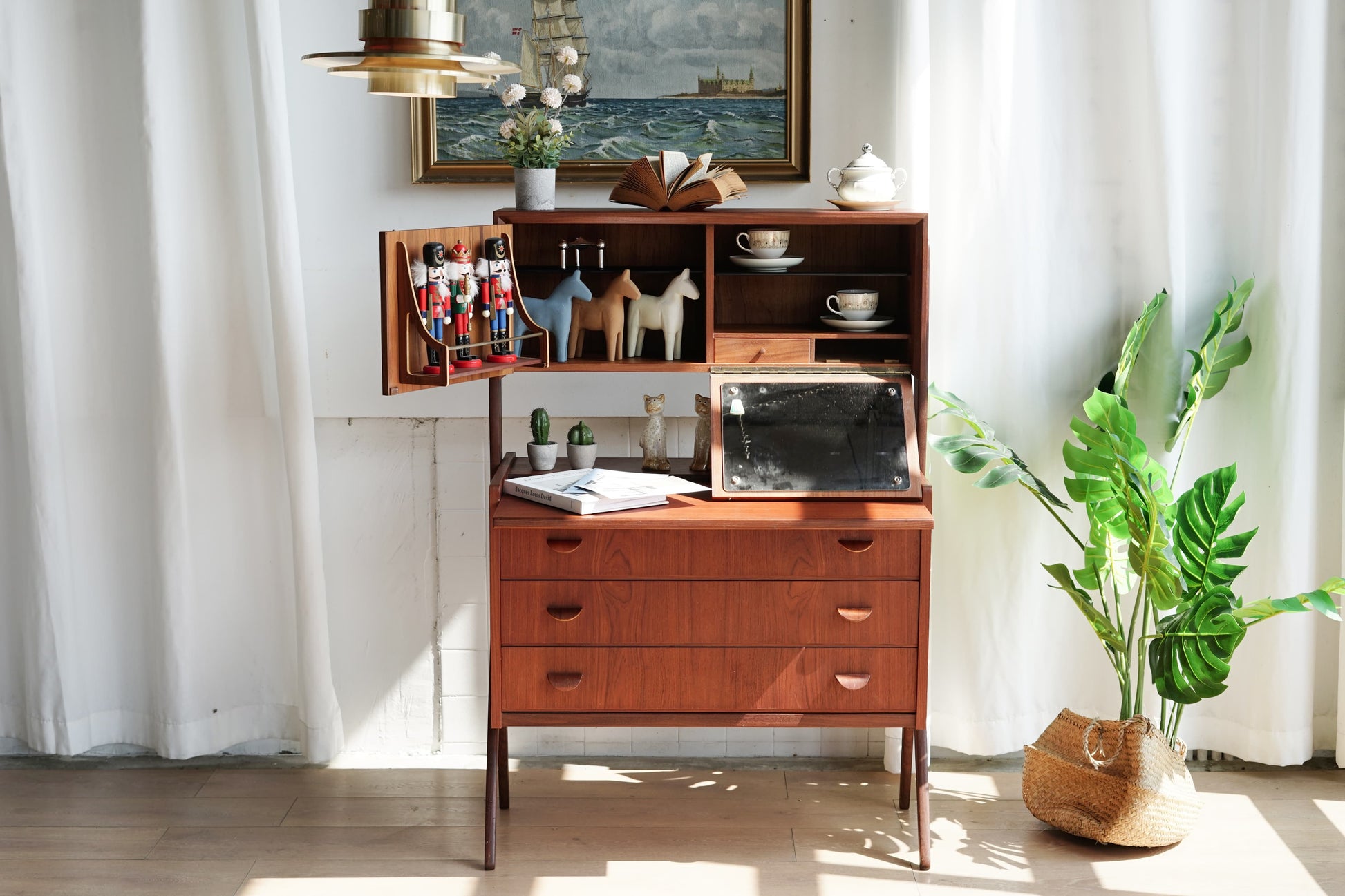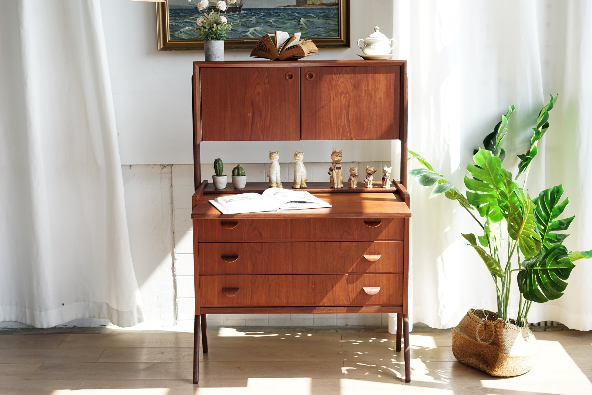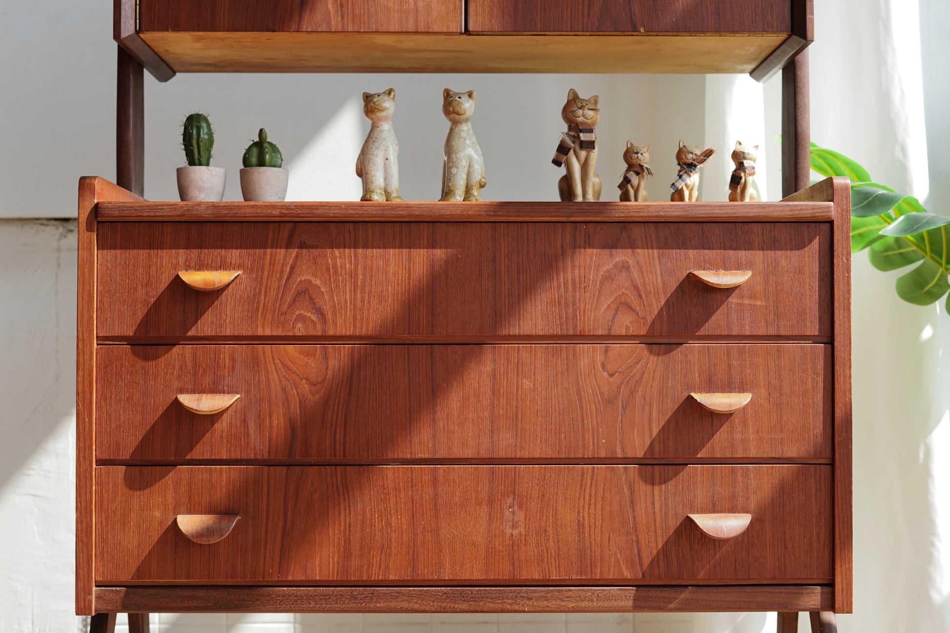 這款丹麥柚木多功能寫字櫃,設計典雅,線條俐落,展現1960年代北歐家具的溫潤質感。櫃體分為上下兩部分,下方配置三個容量寬敞的抽屜,搭配簡約弧形把手,兼具收納與美觀。