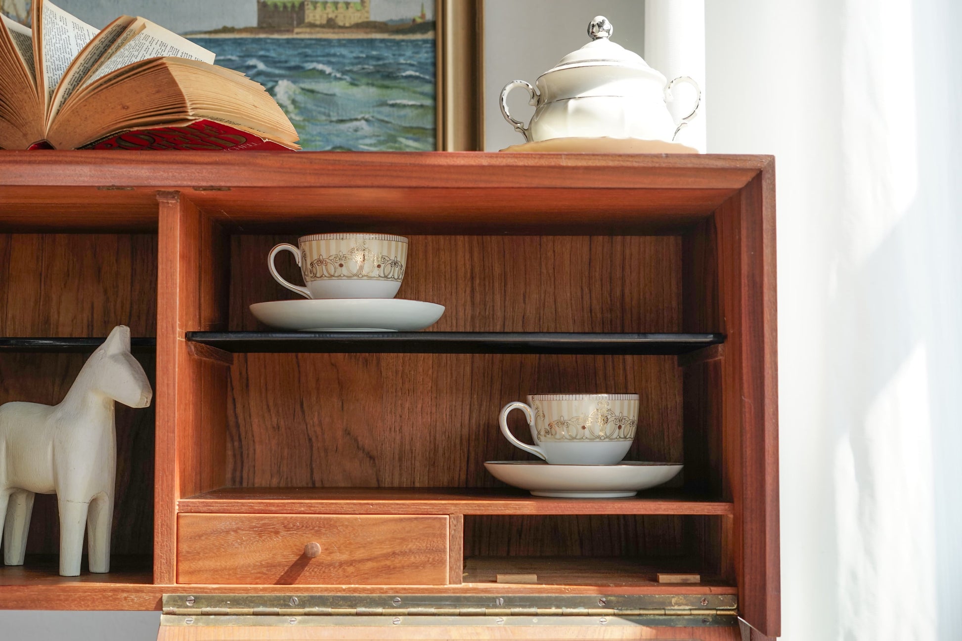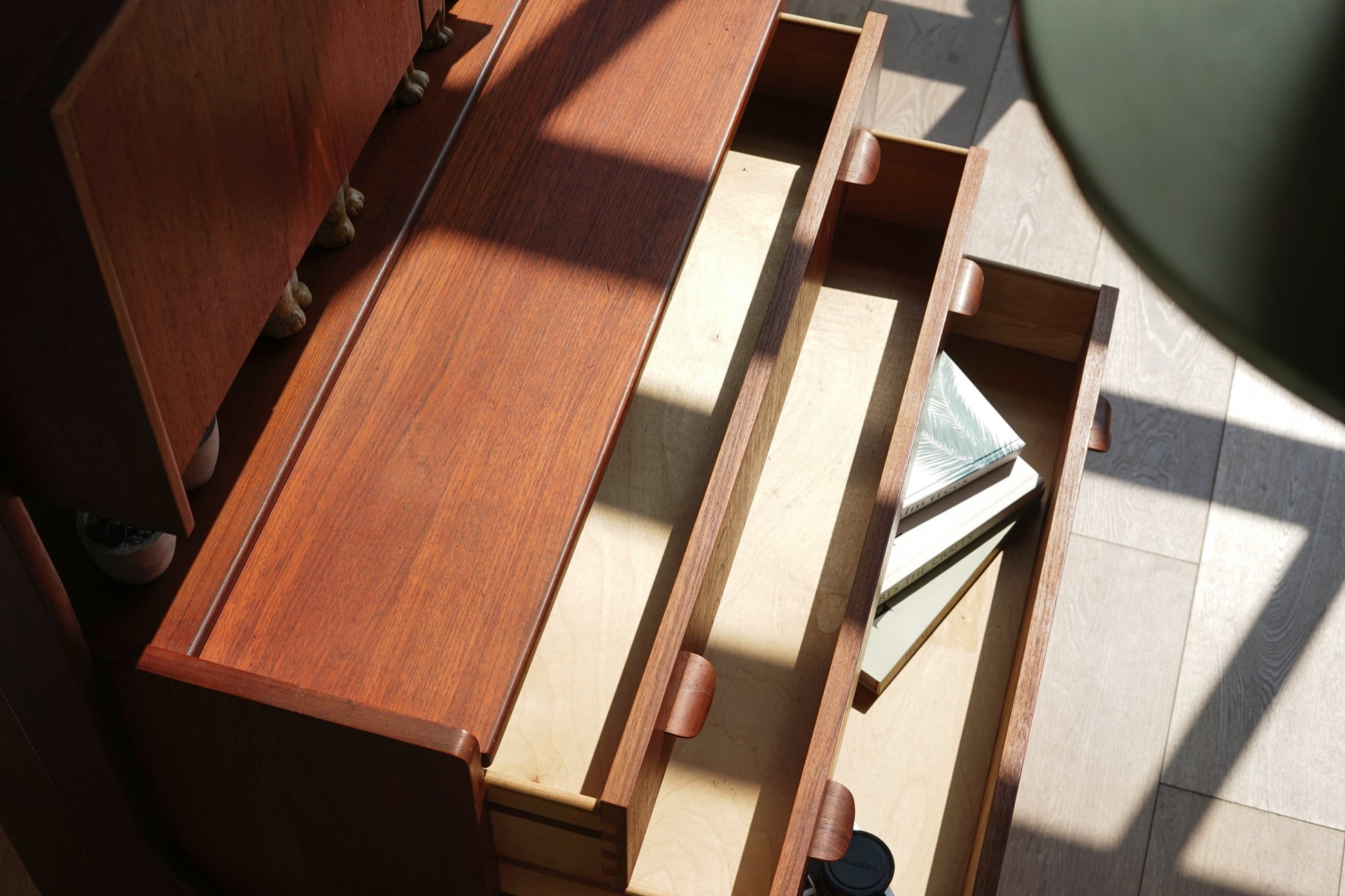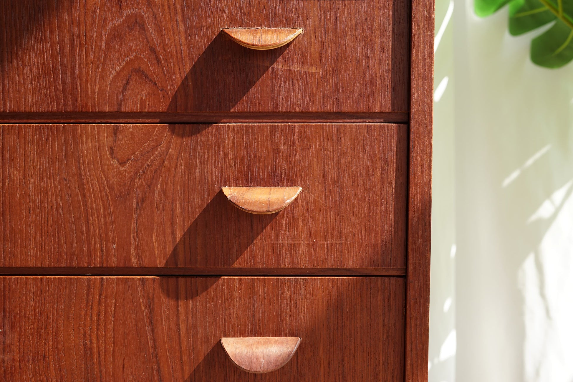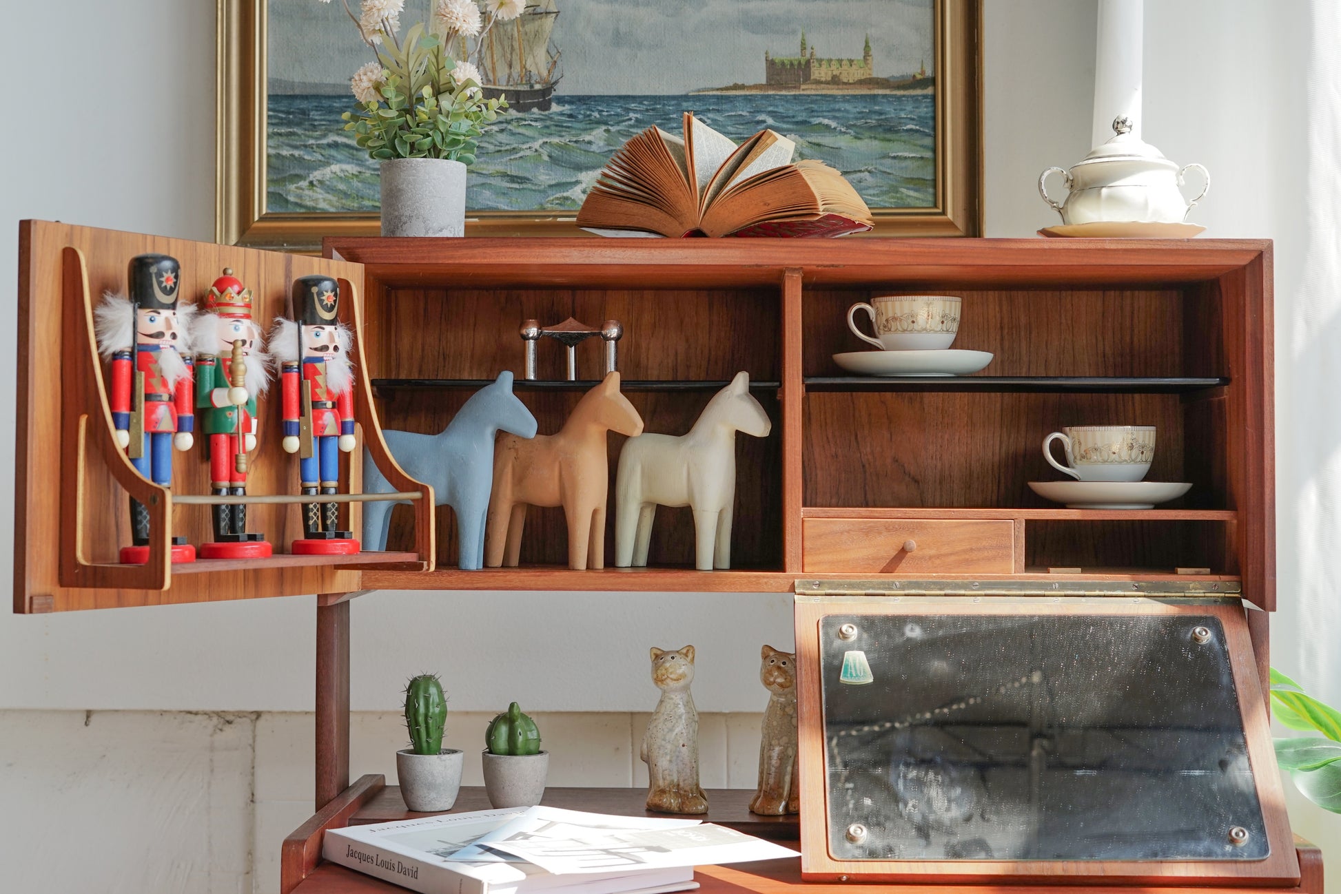 這款丹麥柚木多功能寫字櫃,設計典雅,線條俐落,展現1960年代北歐家具的溫潤質感。櫃體分為上下兩部分,下方配置三個容量寬敞的抽屜,搭配簡約弧形把手,兼具收納與美觀。