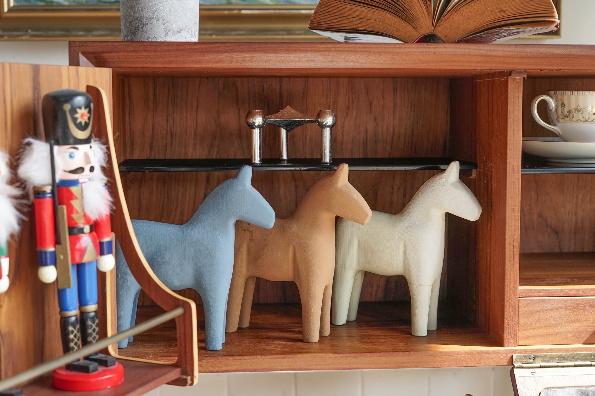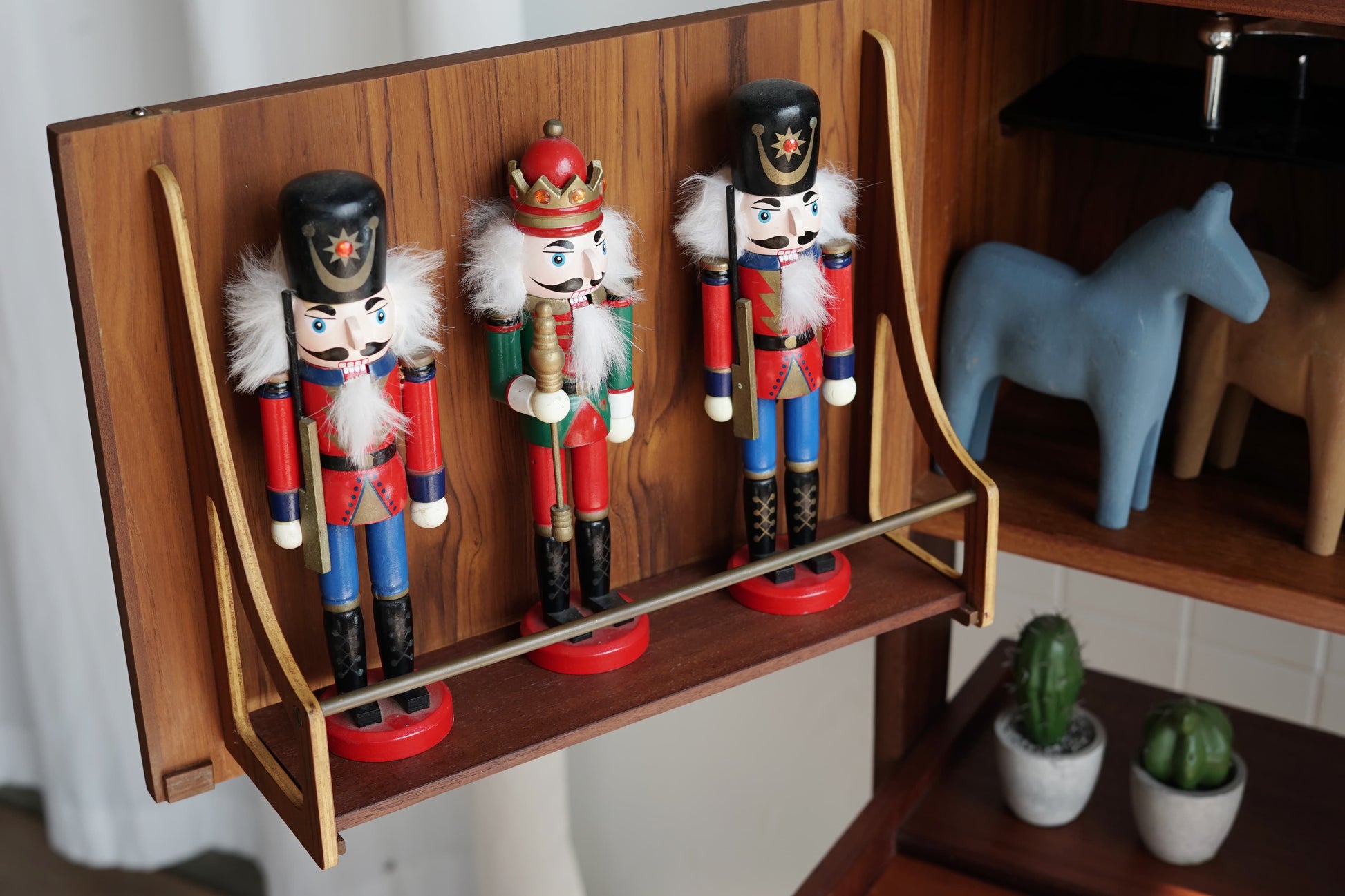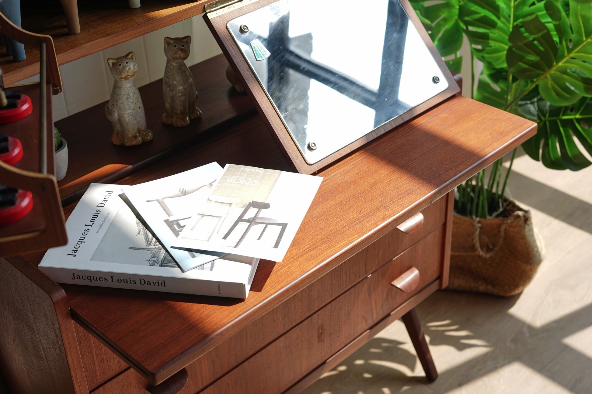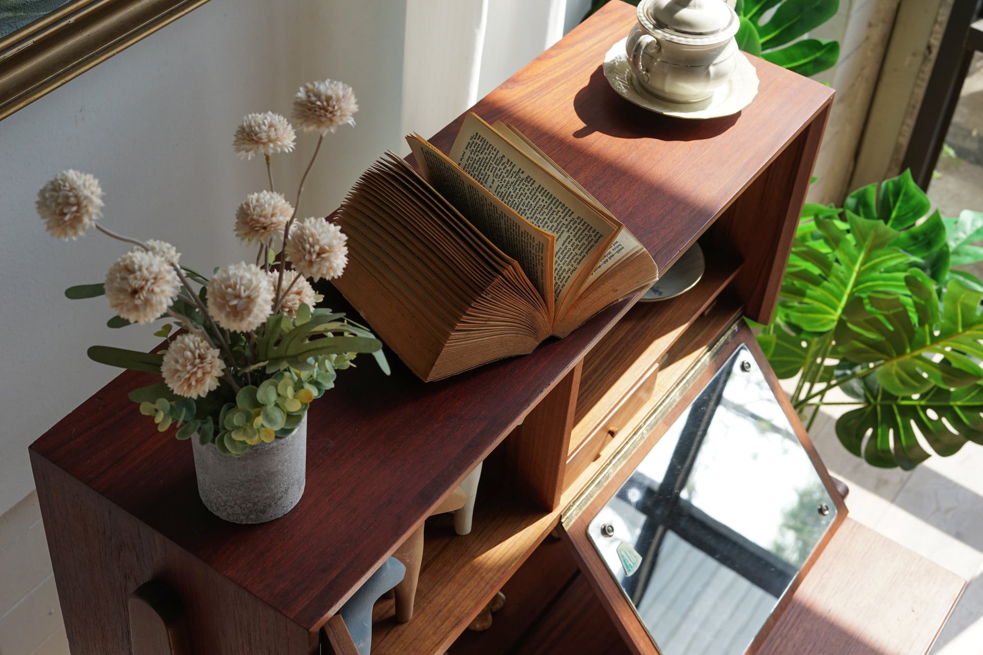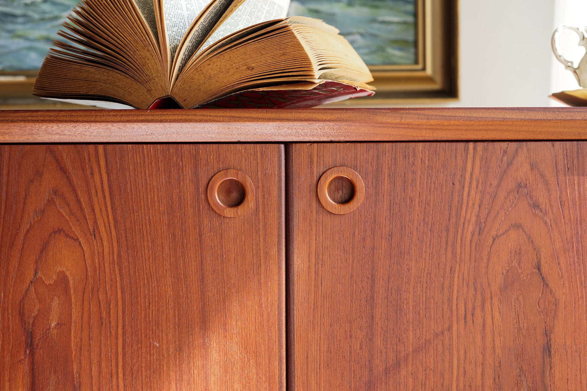 這款丹麥柚木多功能寫字櫃,設計典雅,線條俐落,展現1960年代北歐家具的溫潤質感。櫃體分為上下兩部分,下方配置三個容量寬敞的抽屜,搭配簡約弧形把手,兼具收納與美觀。