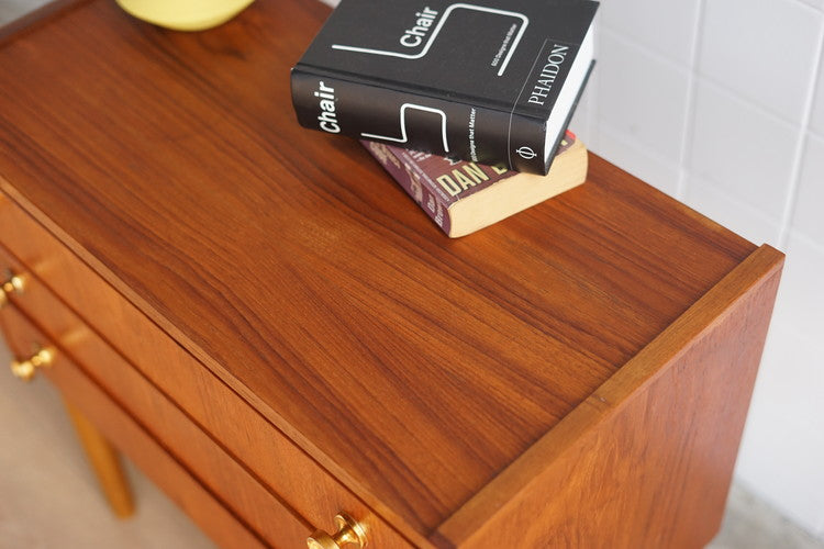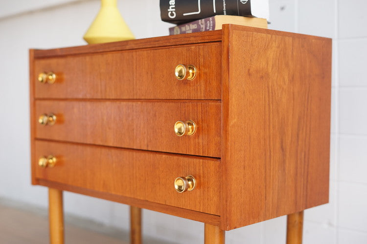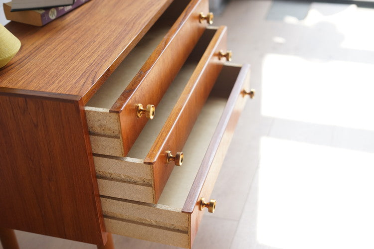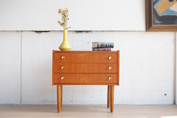 柚木紋理細緻高雅,高腳設計襯托著輕巧小邊櫃,清爽又簡潔大方, 黃銅色的把手好看又好拉,簡單的櫃型設計為整體空間加分不少。
