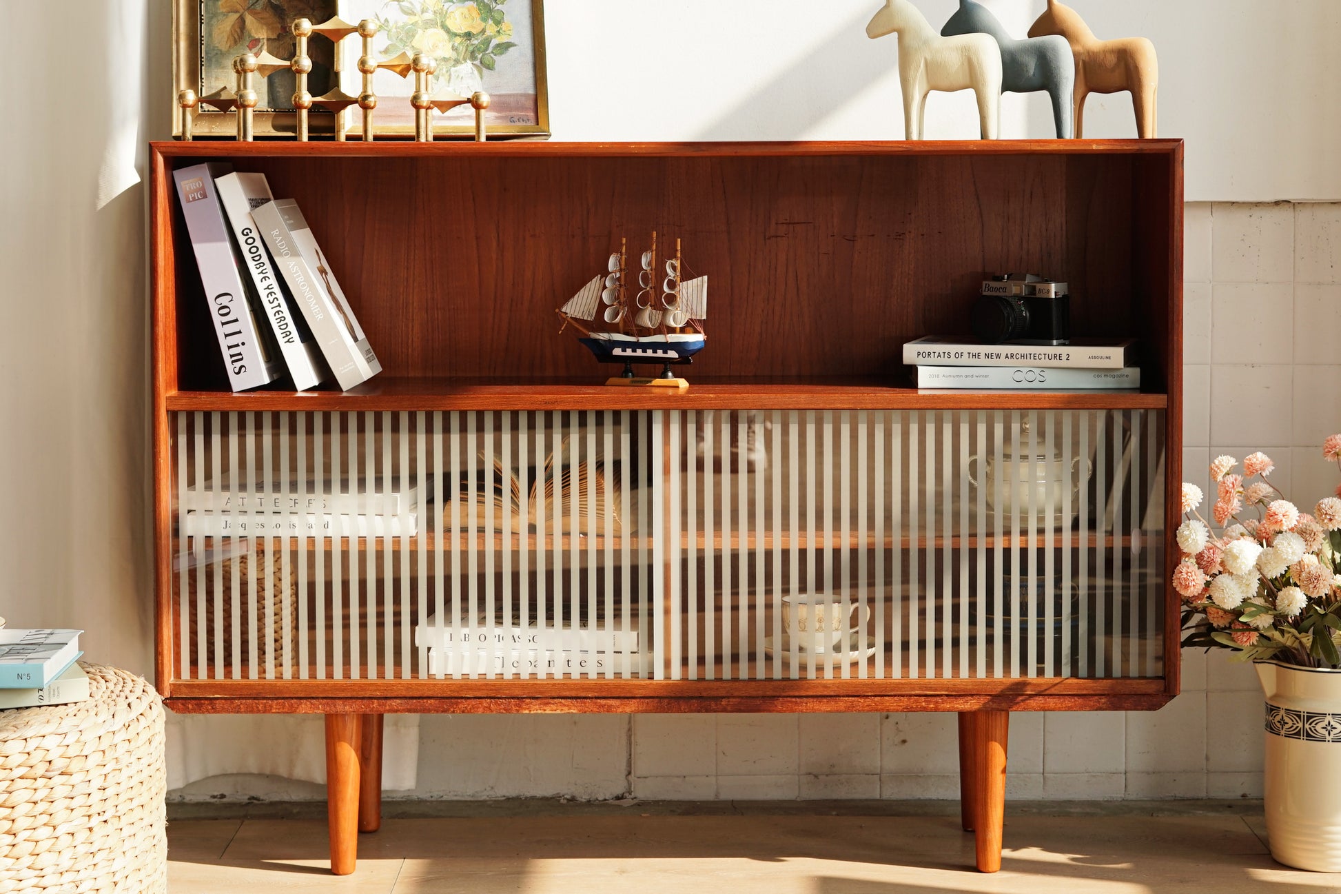 上半部為開放式層架(適合擺放書籍、相機或小物),下半部為左右滑動的條紋半透玻璃門,能遮擋視線又保留光感;整體為溫潤的柚木色澤,四支圓錐形實木腳使櫃體離地、視覺更輕盈。