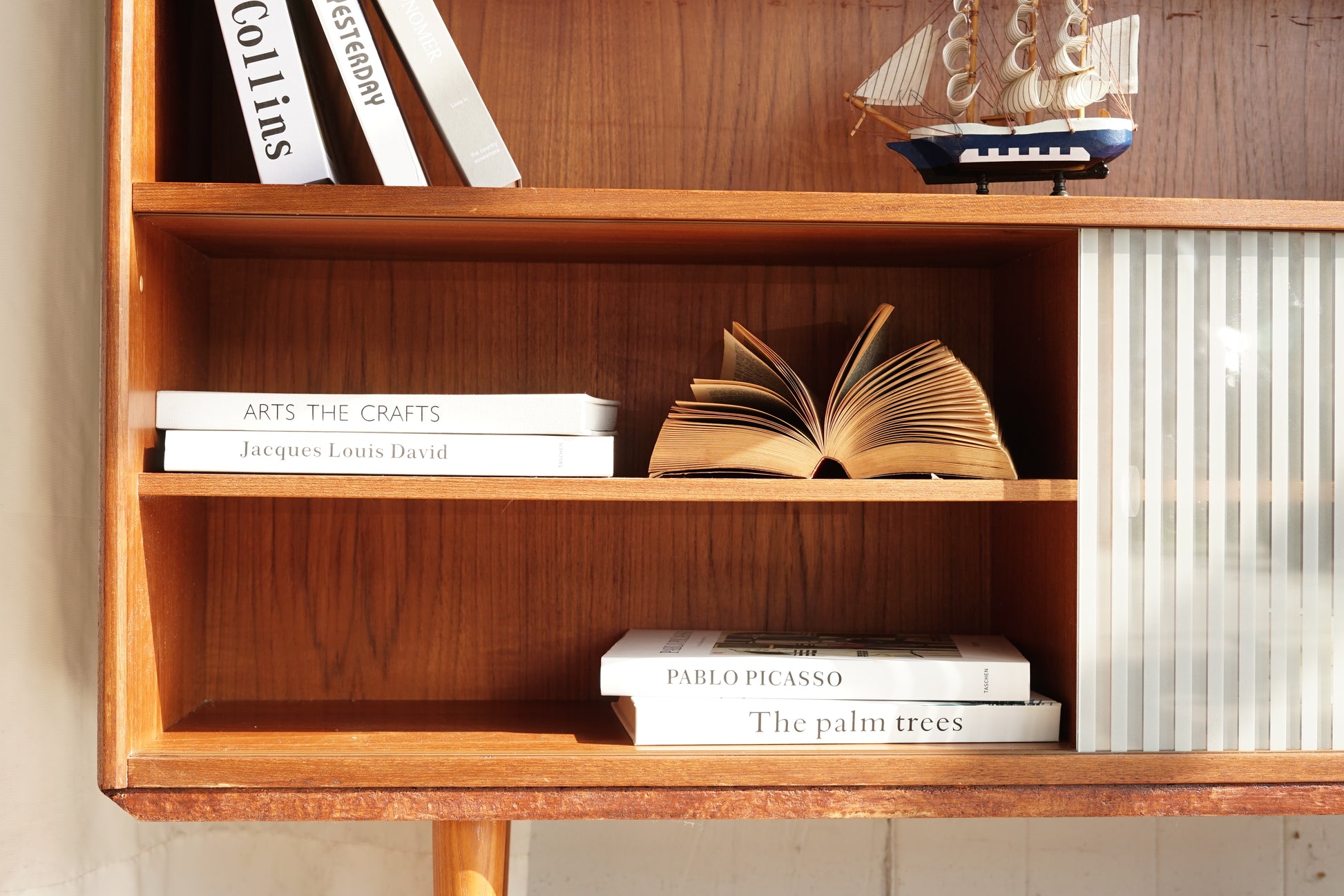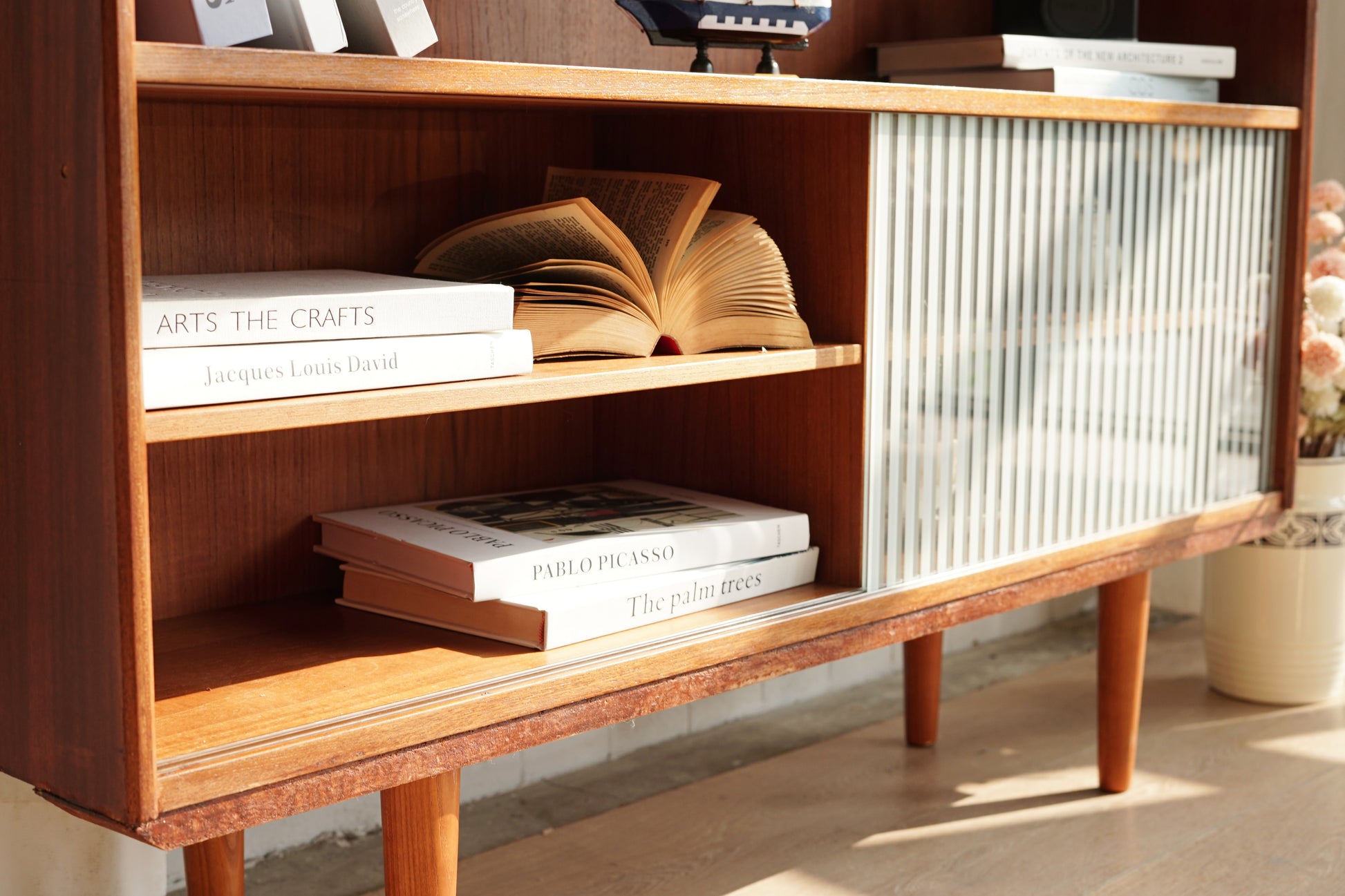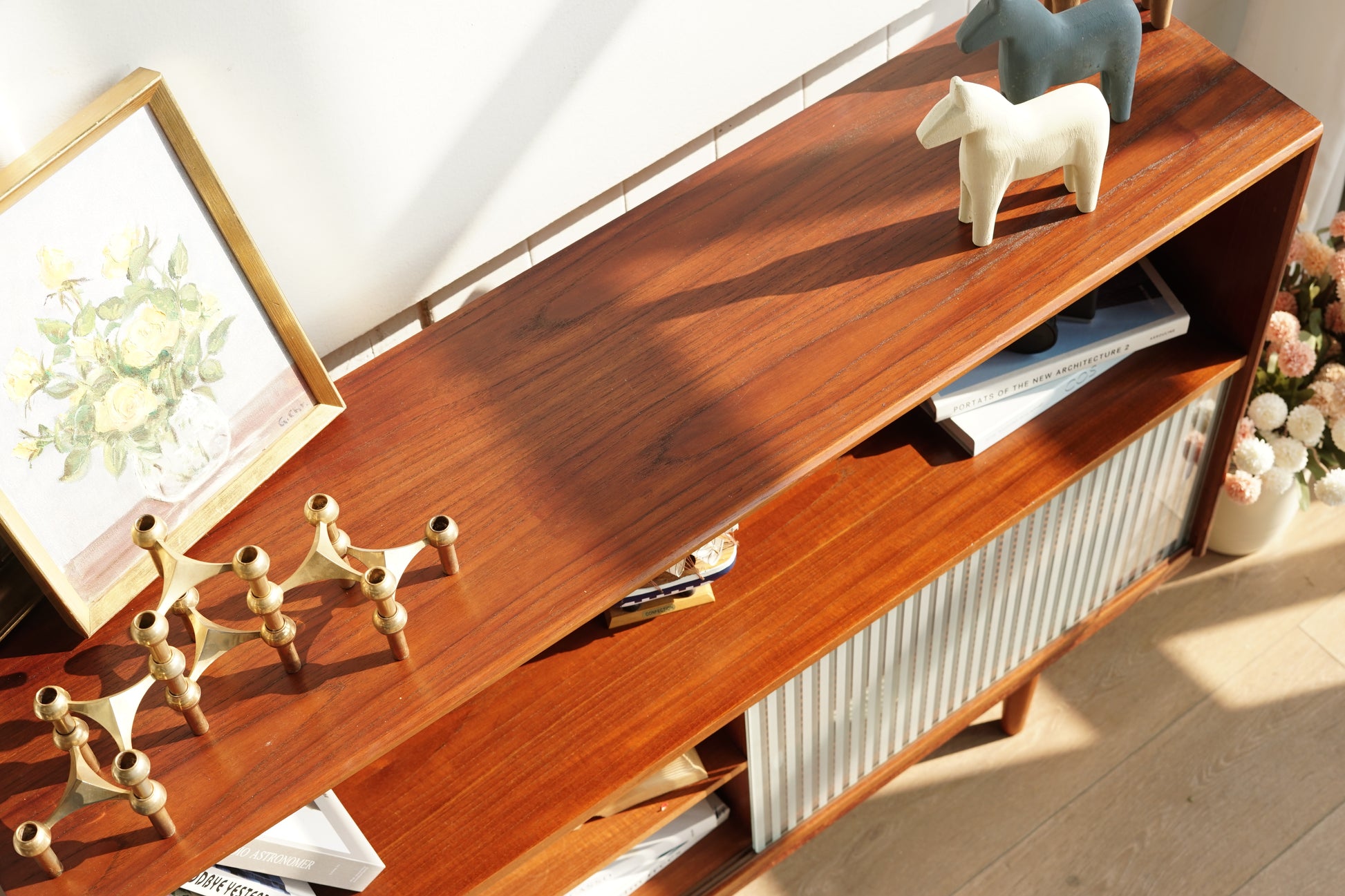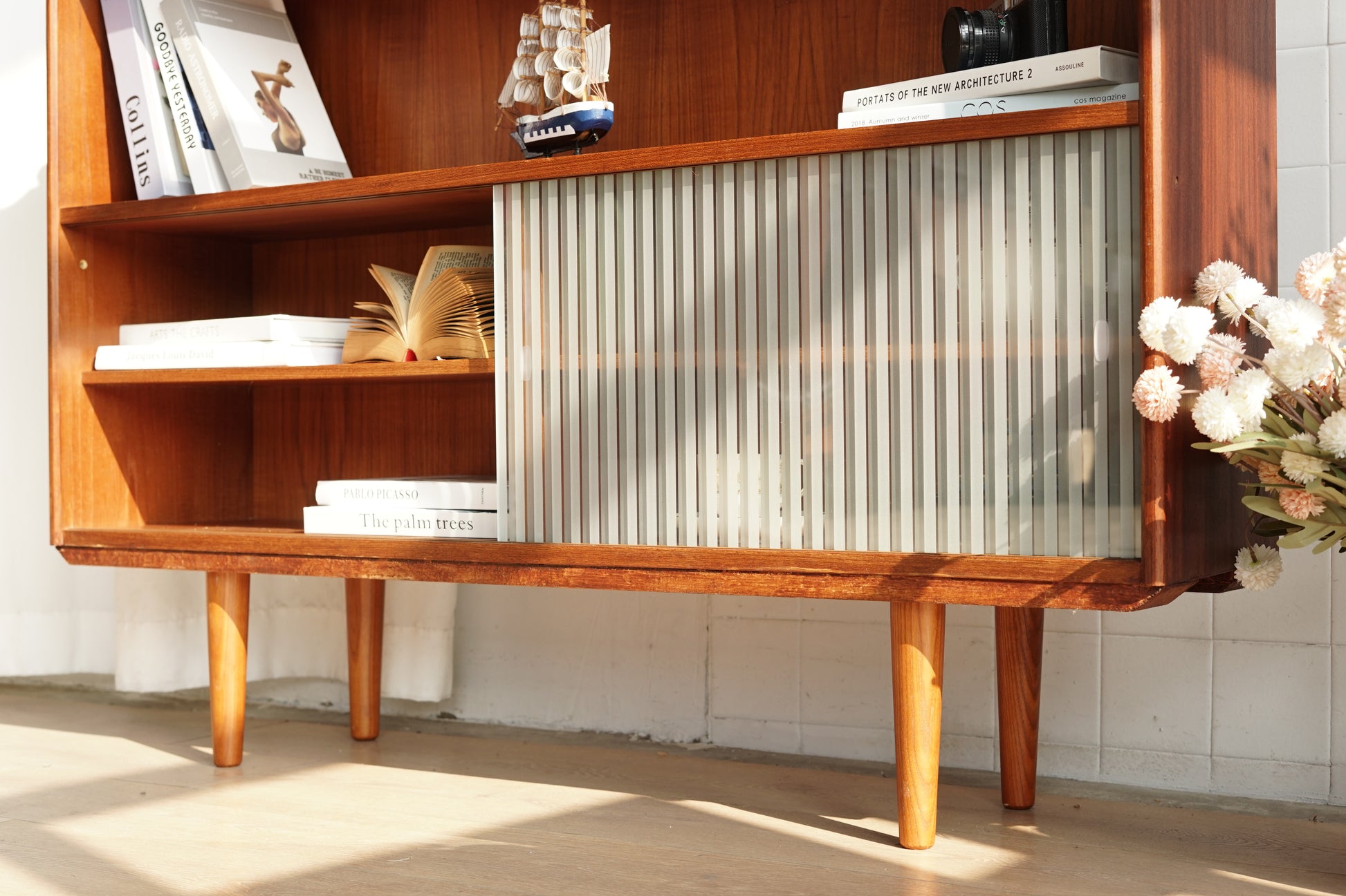 此種「柚木框體+滑動玻璃門」的配置,是1960年代丹麥收納家具的典型語彙;同年代大量可見的丹麥柚木書櫃亦多採滑門與開放層架的組合,用於兼顧展示與防塵。