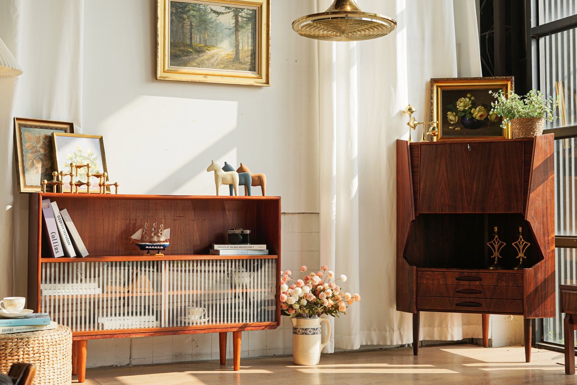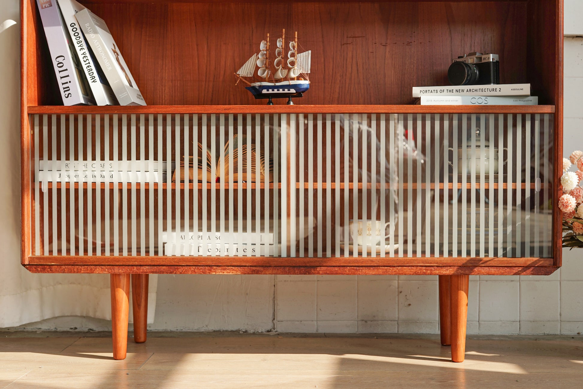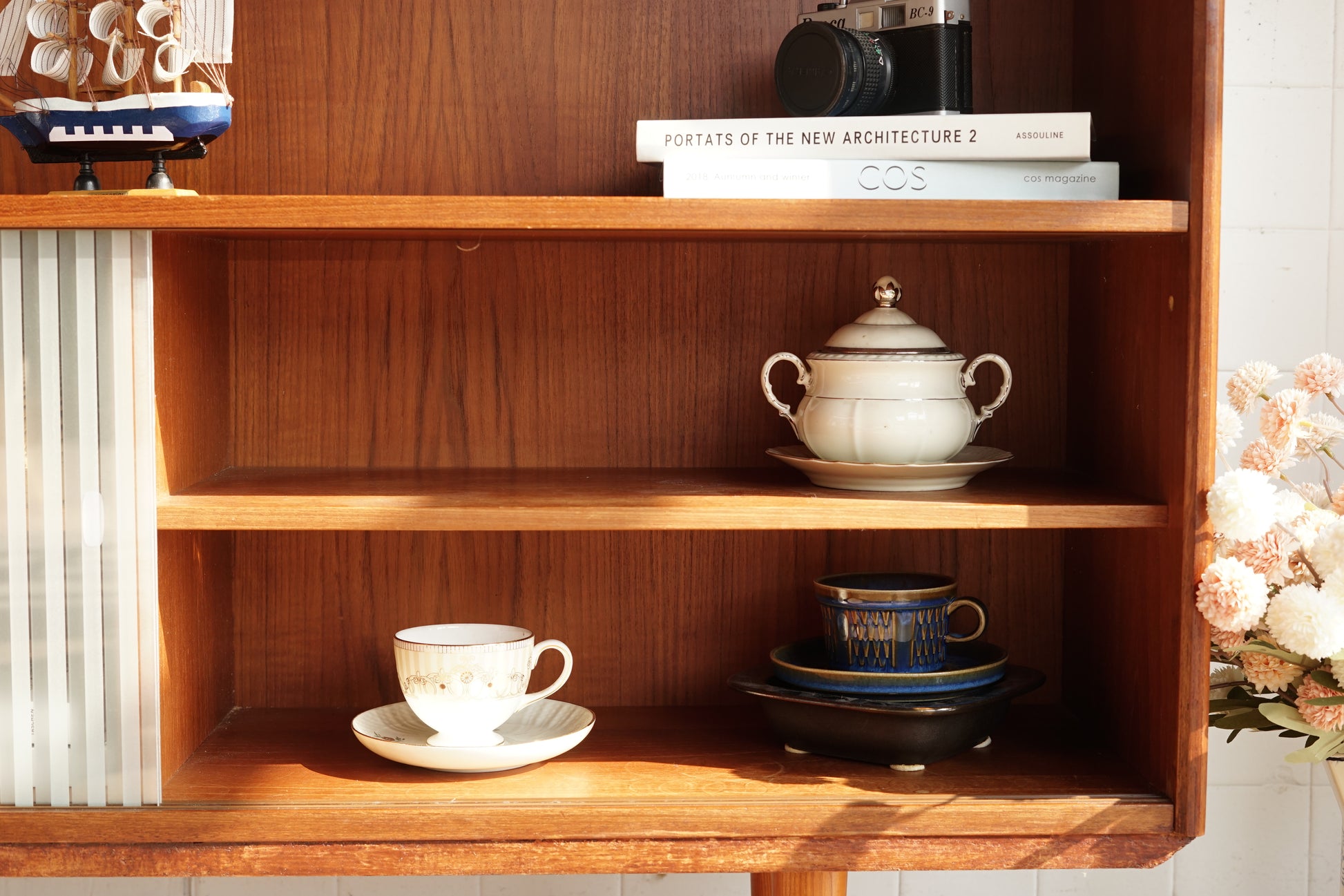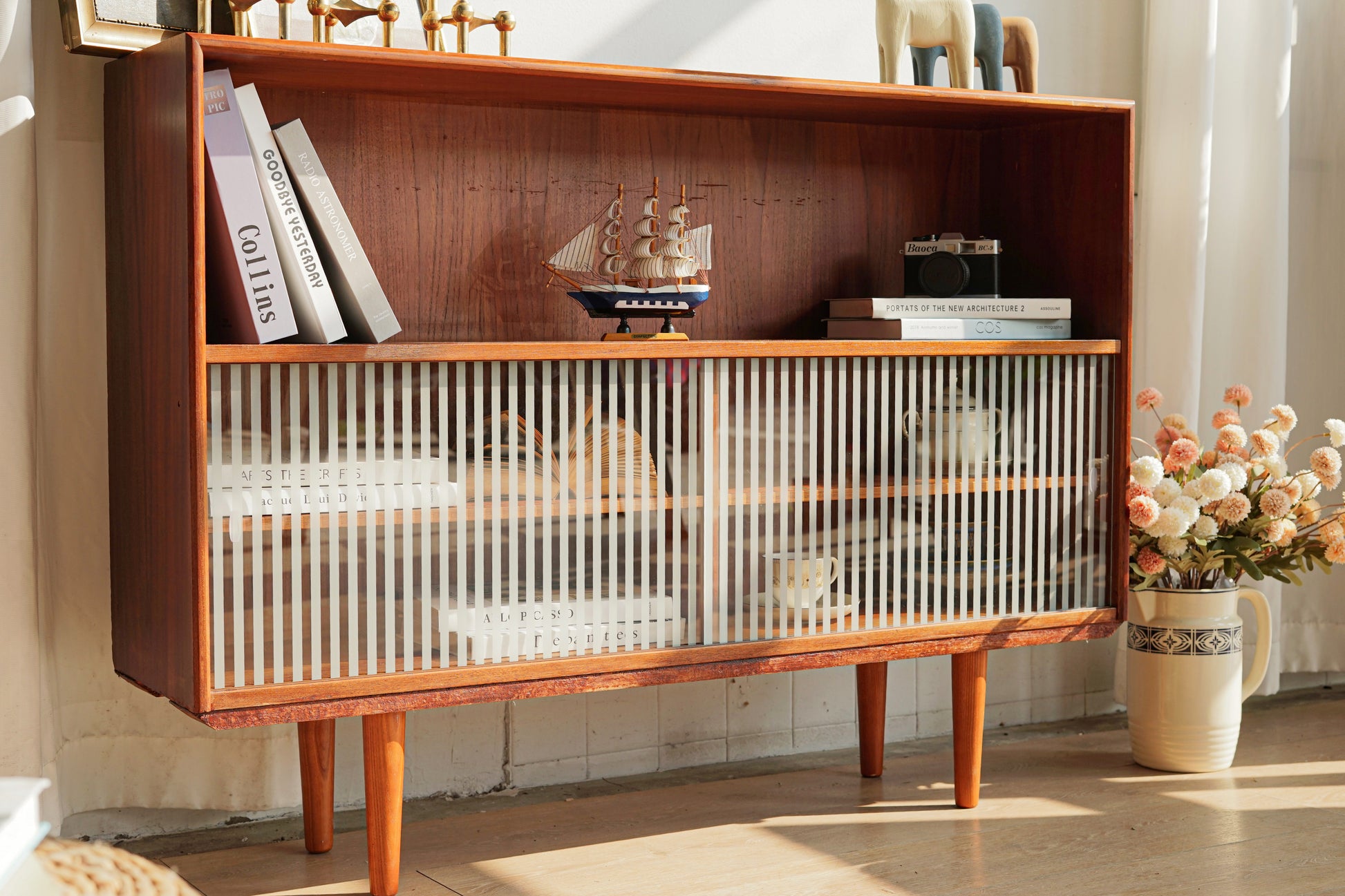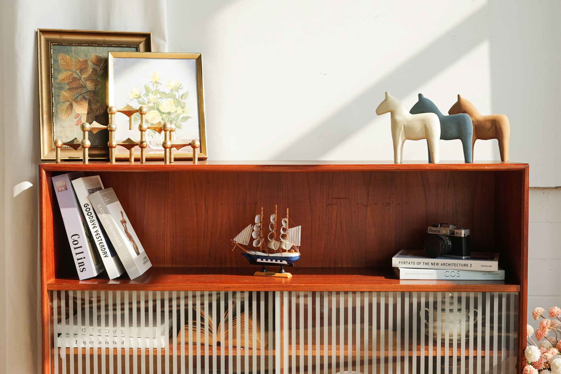 此種「柚木框體+滑動玻璃門」的配置,是1960年代丹麥收納家具的典型語彙;同年代大量可見的丹麥柚木書櫃亦多採滑門與開放層架的組合,用於兼顧展示與防塵。