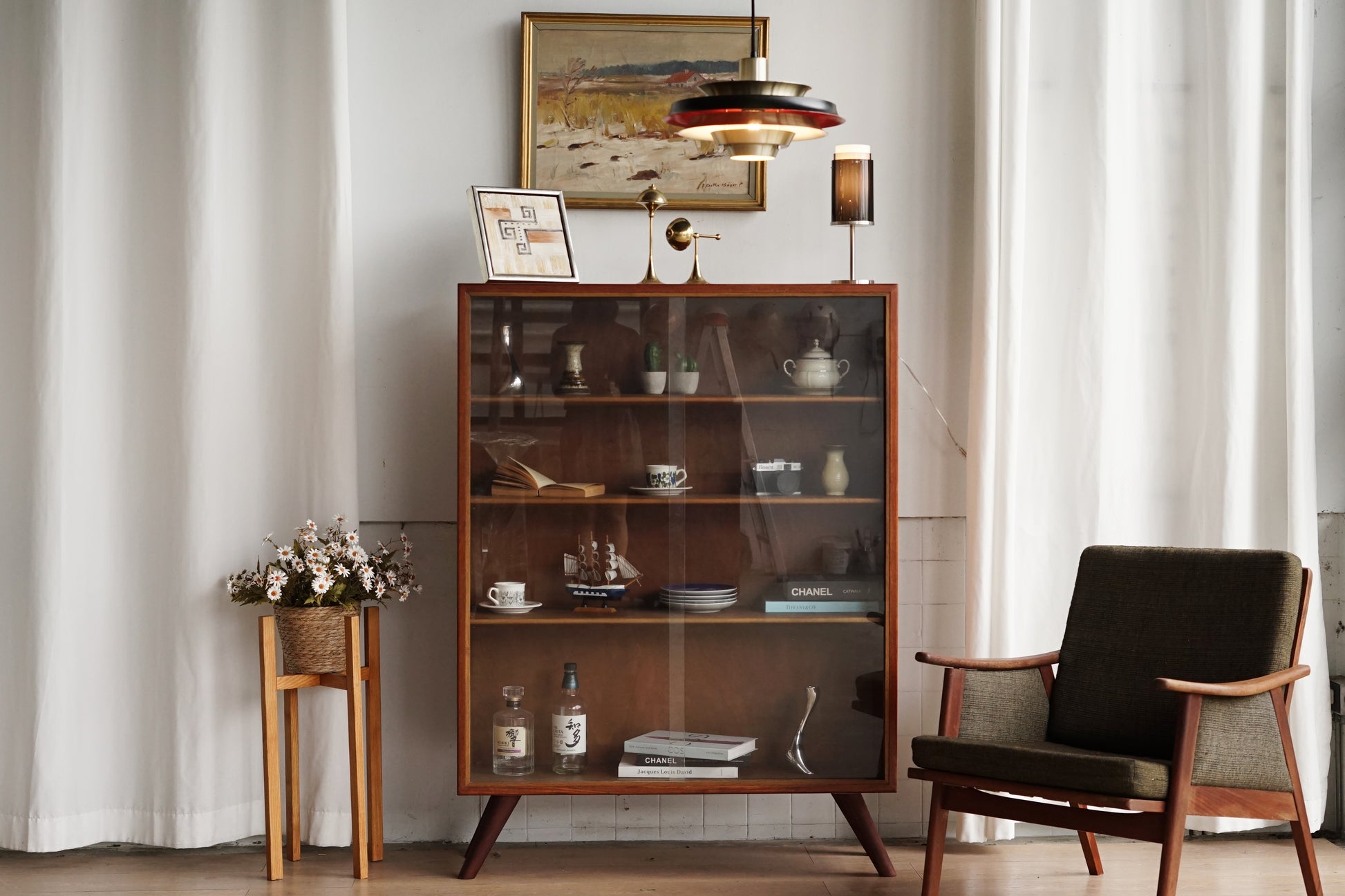 丹麥 柚木 玻璃 滑門 高腳 展示櫃