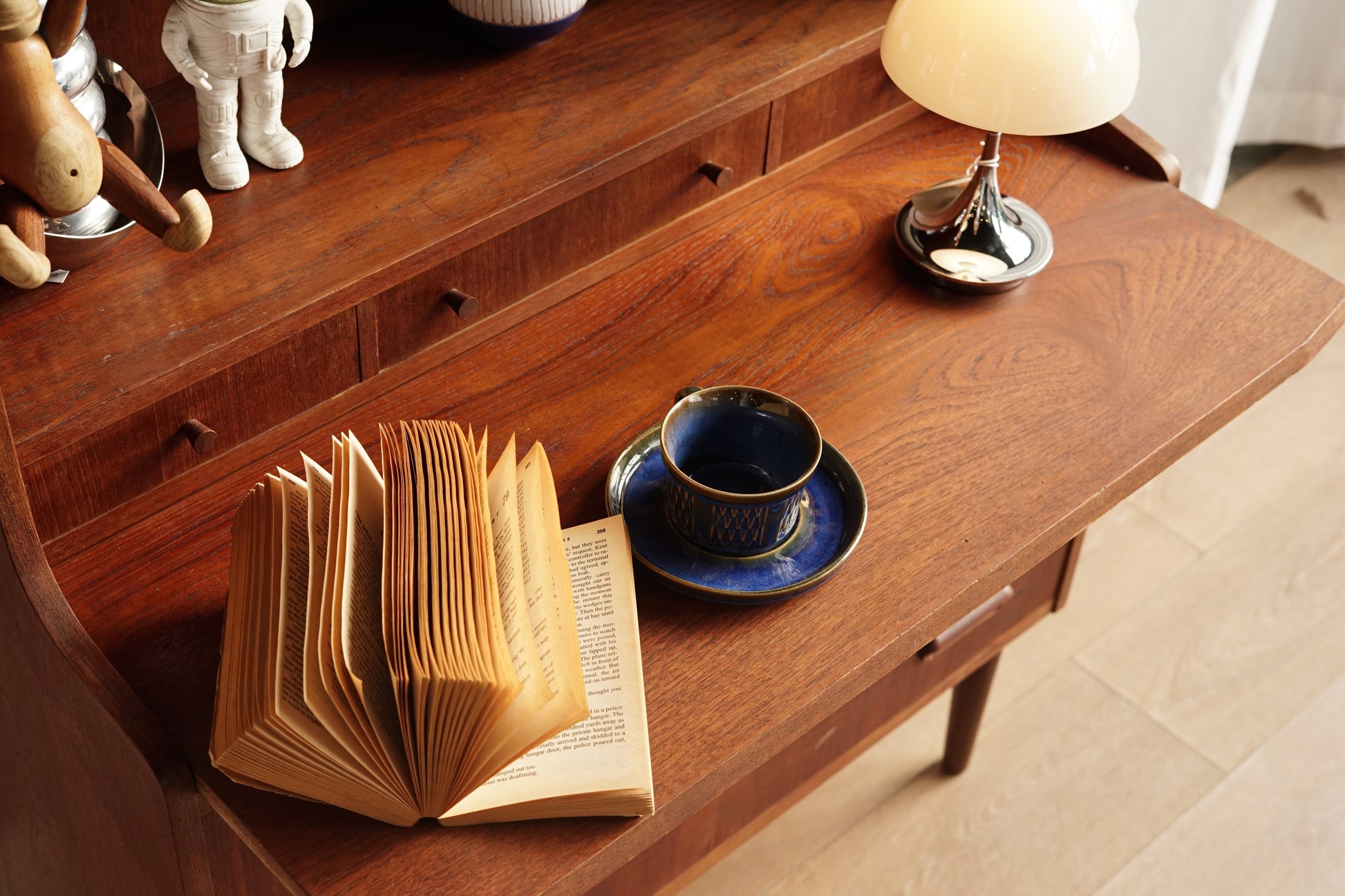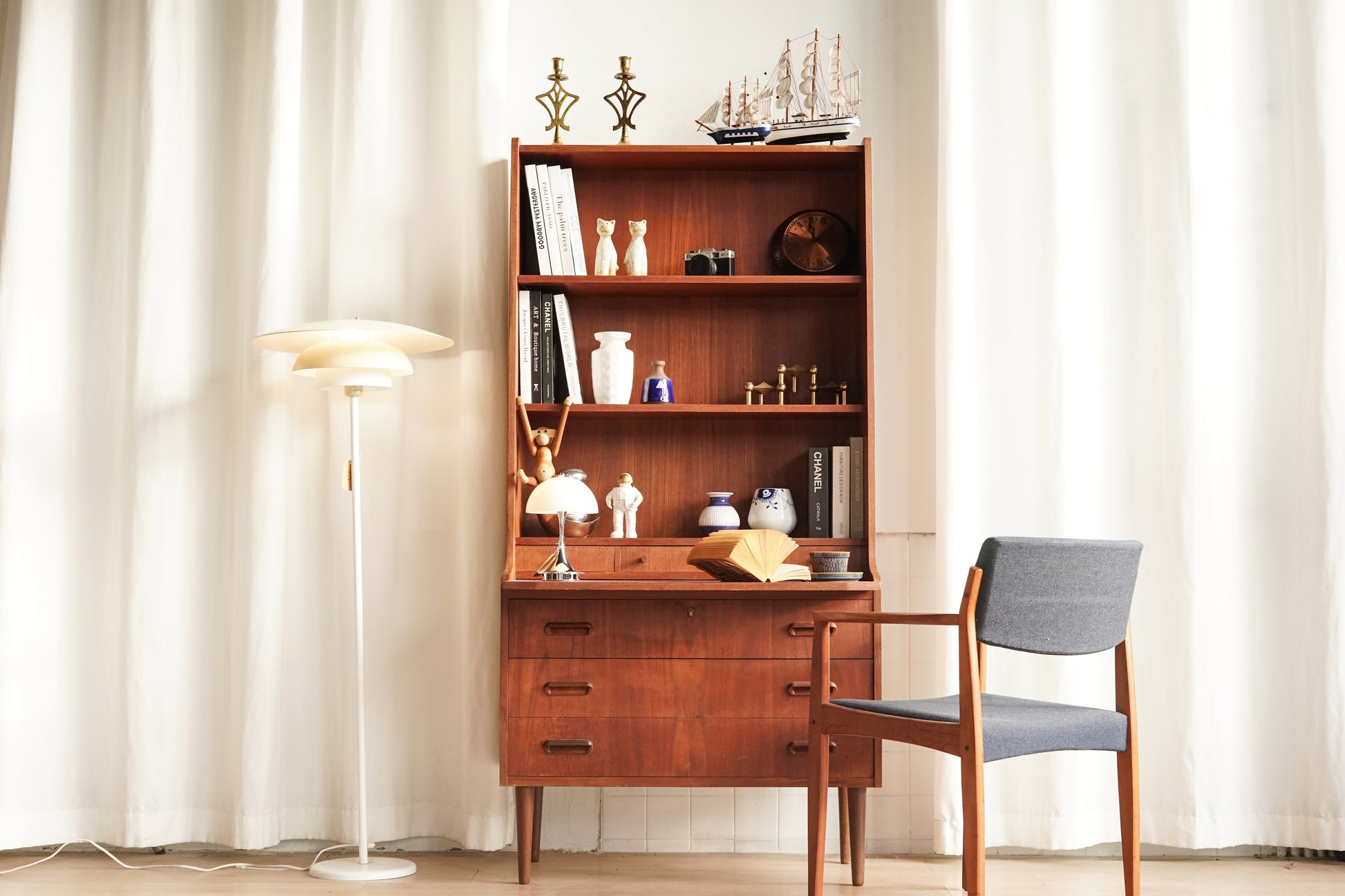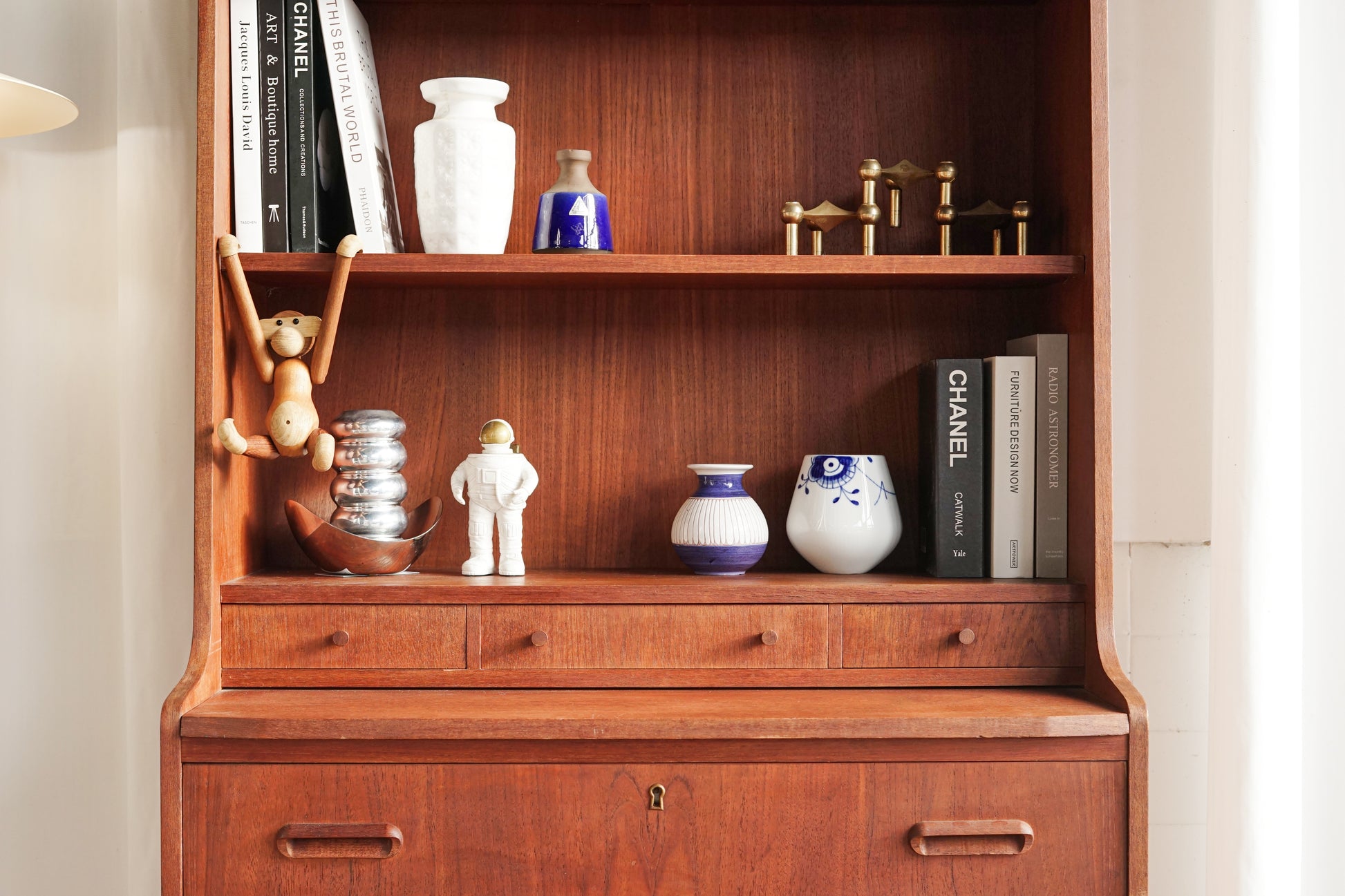 帶開放層架的丹麥柚木寫字書櫃,上半部為三層書架,可擺放書籍與小物,背板與層板都是同色柚木木紋,質感溫潤一致。