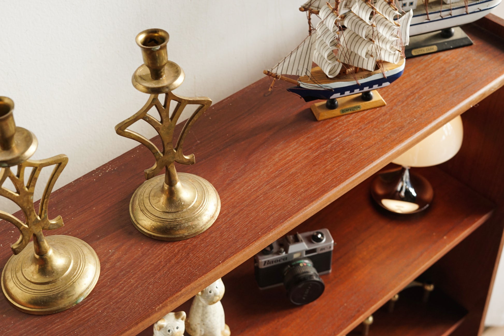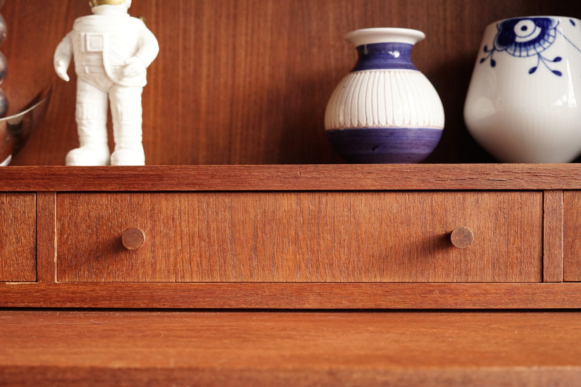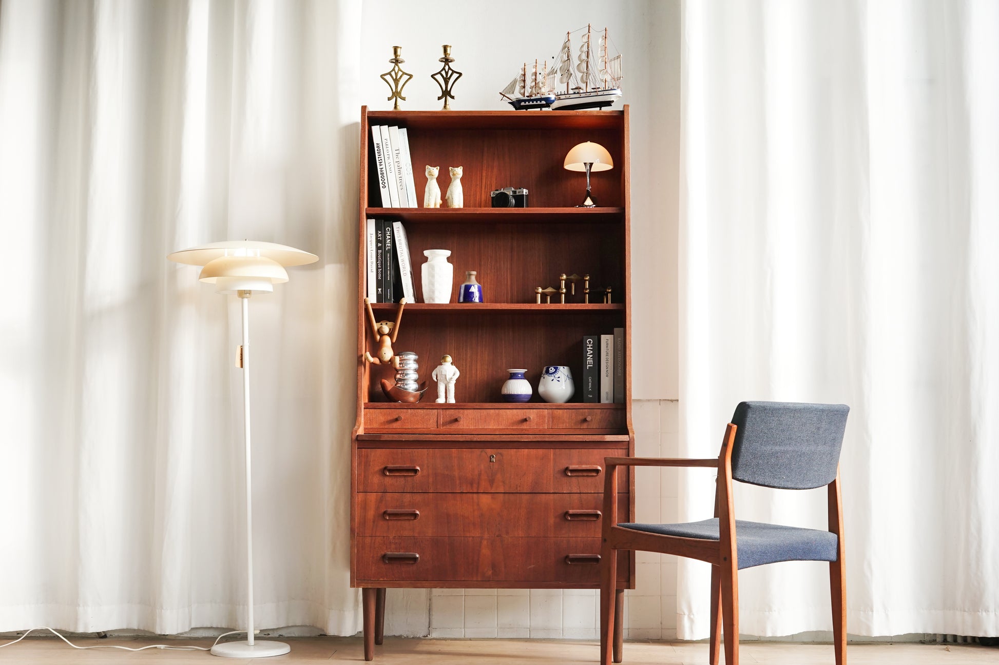 帶開放層架的丹麥柚木寫字書櫃,上半部為三層書架,可擺放書籍與小物,背板與層板都是同色柚木木紋,質感溫潤一致。