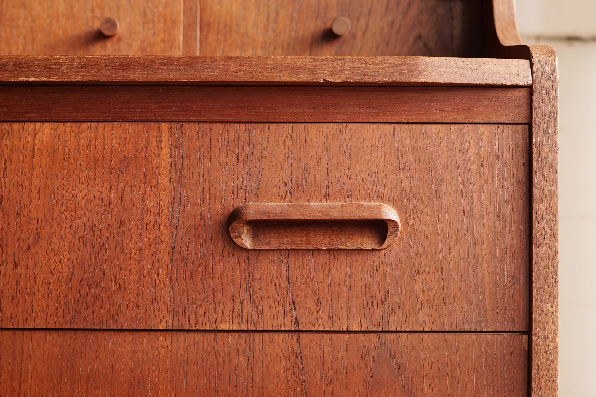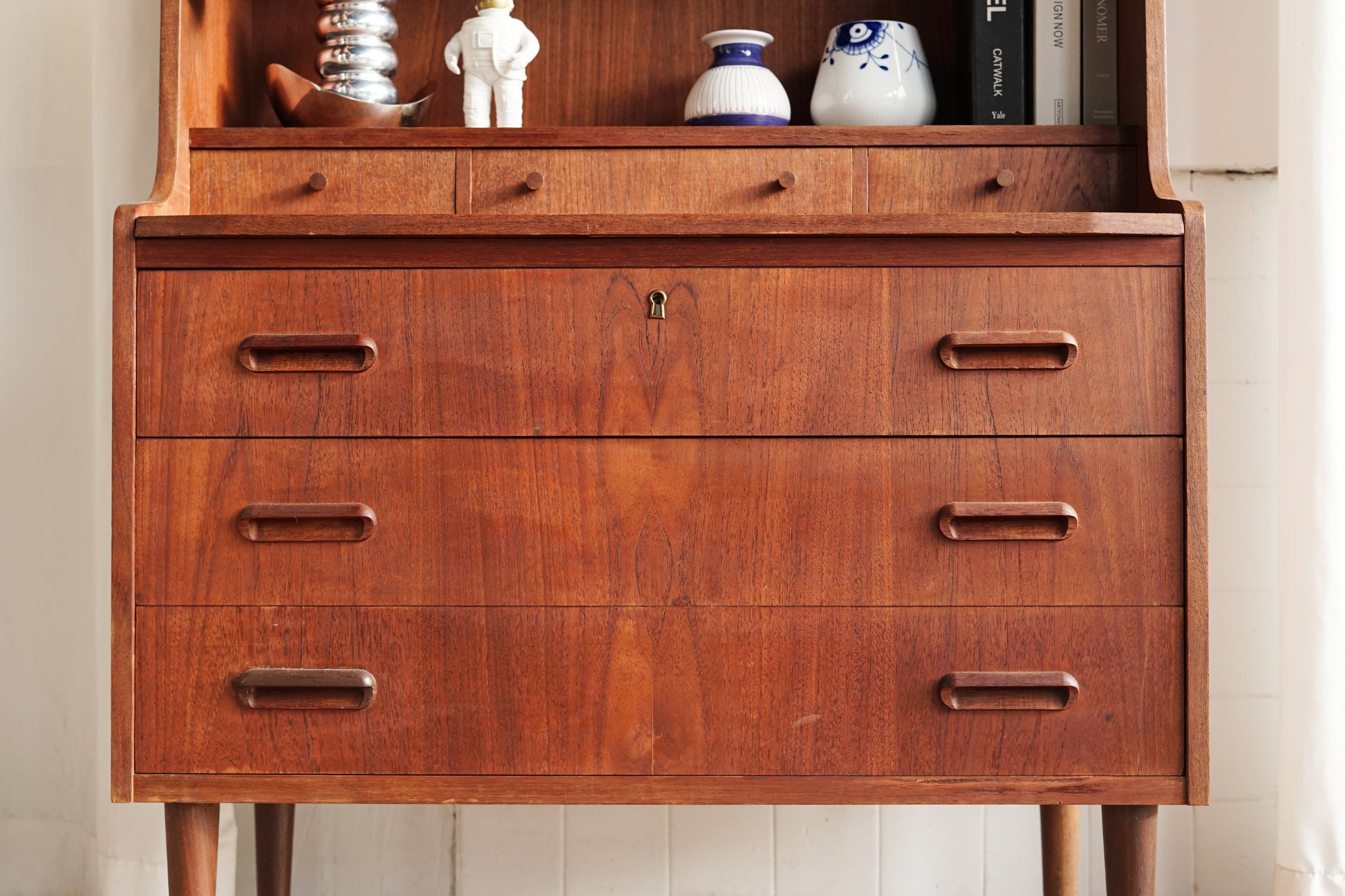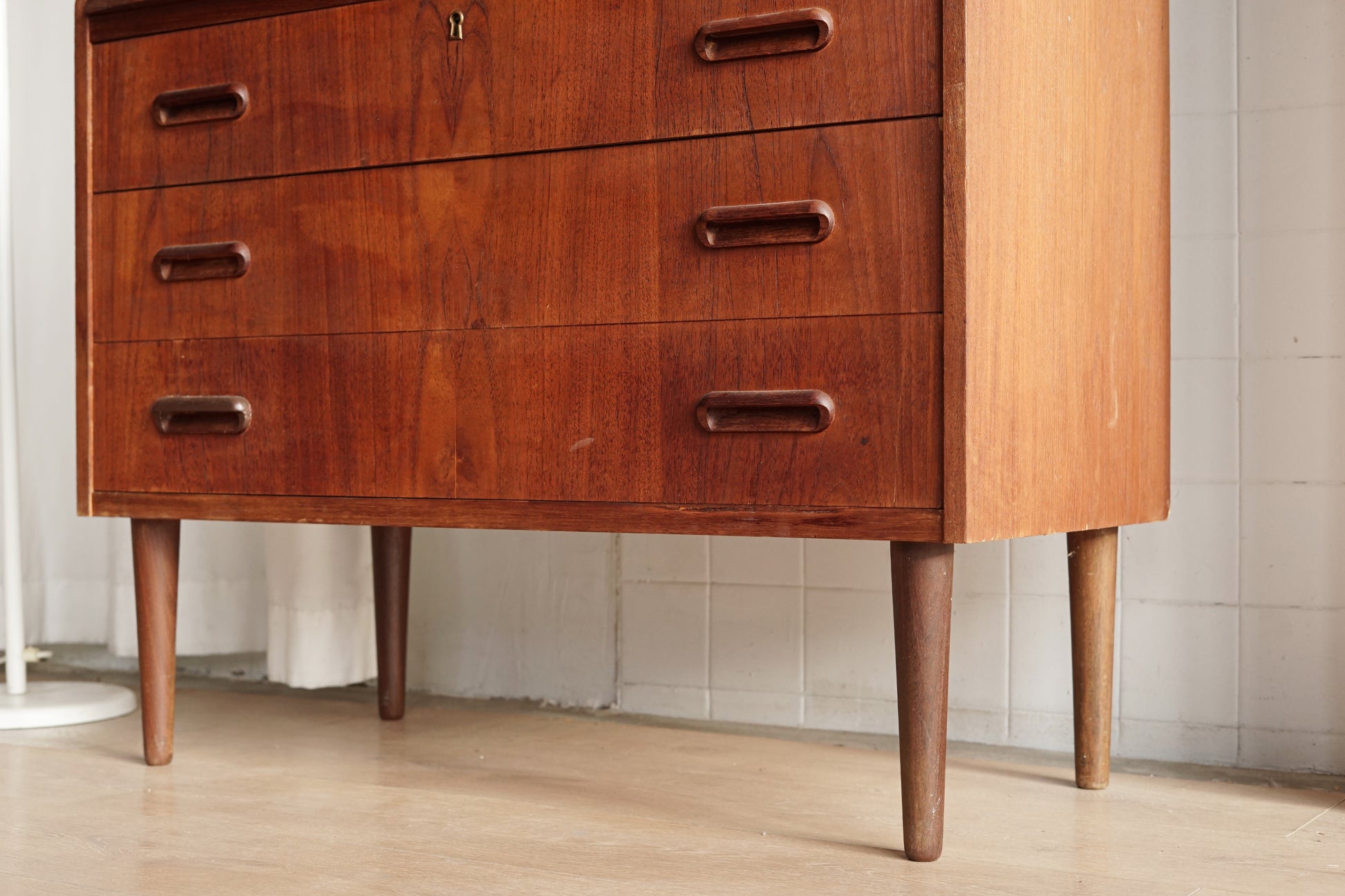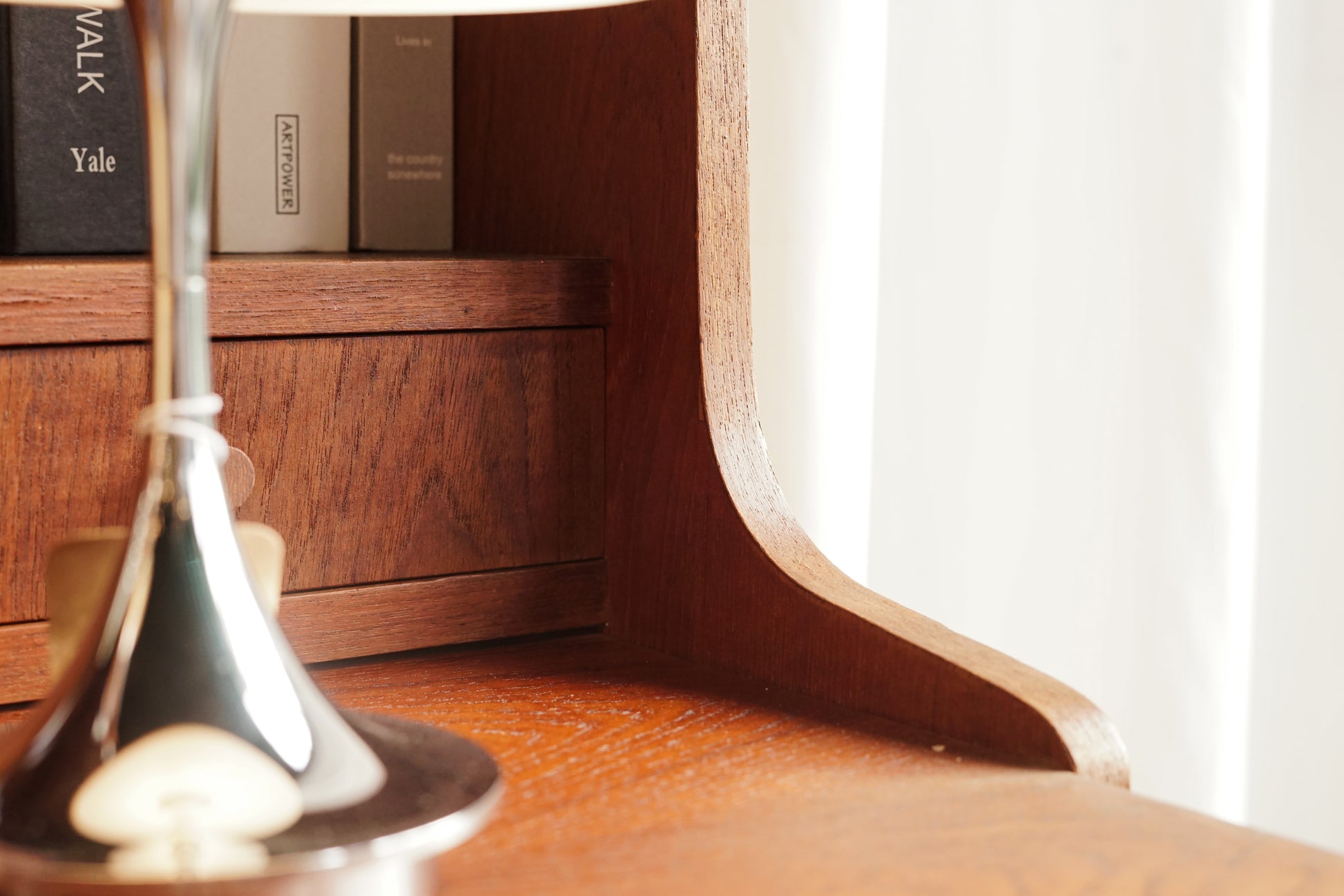 抽屜把手為整塊實木削出的橢圓凹槽造型,搭配四隻細長錐形櫃腳,整體線條俐落又帶點圓潤感,是典型60年代北歐風格的小型工作+收納一體家具,很適合放在客廳一角或臥室當迷你書房。
