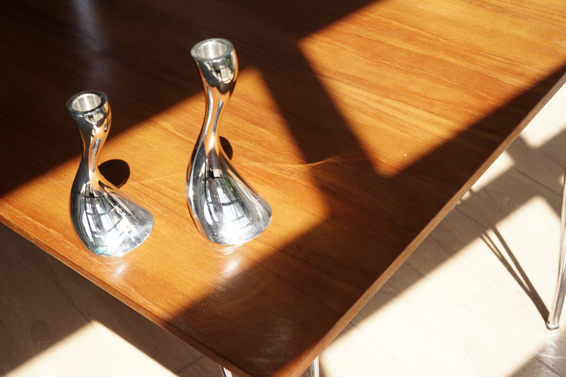 纖細的金屬腳呈現明亮反射感,與木質檯面形成俐落的北歐現代感。160×85 cm 的比例,既可作為 4–6 人餐桌,也很適合當工作桌或會議桌。