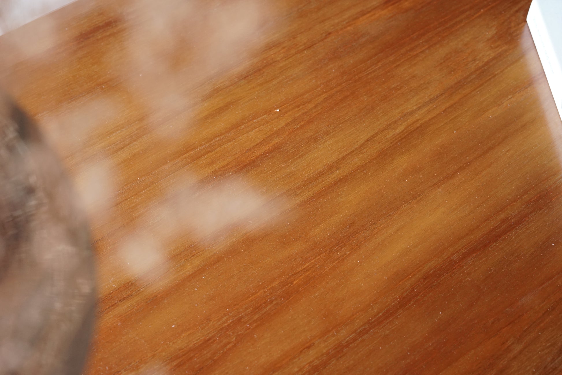 長方形柚木桌面帶有細緻直紋與溫潤油澤,視覺輕盈不厚重。