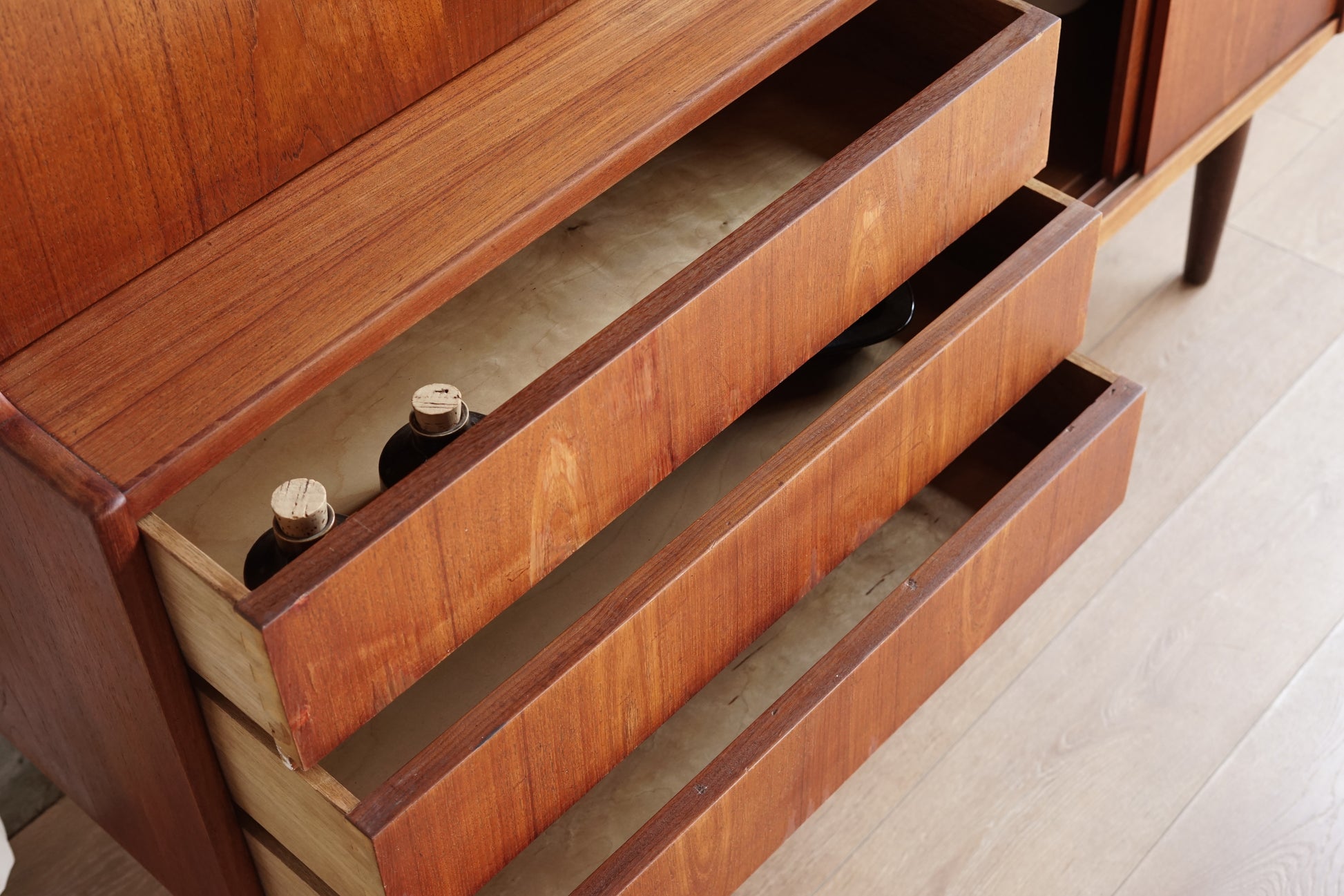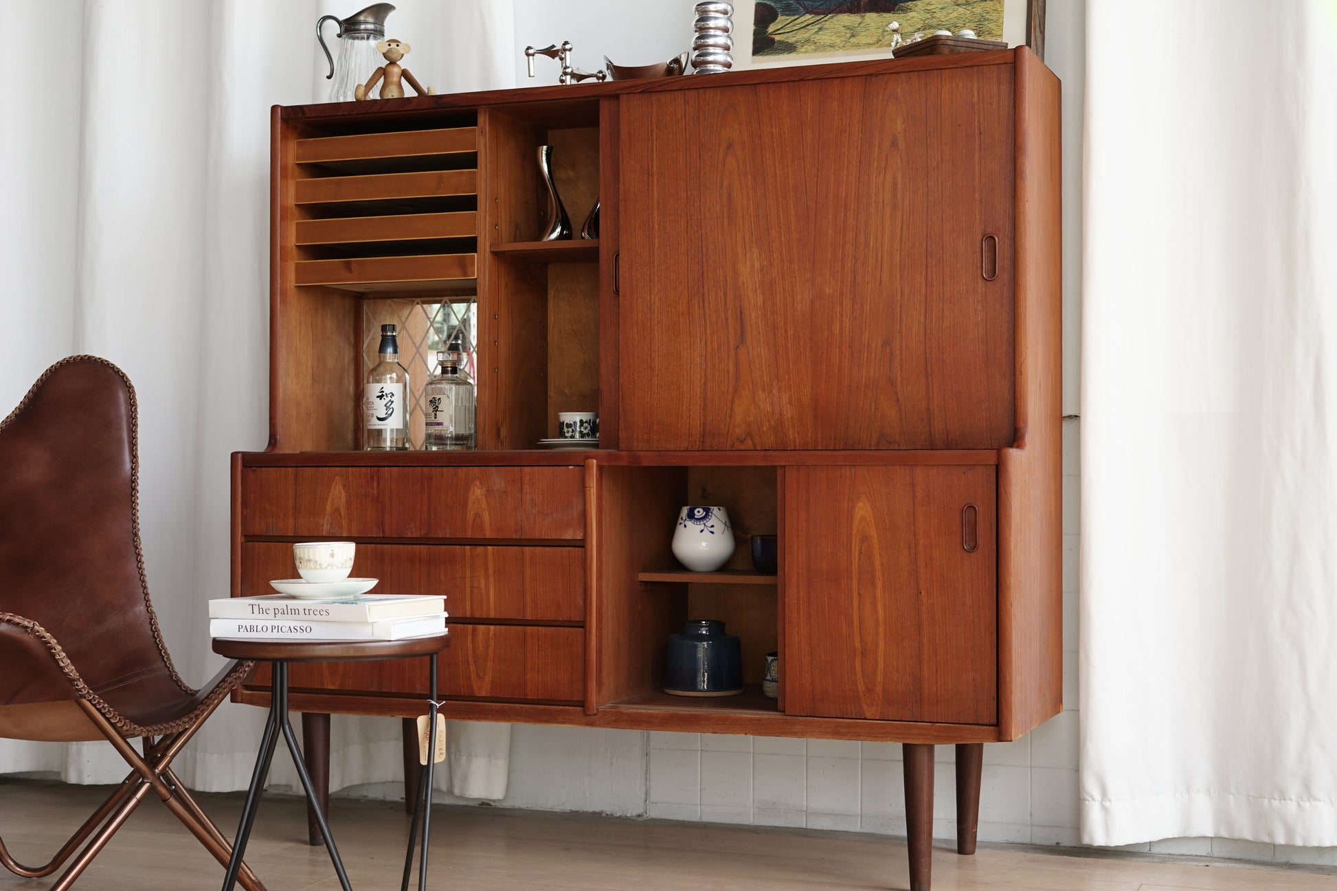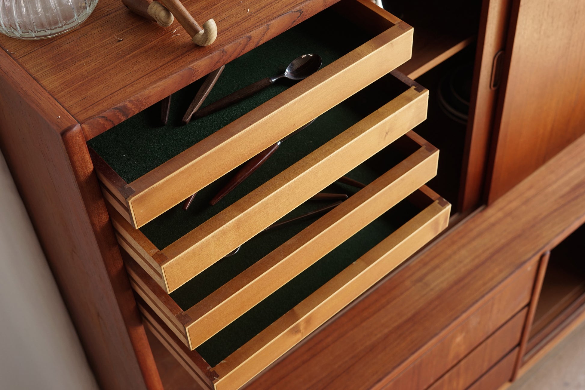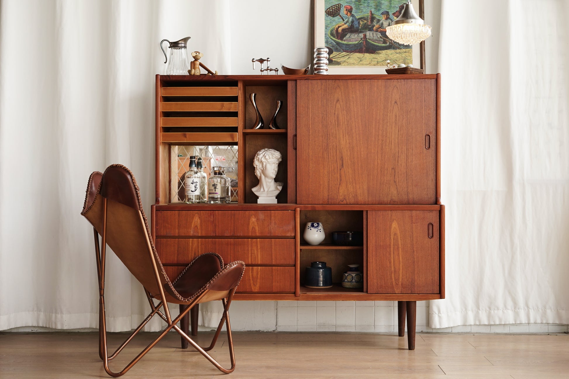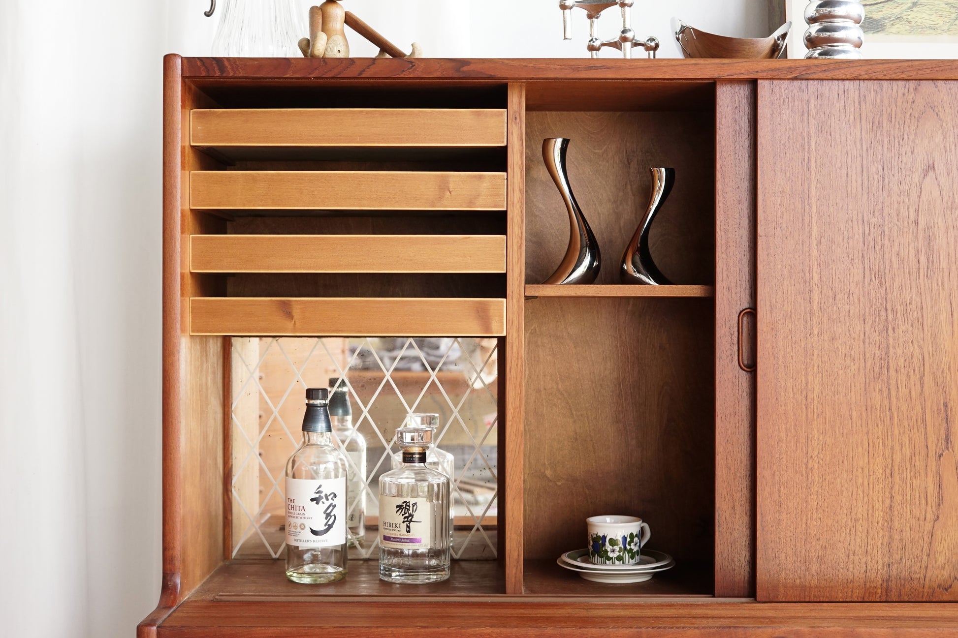 此「滑門+抽屜+鏡背吧台+餐具盤」的編成,正是 1960 年代丹麥高櫃的典型配置。