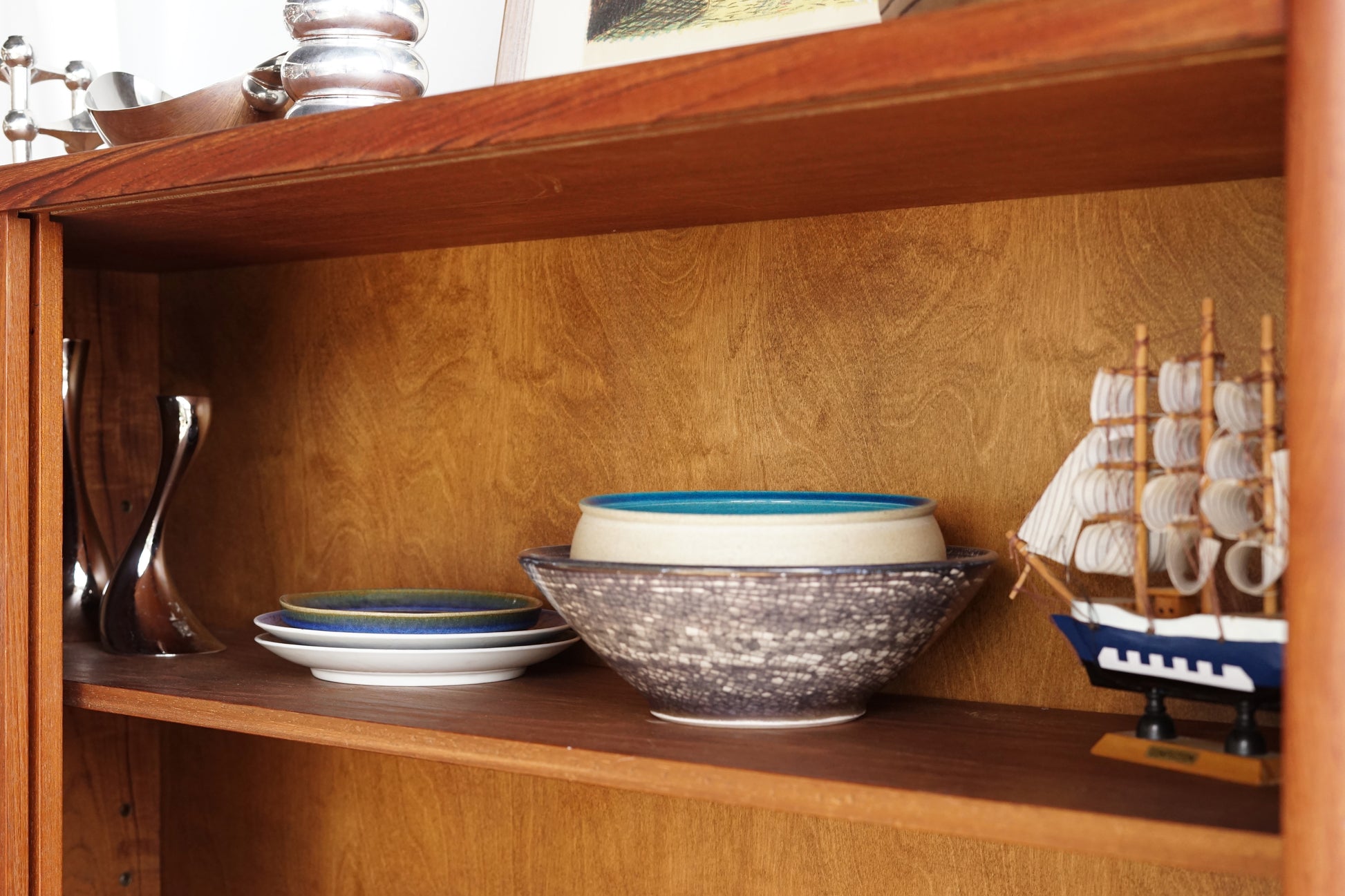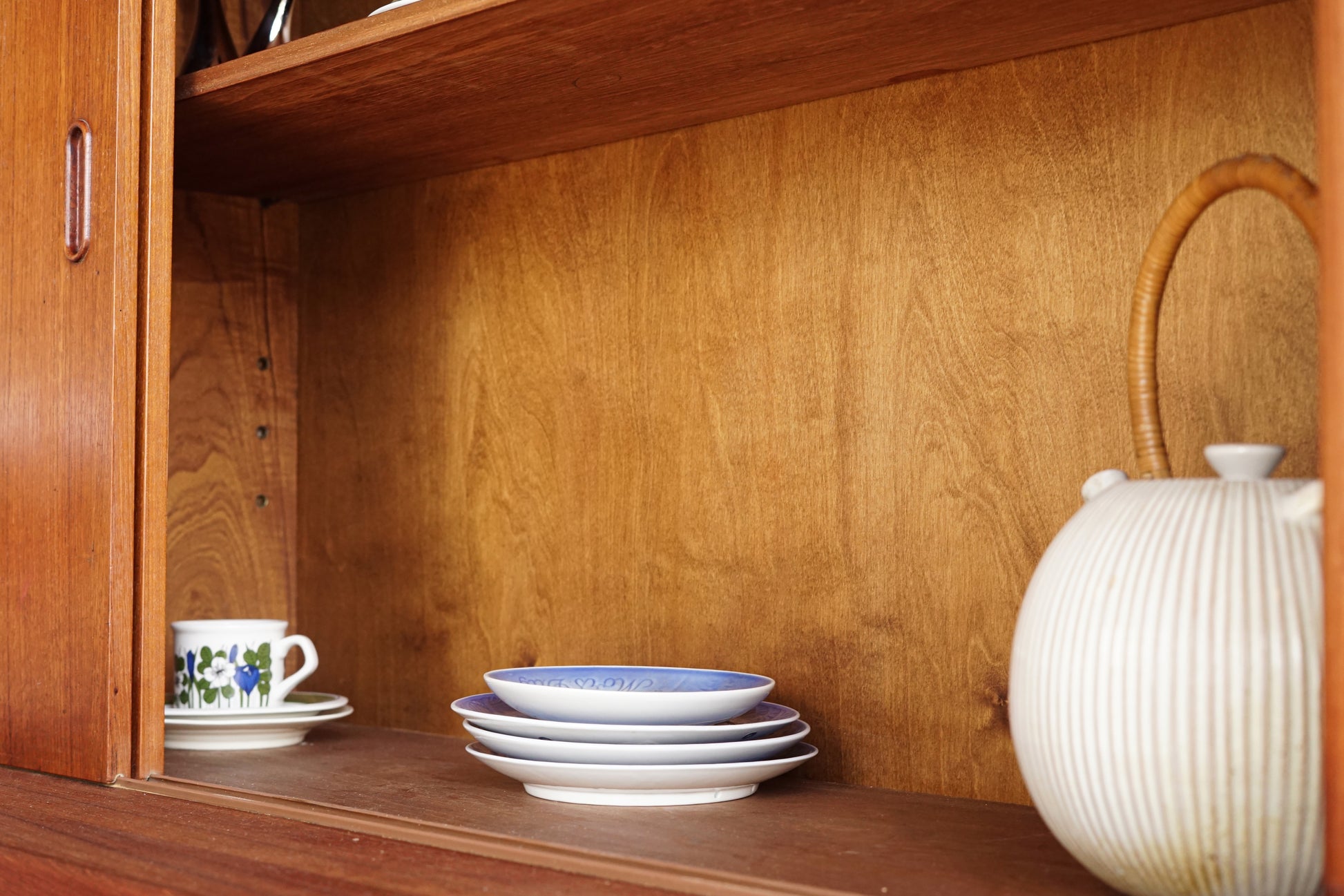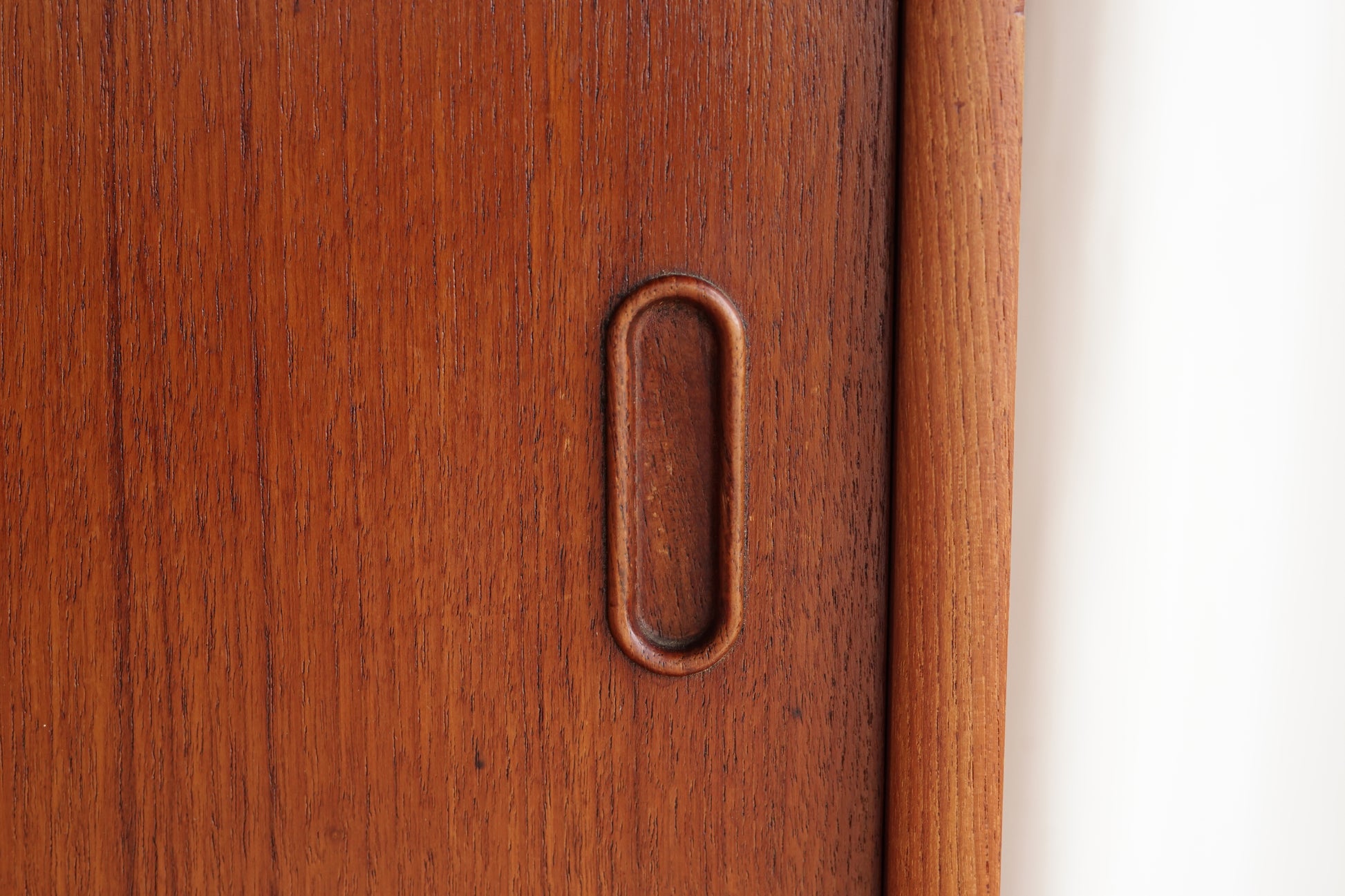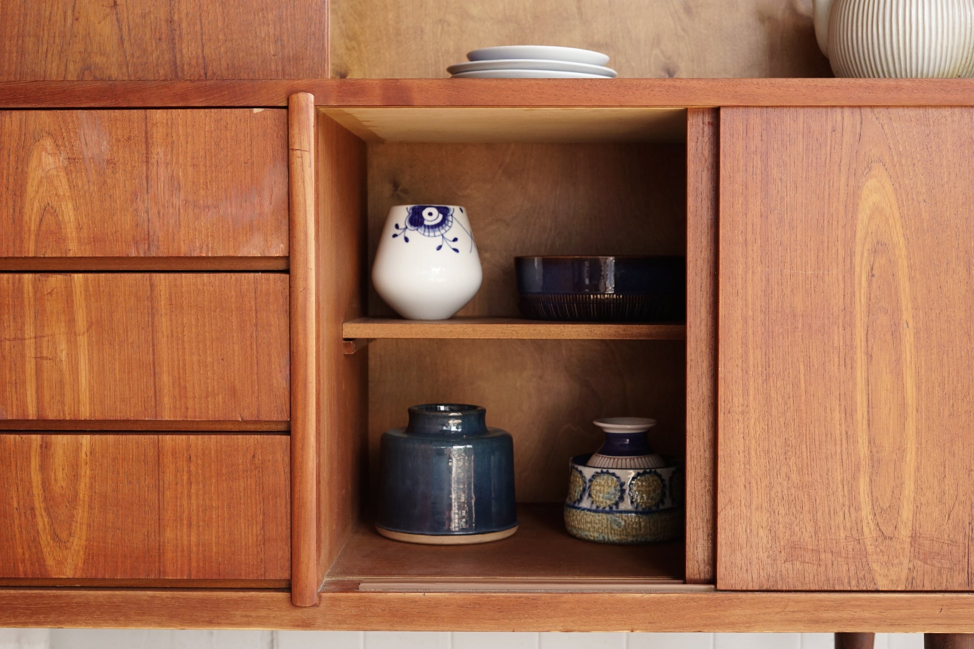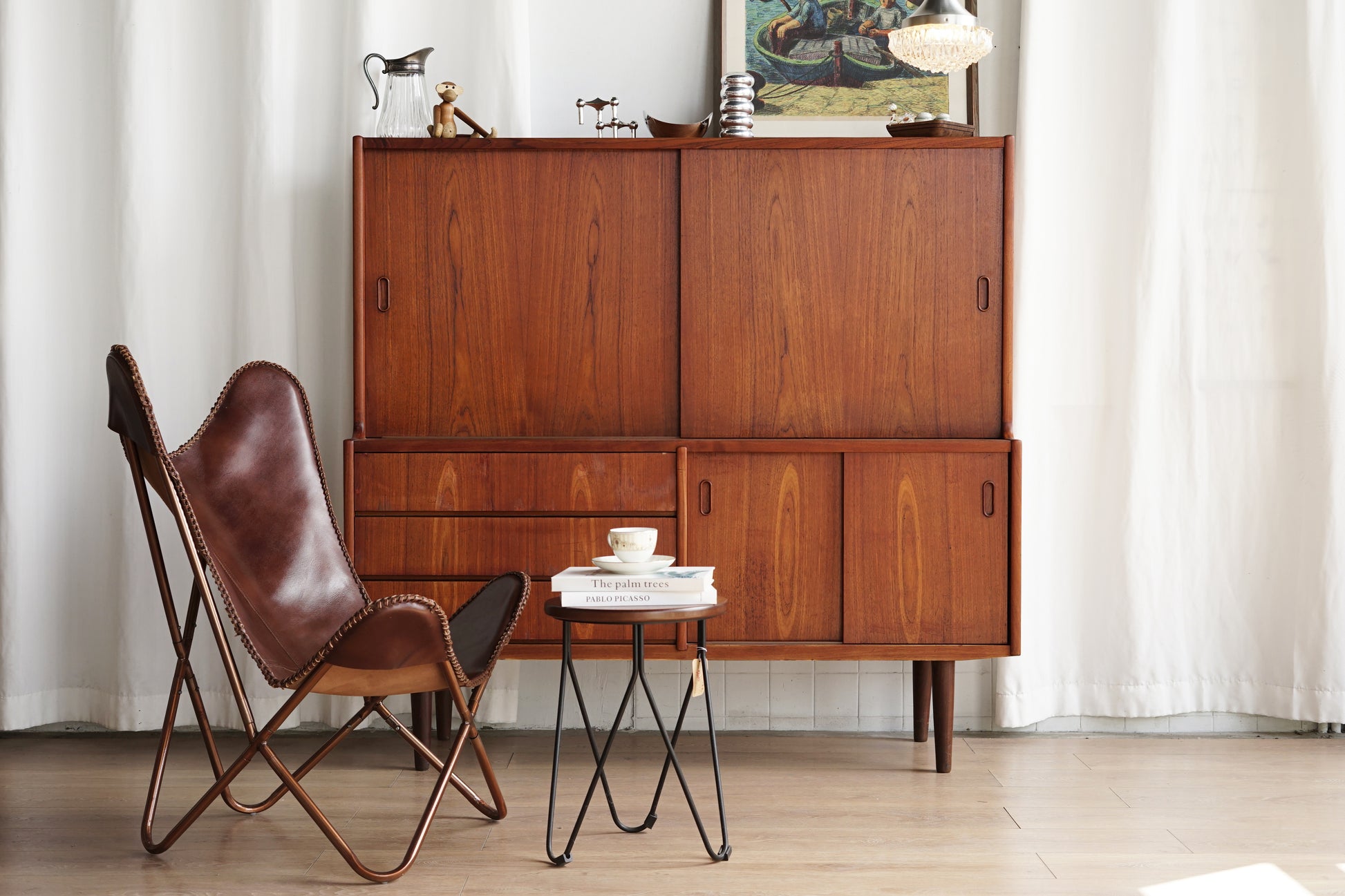此「滑門+抽屜+鏡背吧台+餐具盤」的編成,正是 1960 年代丹麥高櫃的典型配置。