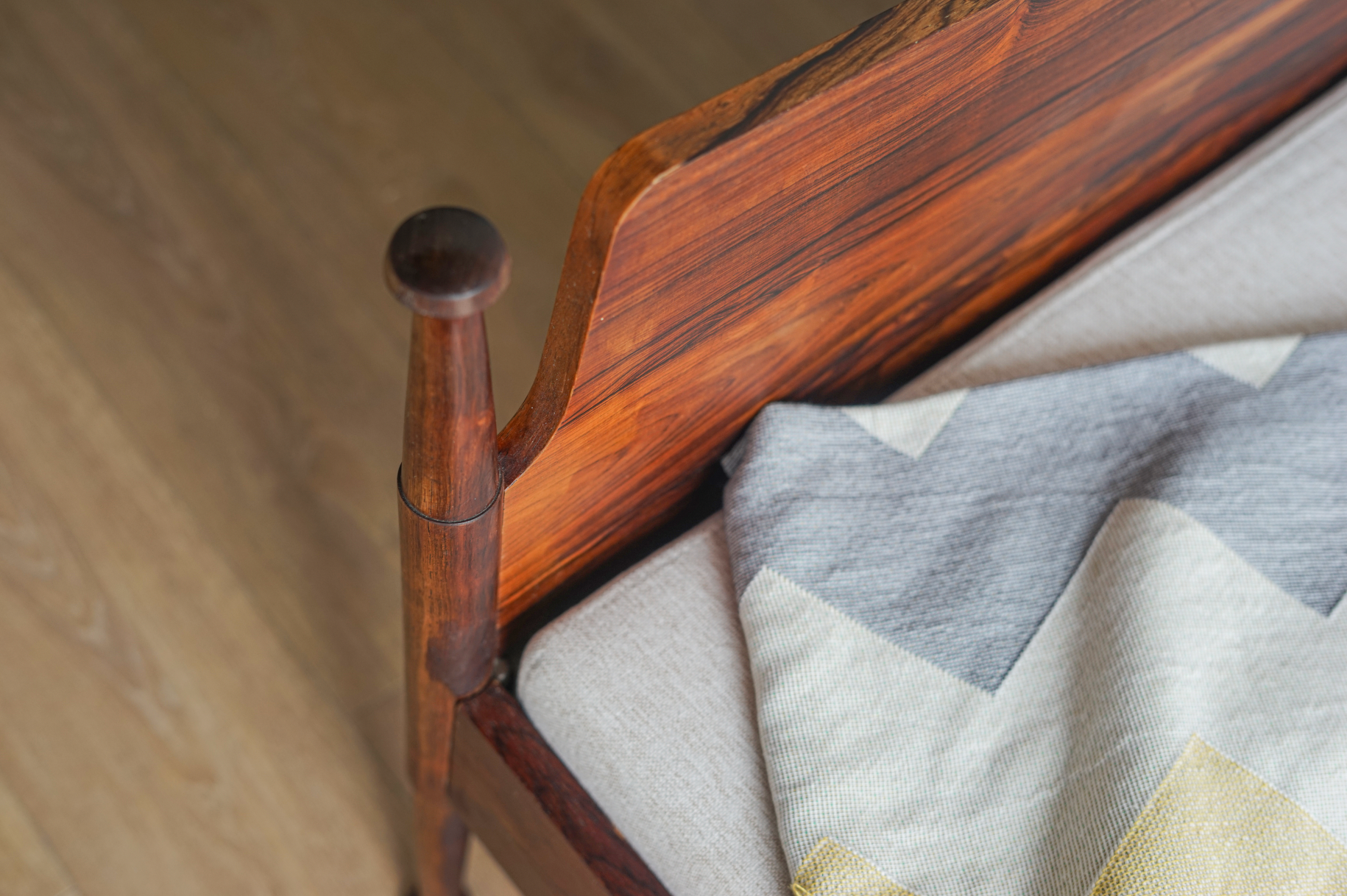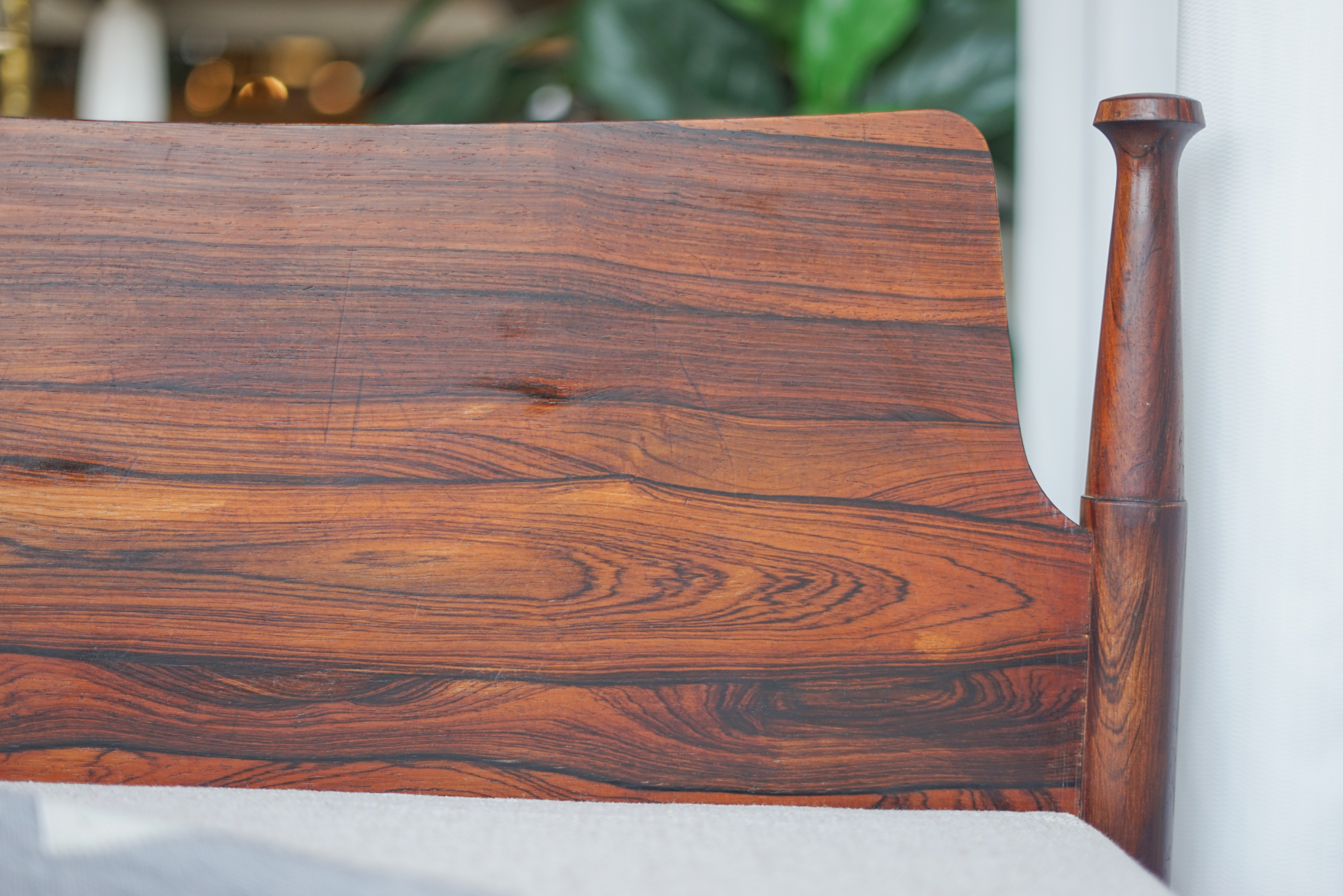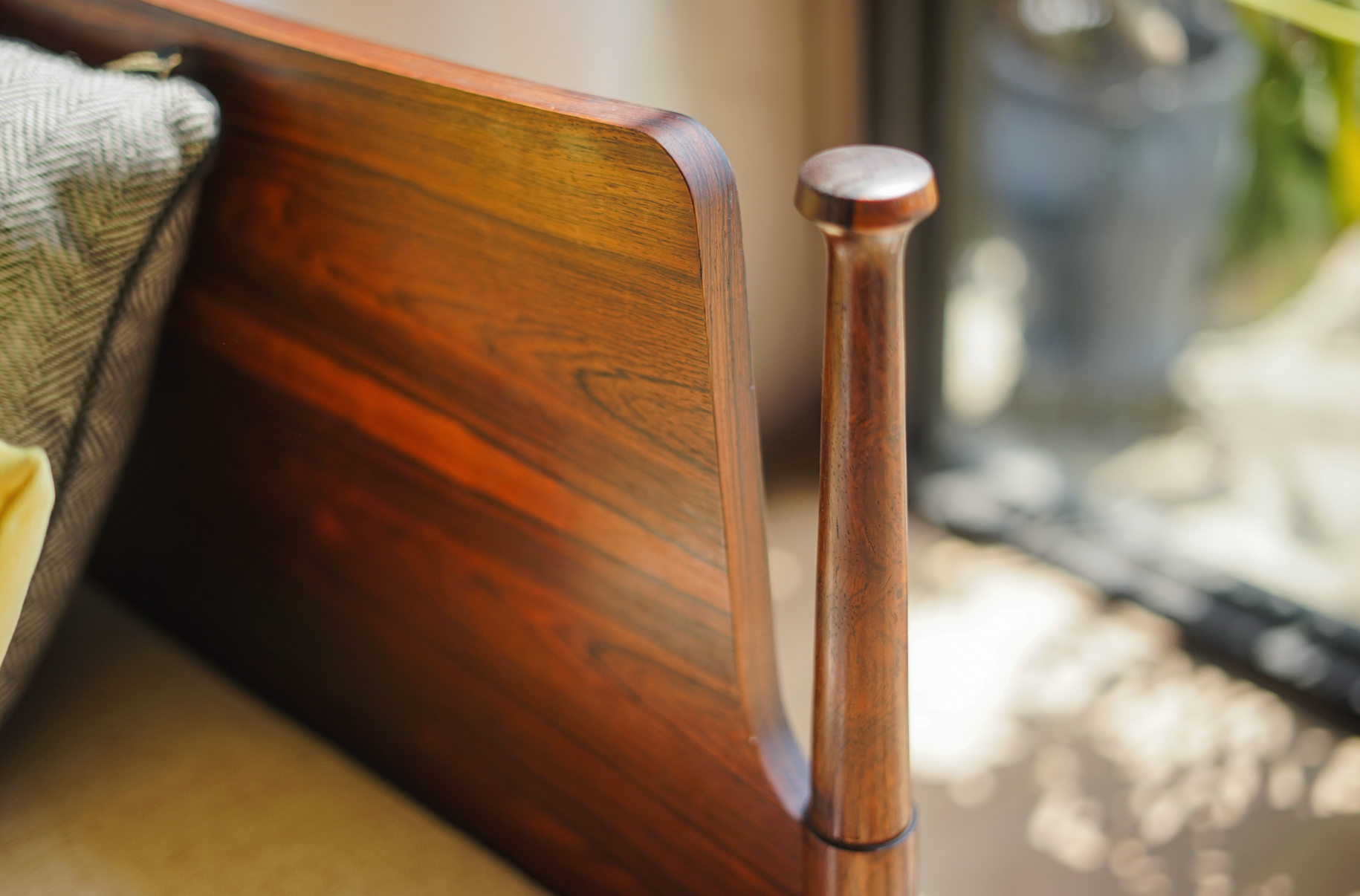 以玫瑰木製成,木質紋理溫暖自然,營造出寧靜舒適的睡眠環境,床架的設計典雅大方,線條流暢,充分展現了北歐設計的簡約與優雅。