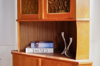 上層玻璃櫃門搭配經典黃銅格紋,輕巧展示收藏品、器皿或書籍。中段開放空間適合擺設花器或藝術小物,下層則提供隱藏式儲物機能,將美觀與實用合而為一。