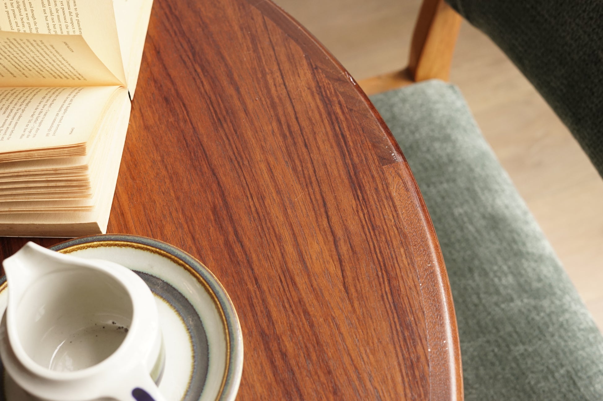桌面為玫瑰木,木紋細緻、色澤深淺交錯,搭配圓滑桌緣與修長實木桌腳,呈現典型 60 年代丹麥中世紀風格。