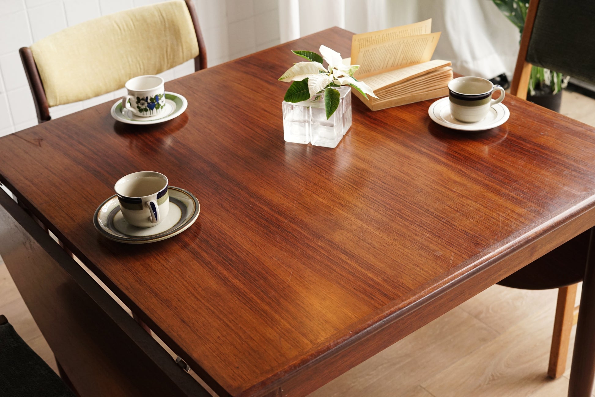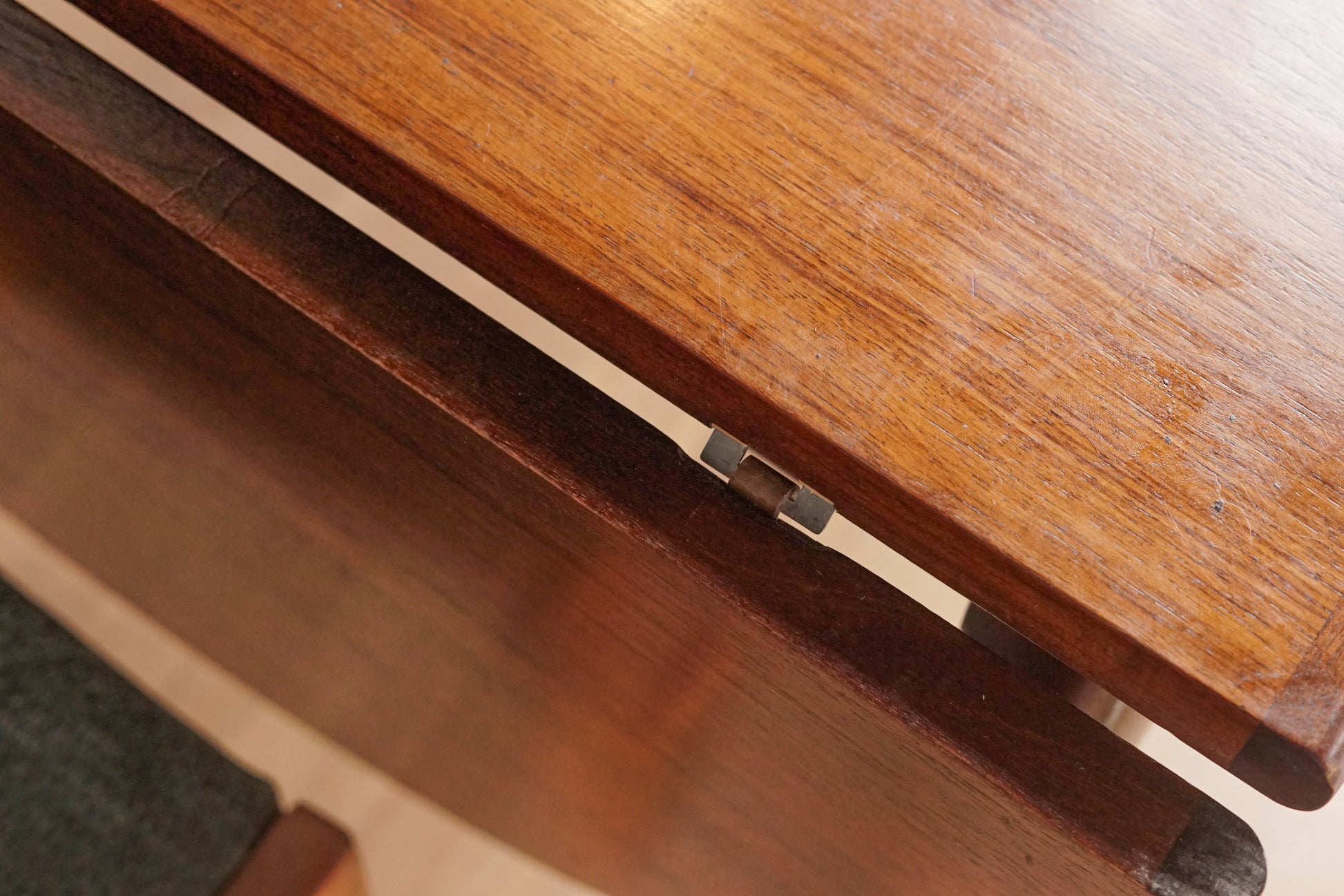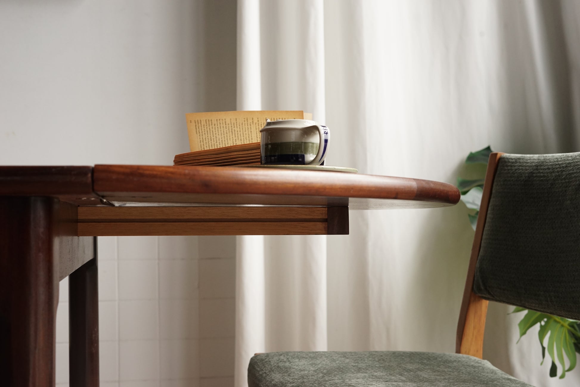 折葉內藏滑軌支撐,展開後穩定度佳,收合時不佔空間,非常適合坪數有限、需要彈性桌面的餐廳或工作區。桌面可見些許細小刮痕與歲月痕跡,整體結構紮實穩固,適合日常實用的老件餐桌。