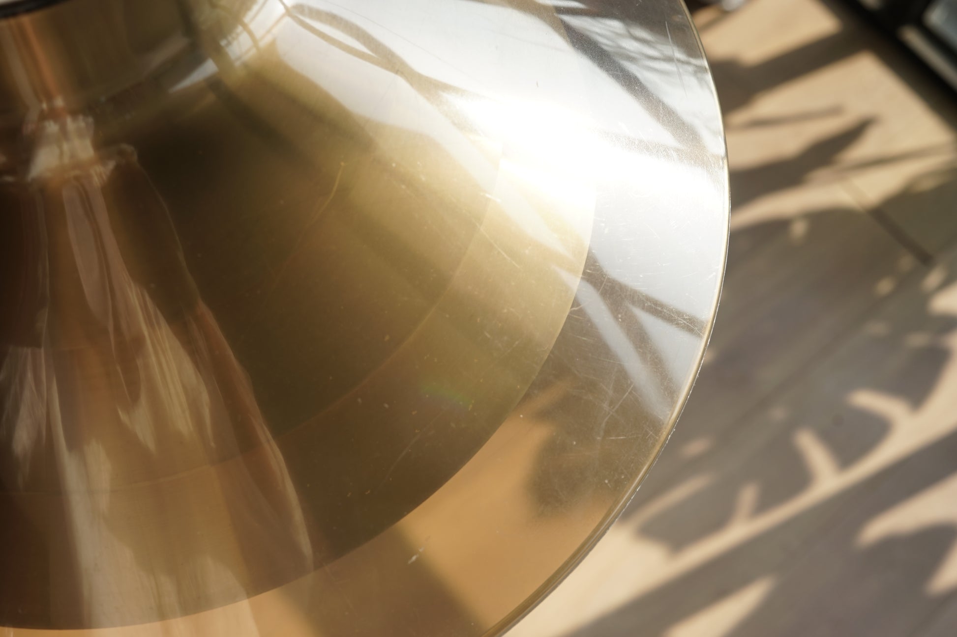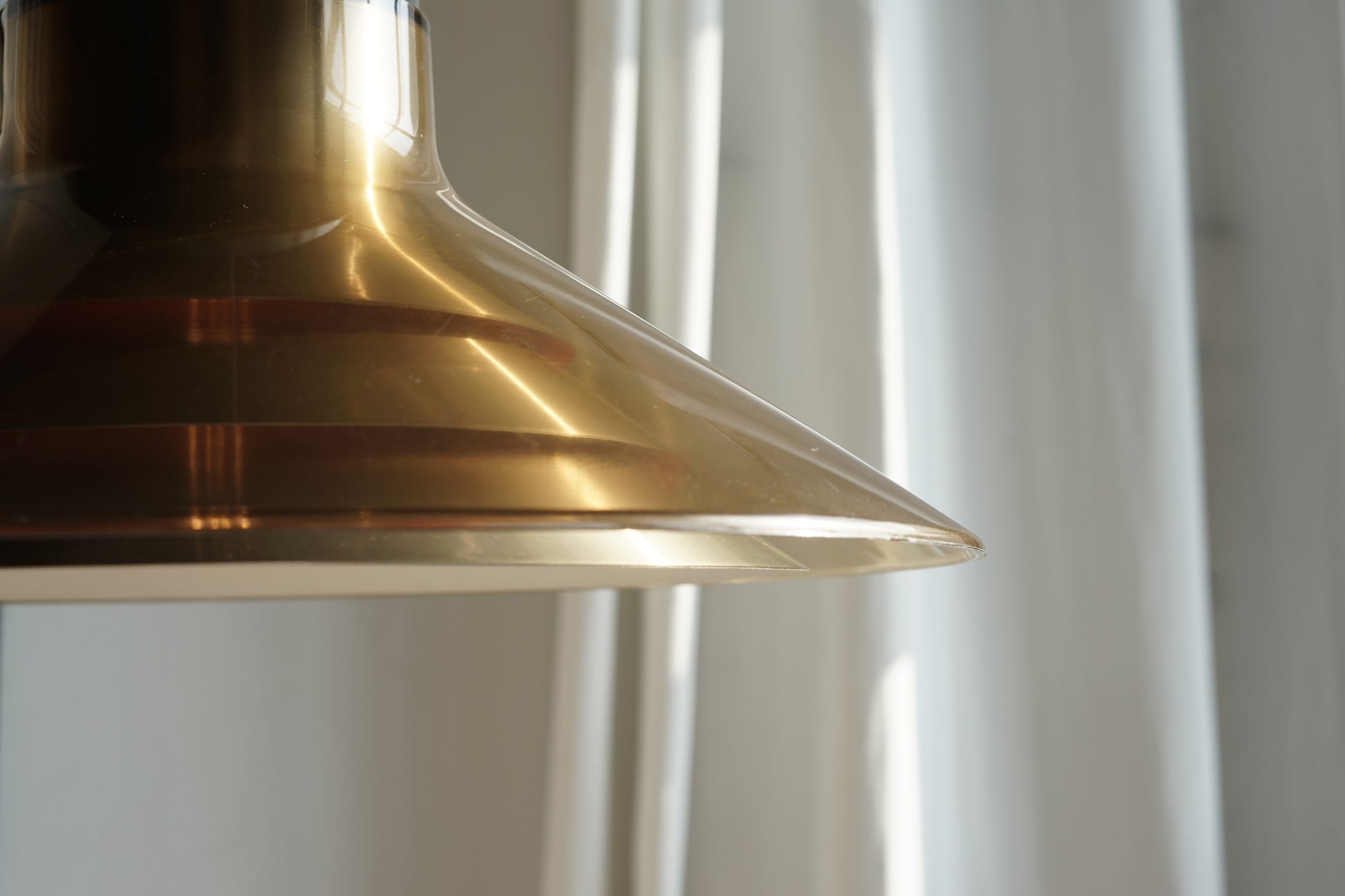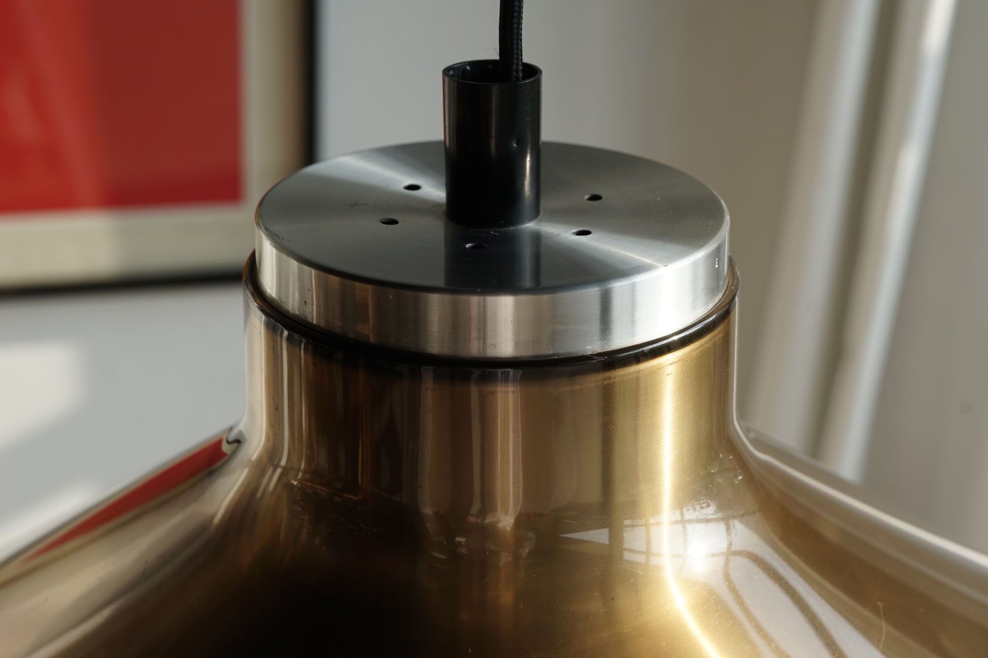 吊燈以琥珀色透明燈罩為主,燈罩由燈頸向外大幅張開,形成圓錐形輪廓;罩內可見層層階梯,點燈後會把光線向下集中,同時在罩內折射出帶有層次感的金色光暈。頂部則是拉絲金屬圓盤搭配黑色出線座。