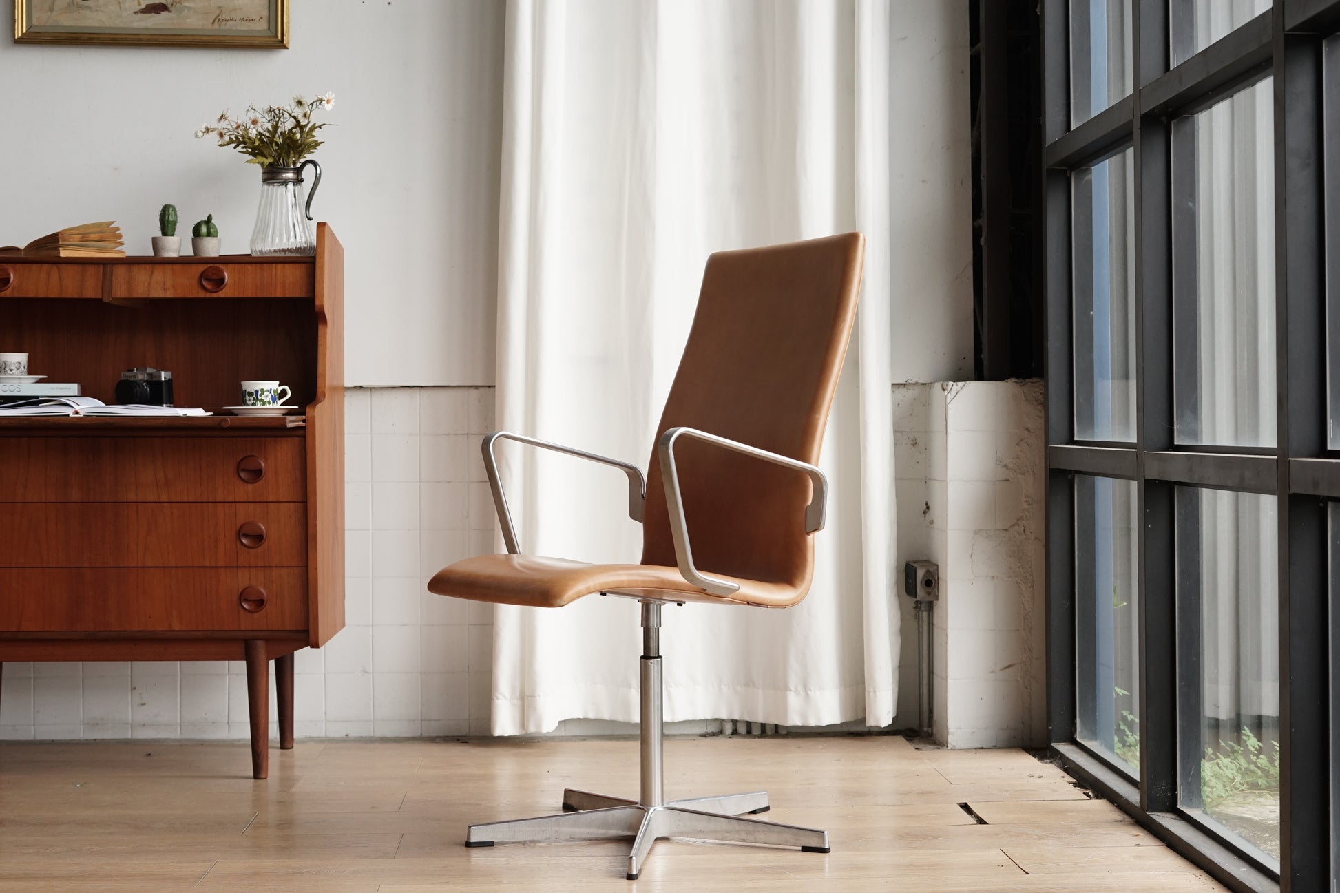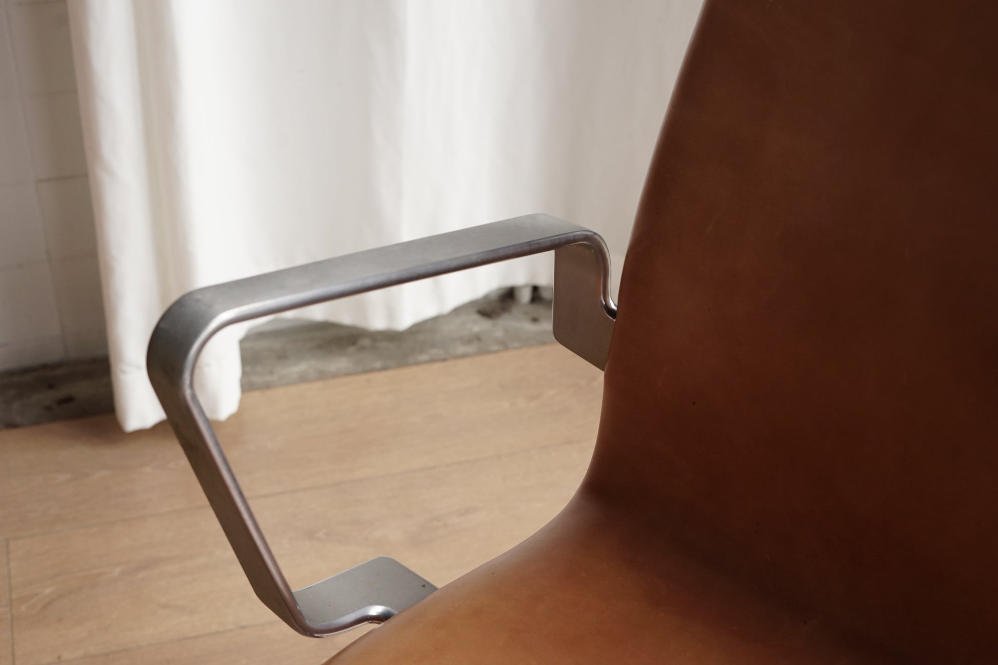 高背一體成型座背,包覆淺焦糖色皮革;邊緣薄、向下微收的弧面座板呈現系列常見的輕薄比例。扶手為霧面鋁合金彎折成環狀,從椅背兩側以金屬耳板固定。底座為拉絲處理的金屬四爪星型底座,中央單柱連結。整體線條俐落,坐感由高背提供良好支撐。