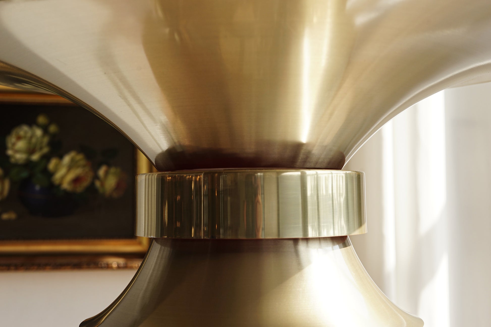 三段喇叭形的遮光盤自上而下漸縮,中段以拋光黃銅環帶做出層次,形成「上、下、環帶」三重結構:上盤與下盤將光線向上、向下漫射;中段環帶之間留有間隙,使燈具在夜間出現一圈細緻的環狀透光。