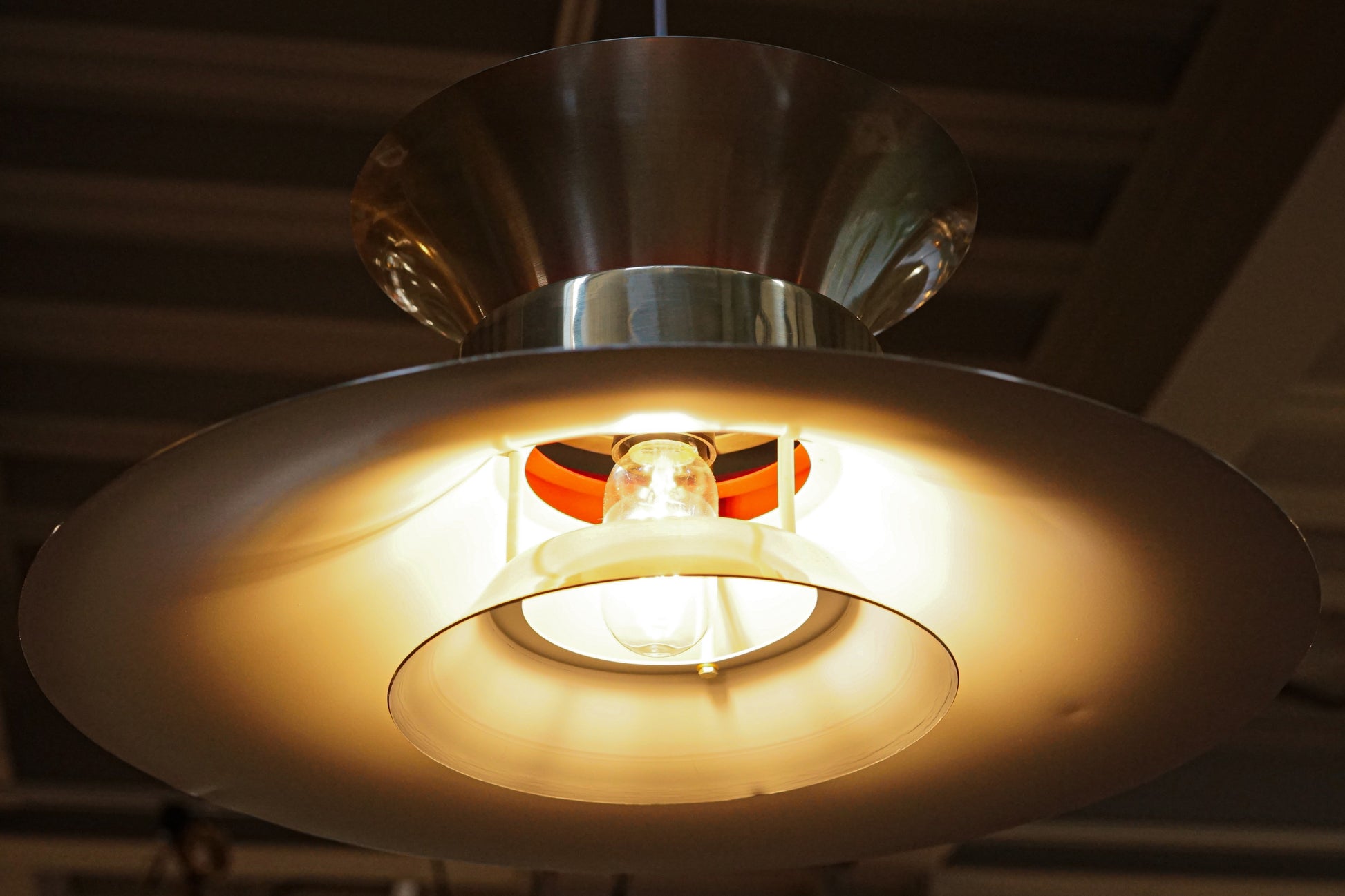 內部為白色反射碟與紅銅色間隔圈設計,能有效防眩並讓餐桌面獲得均勻柔和的照度,非常適合餐桌、吧檯或客廳中央使用。