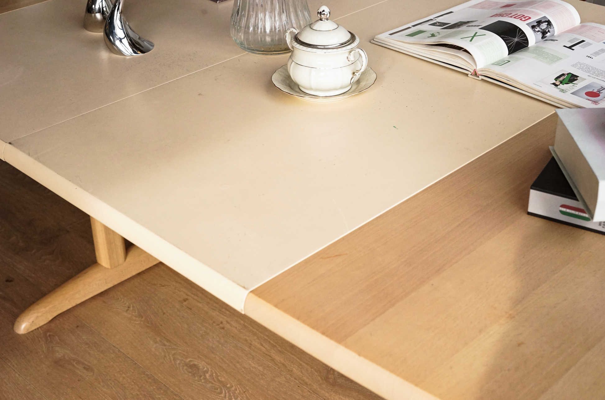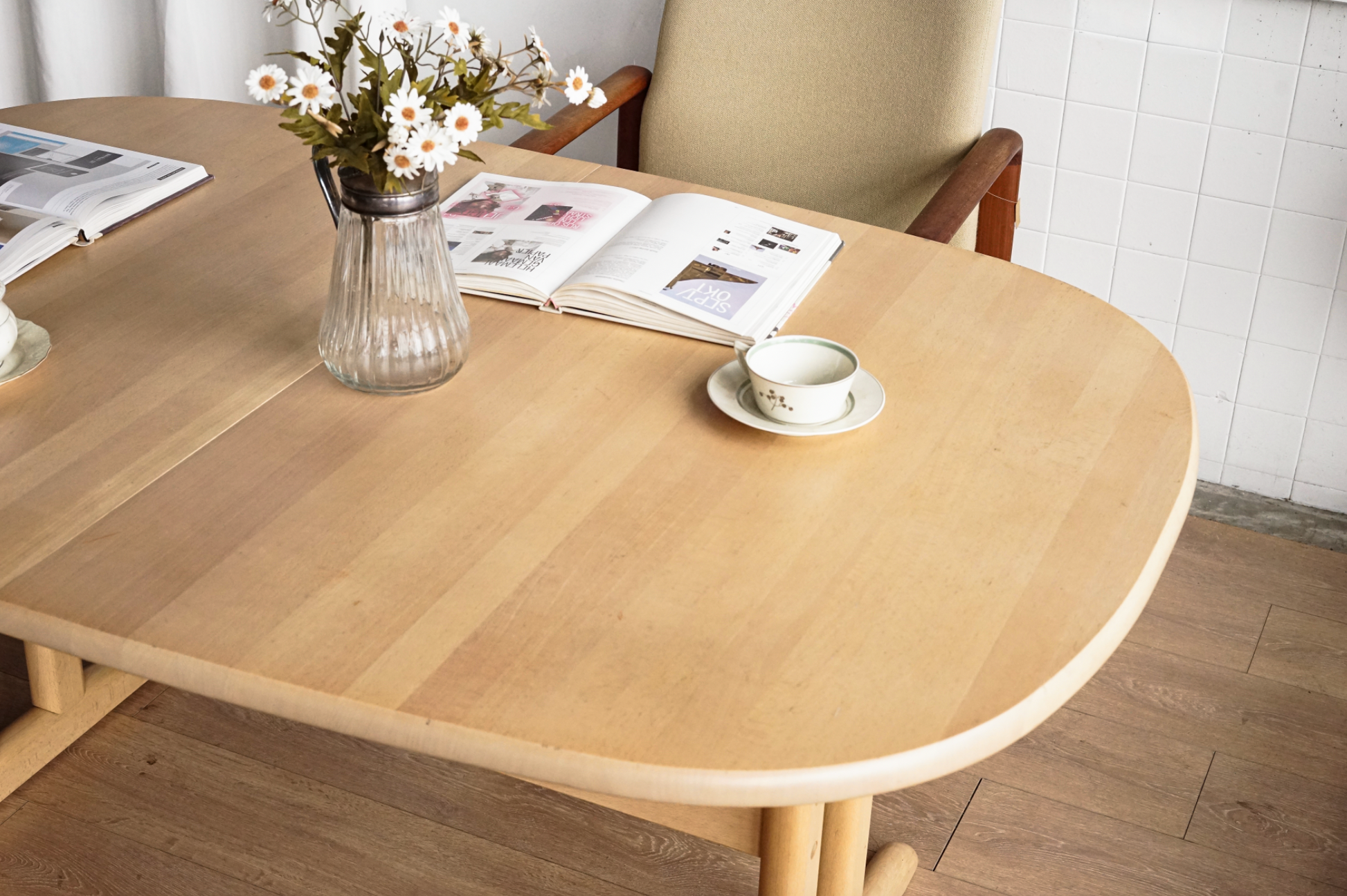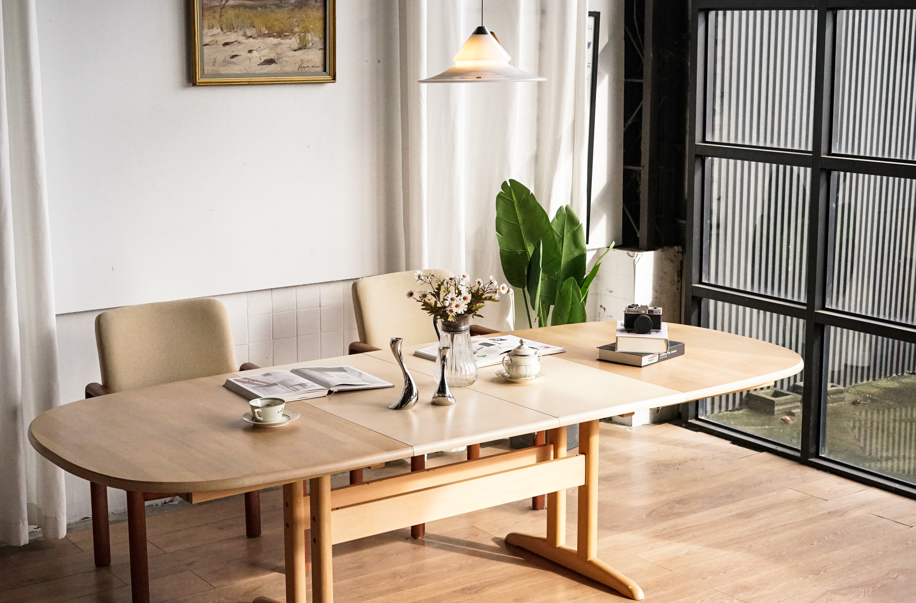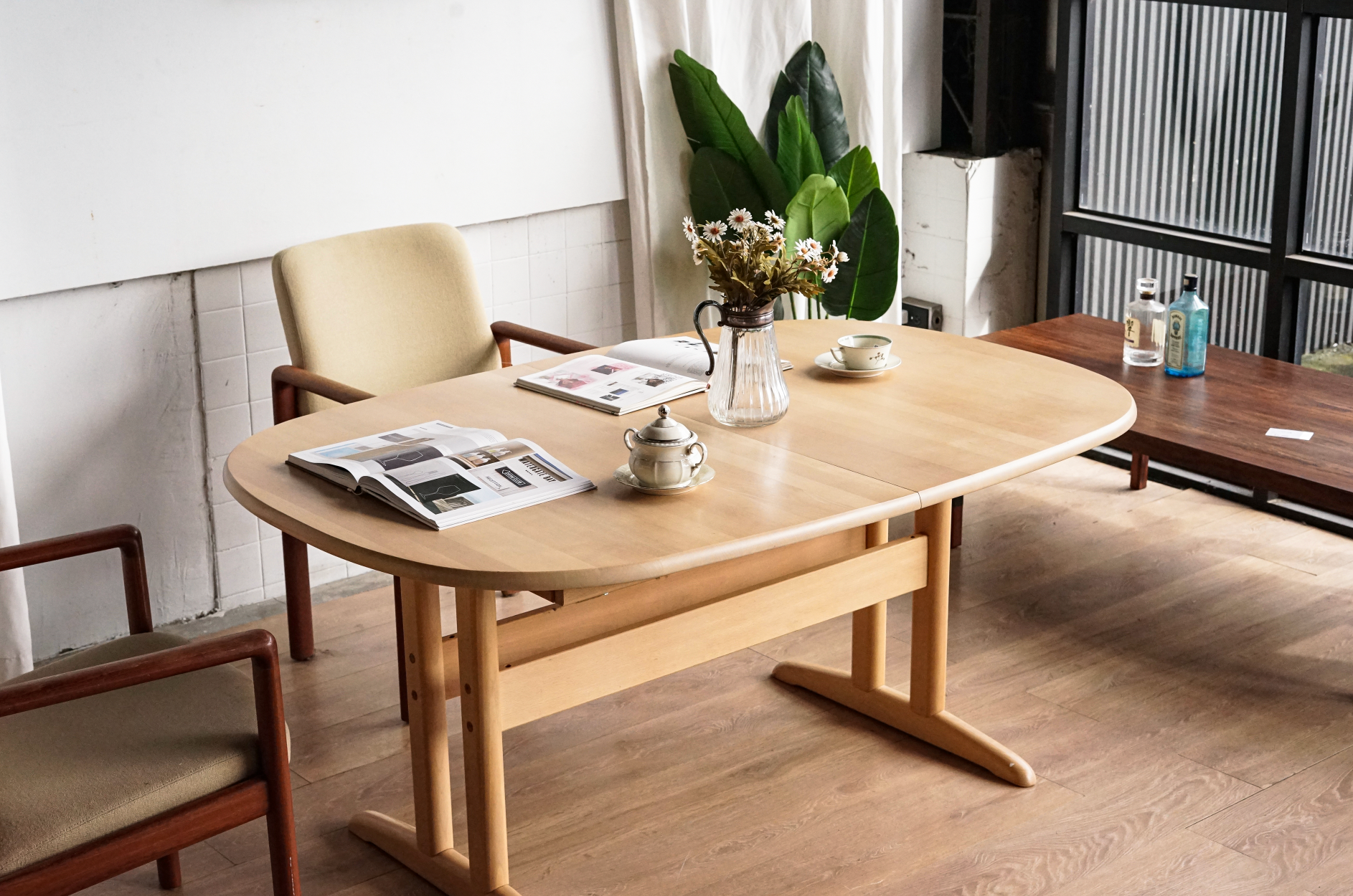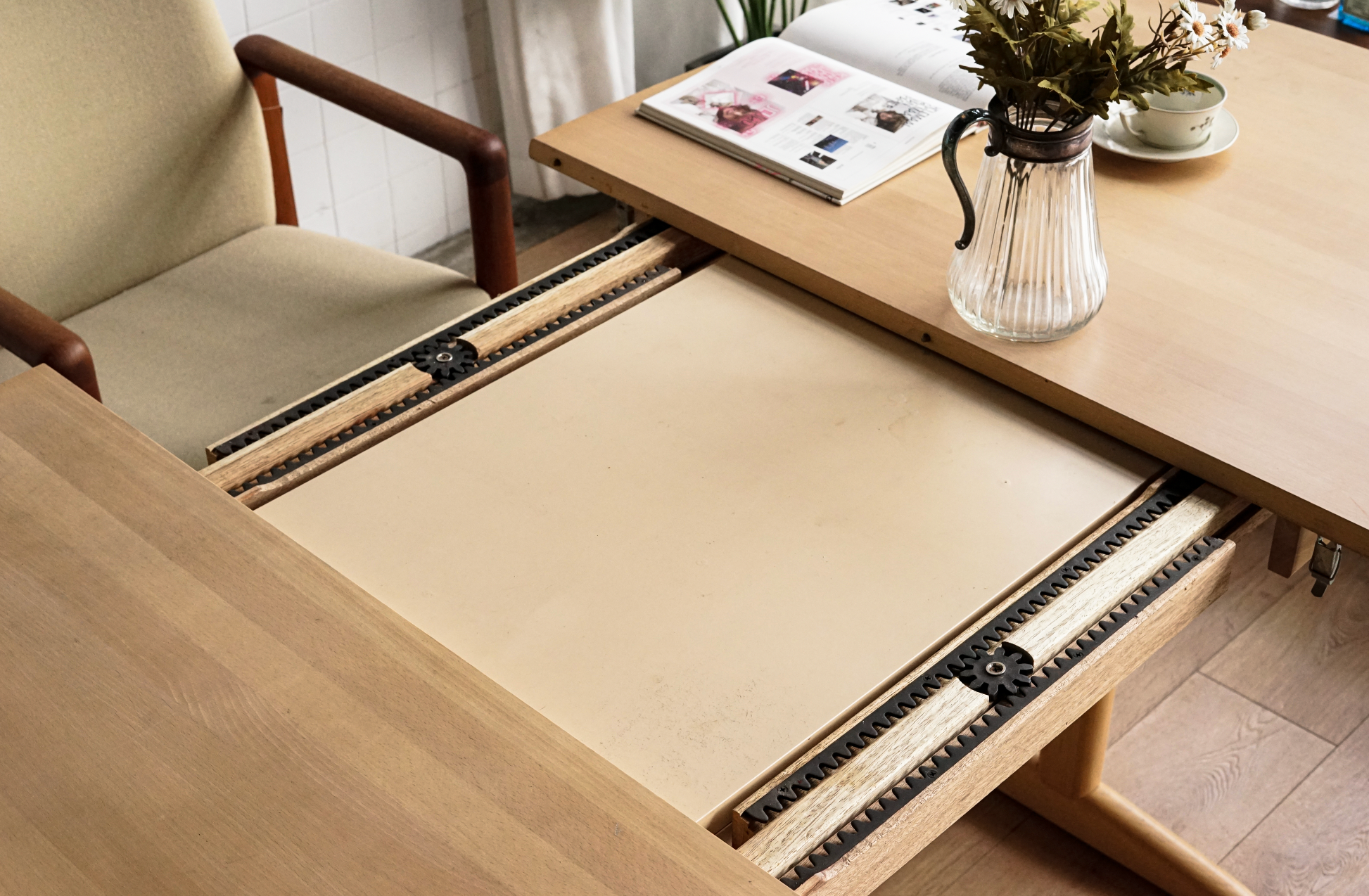 功能與美感並重的經典設計,桌面採用柔和淺色木紋拼接米色中段,色調清爽,線條俐落,呈現北歐特有的簡約溫度,桌面本體底下設有夾層空間,可將兩塊延伸桌板收納其中,維持視覺上的整潔俐落,延伸裝置結構十分獨特,採齒輪滑軌設計,操作時穩定順暢,較輕鬆完成展開與收納,結構上十分強韌,大桌面用途廣泛,除了作為家庭餐桌,也非常適合用於工作坊、會議空間、創意工作室等場域,展開後可容納 6 至 8 人,是一件兼具實用機能與美感比例的優秀餐桌。