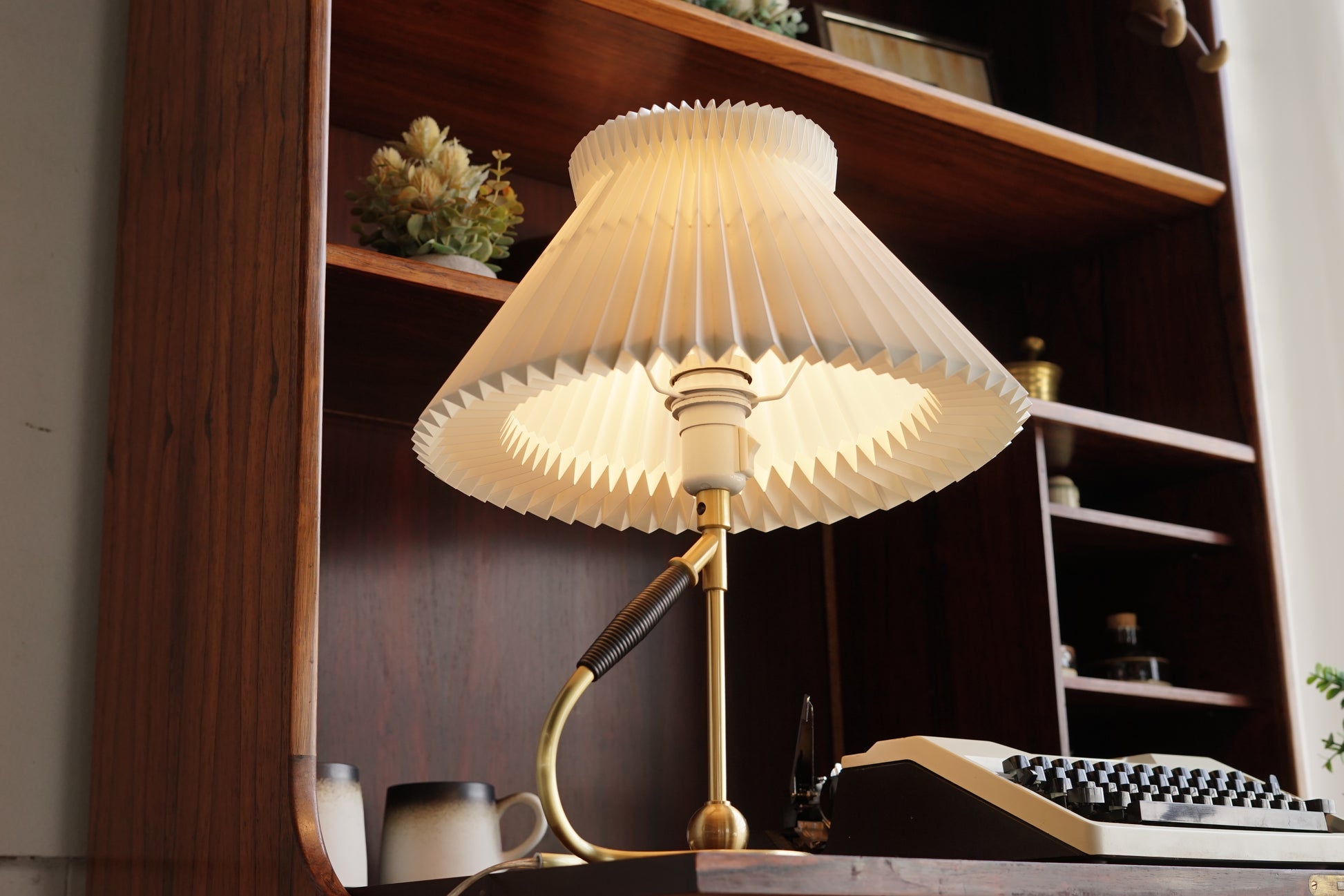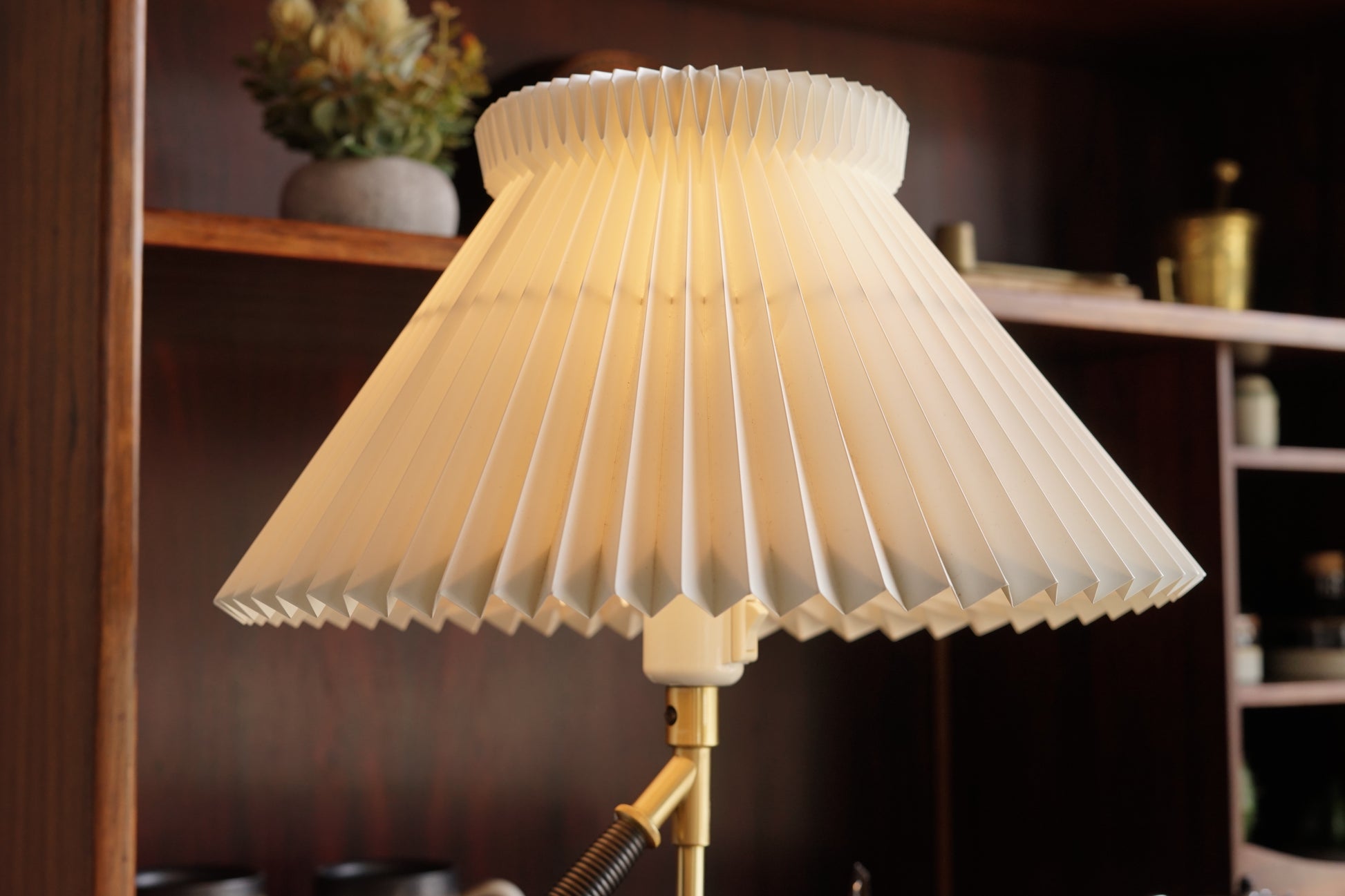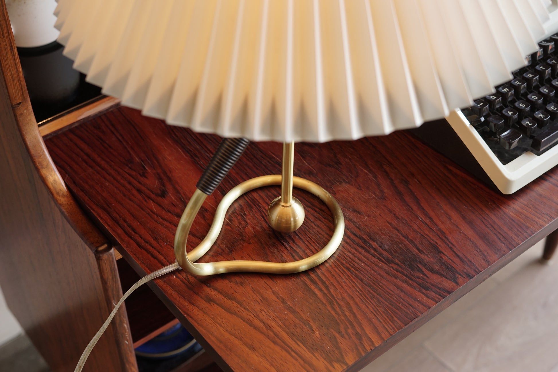 燈身為黃銅結構,底部是一圈橢圓形金屬環與小圓球平衡重,側邊有一段包覆深色皮革的把手,視覺上像一支優雅的提把。立桿上方接著白色摺疊燈罩支架,搭配手工摺疊的 Le Klint 百褶燈罩,光線從紙縐摺間均勻透出,亮度柔和又有層次。