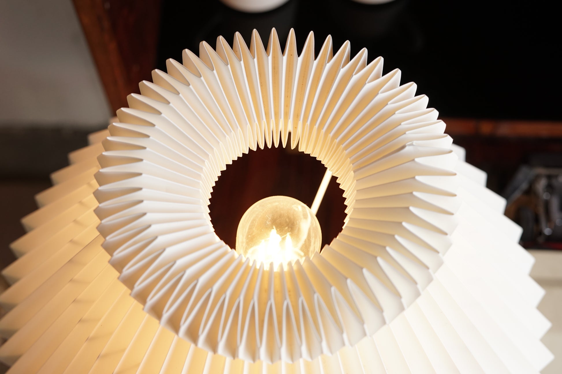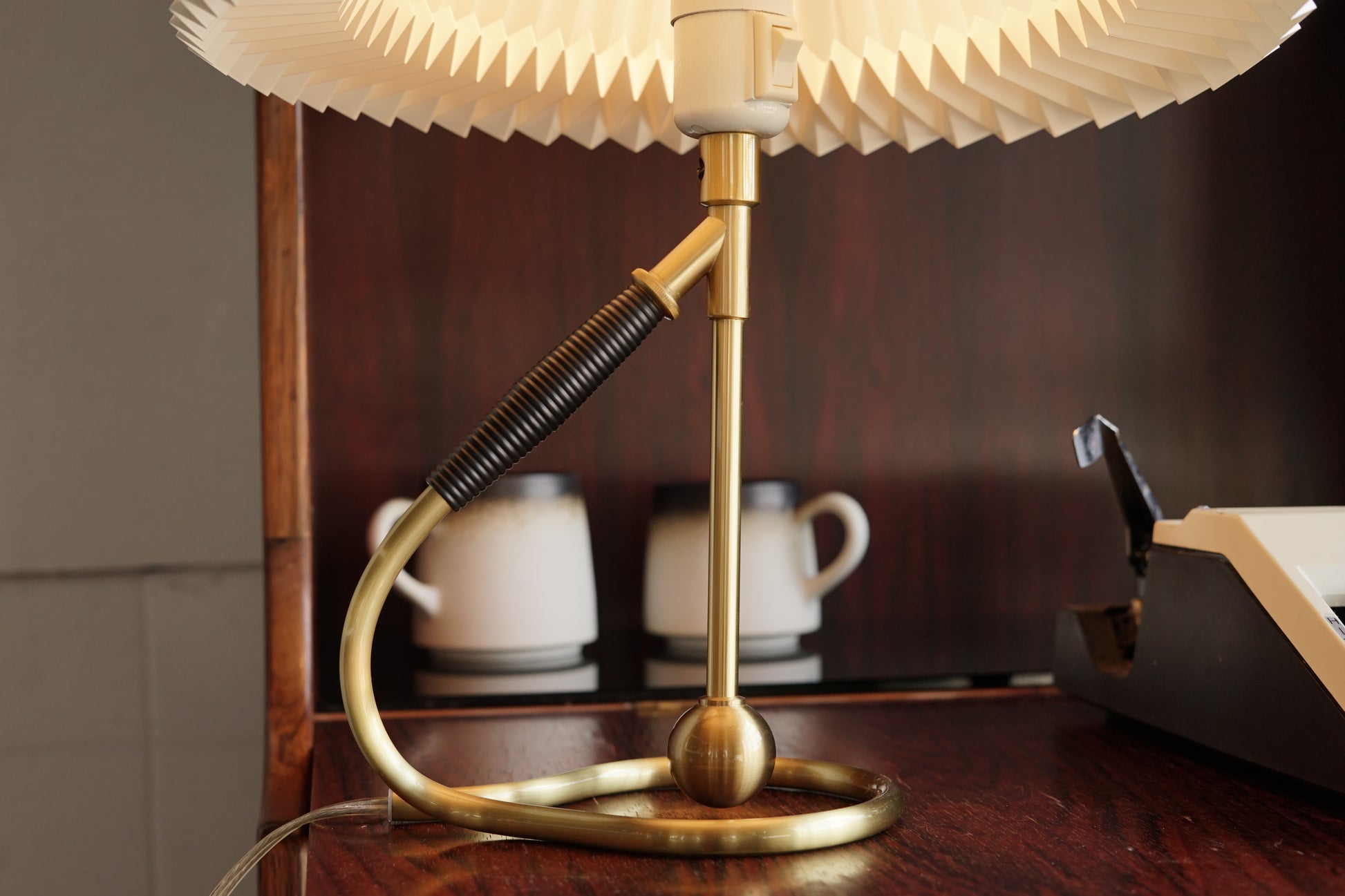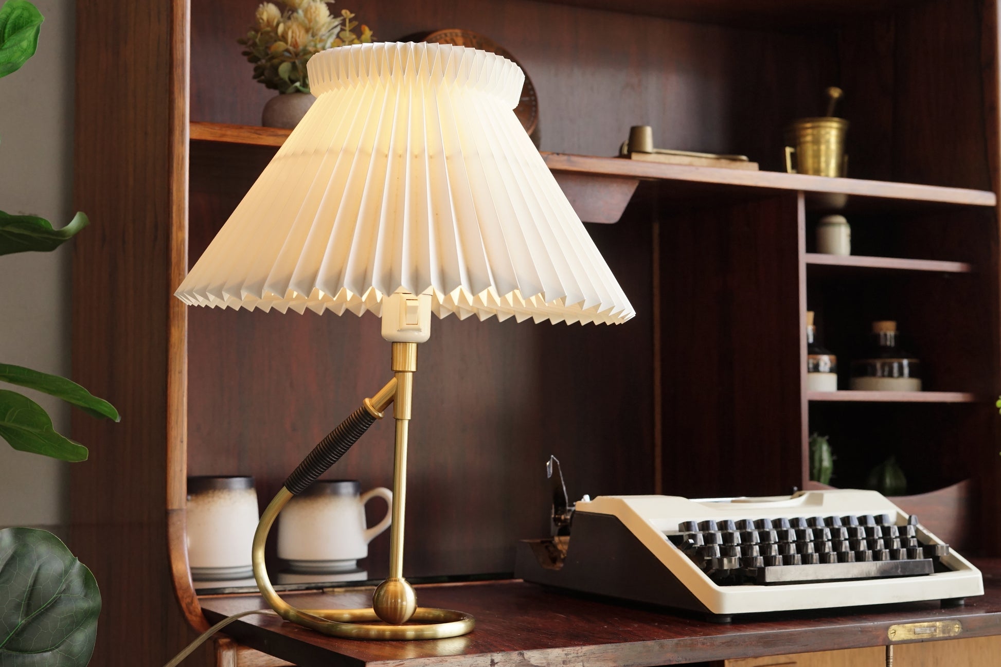 燈身為黃銅結構,底部是一圈橢圓形金屬環與小圓球平衡重,側邊有一段包覆深色皮革的把手,視覺上像一支優雅的提把。立桿上方接著白色摺疊燈罩支架,搭配手工摺疊的 Le Klint 百褶燈罩,光線從紙縐摺間均勻透出,亮度柔和又有層次。