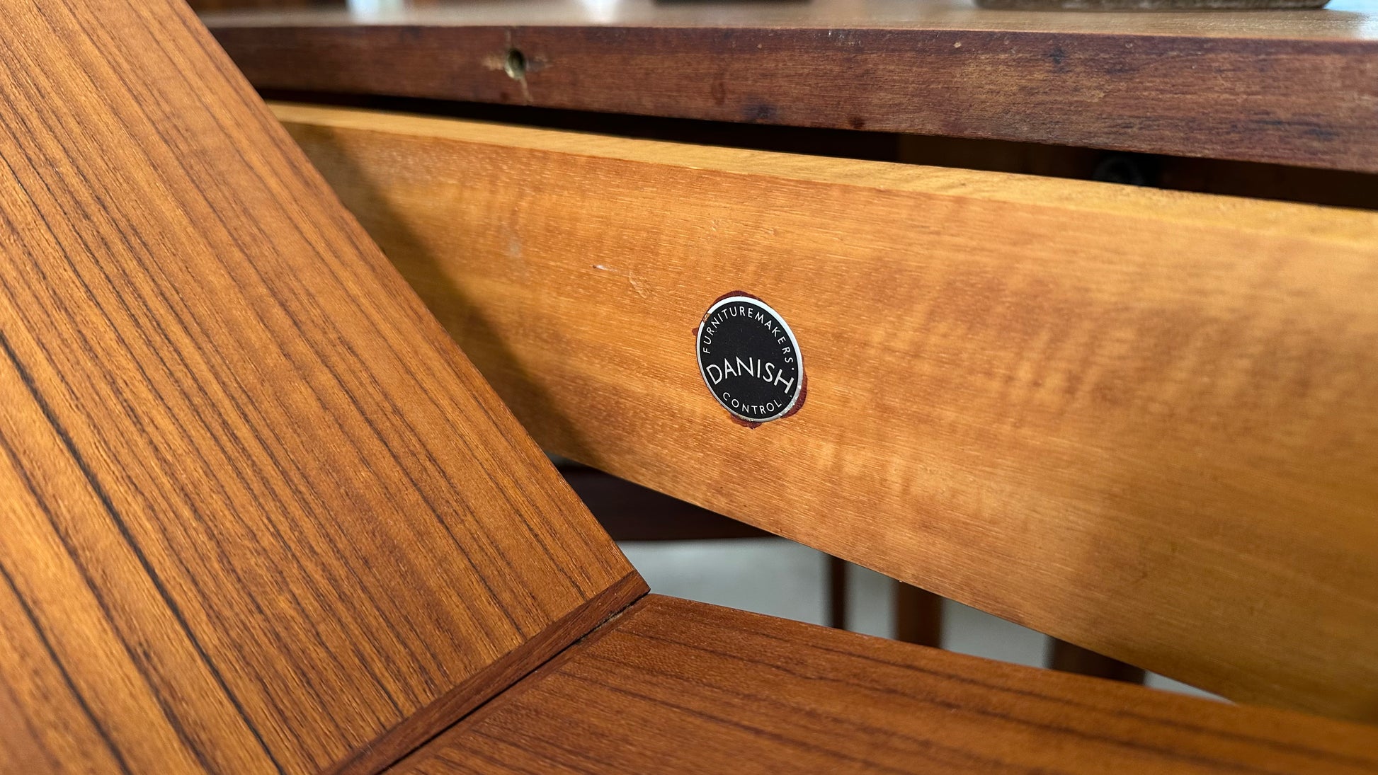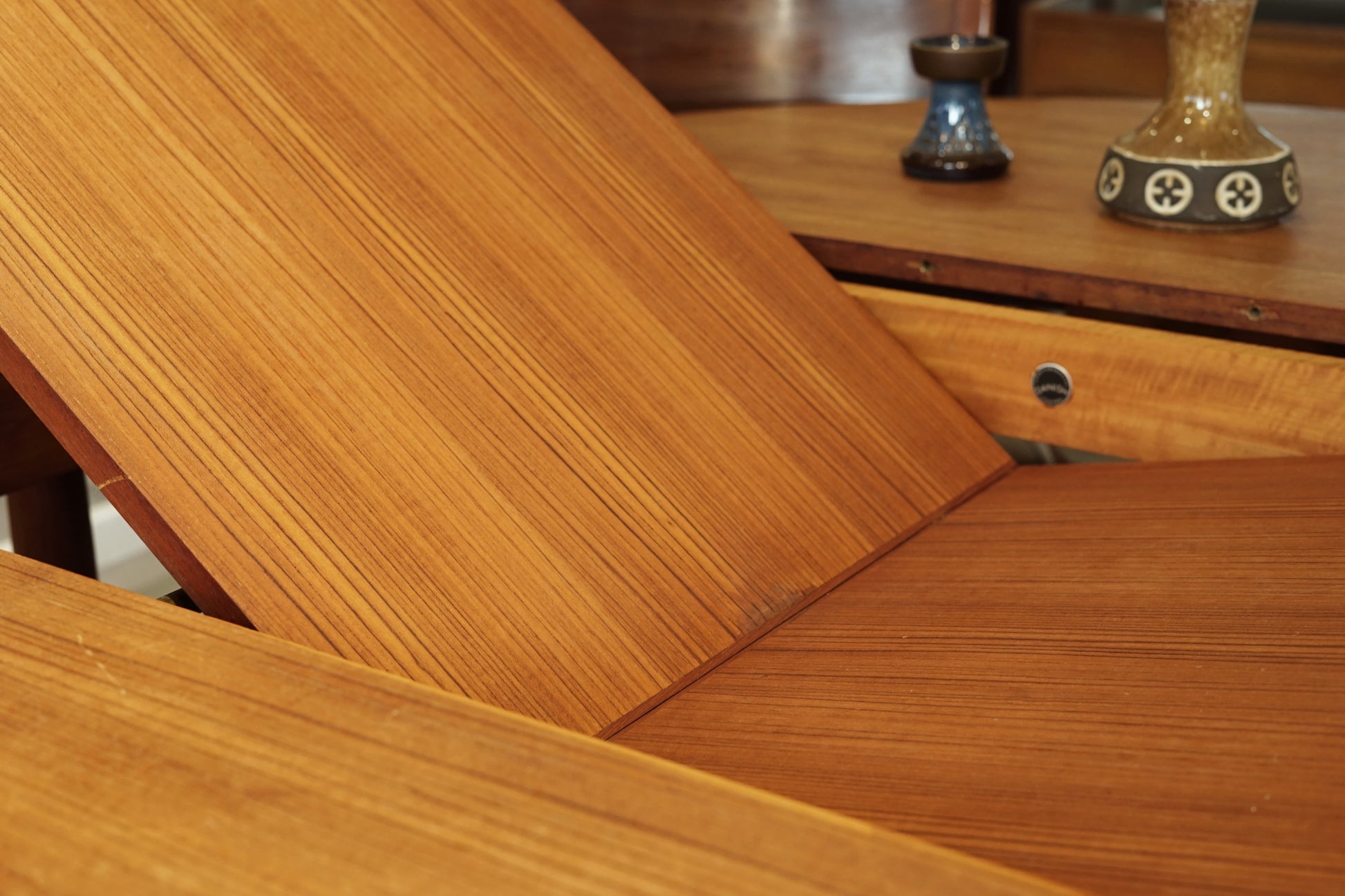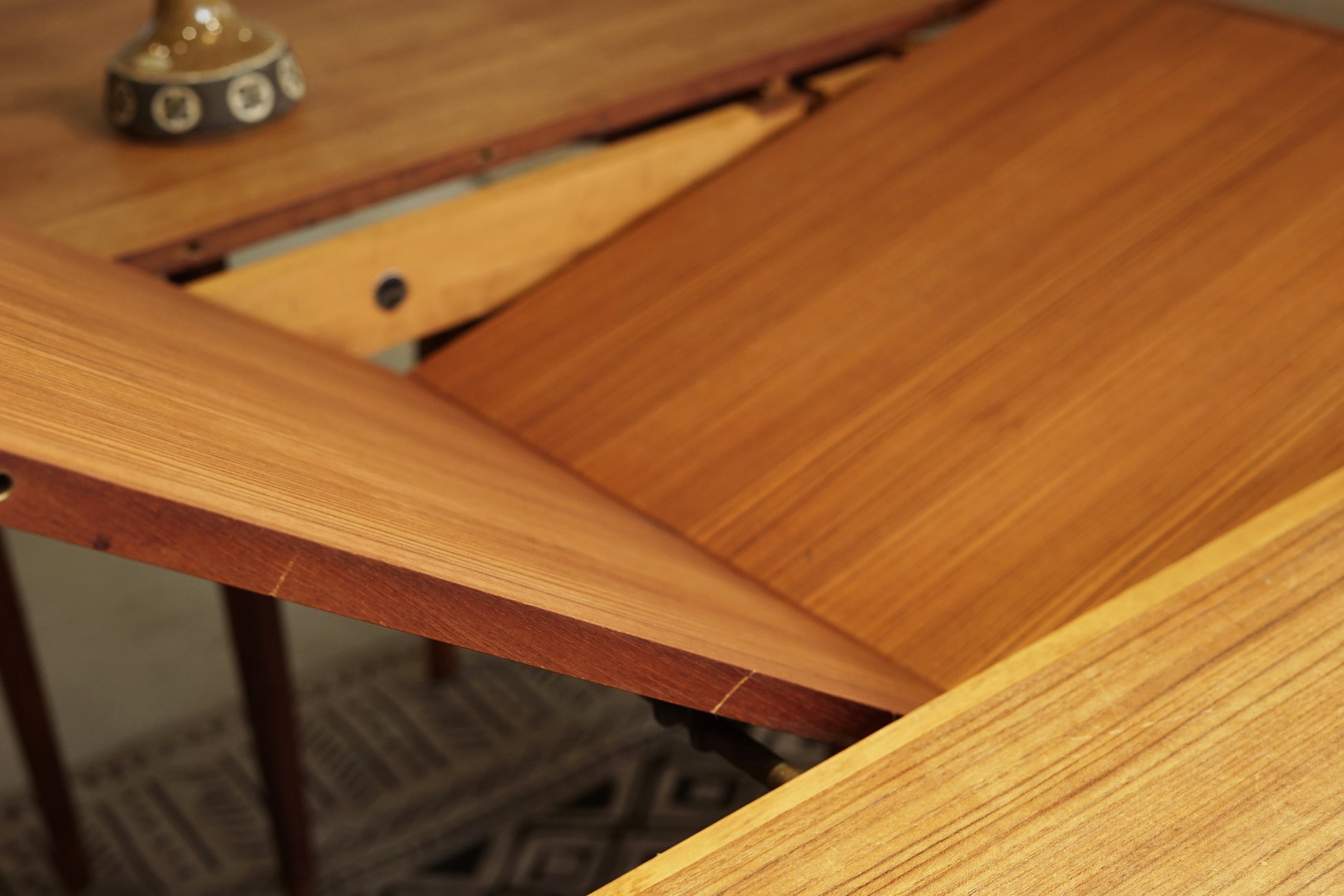 桌面以細緻的柚木紋理展現自然的溫潤質感,細緻的拼接展現丹麥工藝精神,桌腳與桌面的銜接處,線條優雅且結構穩定,桌面延伸過程順暢,展現出對工藝與結構的高度掌握。